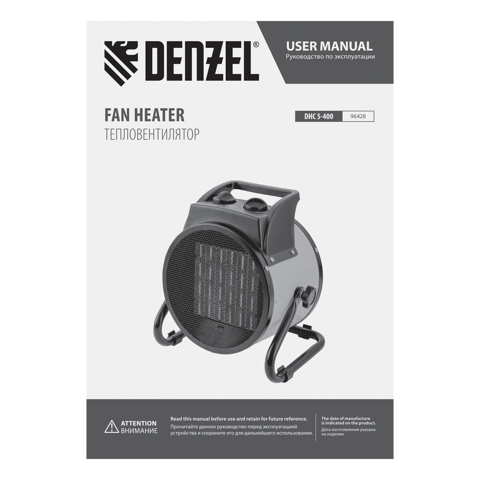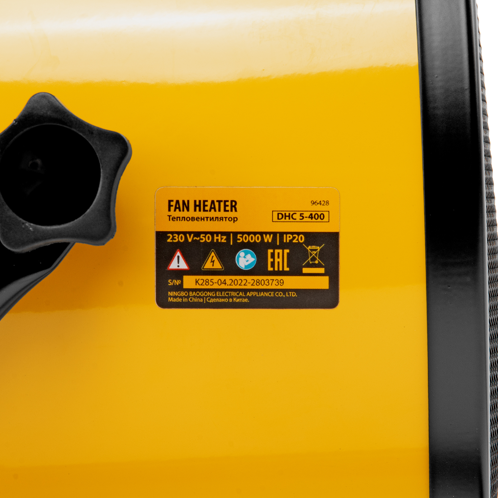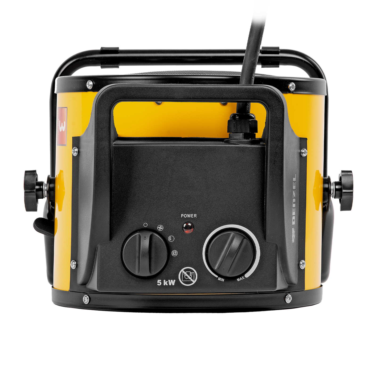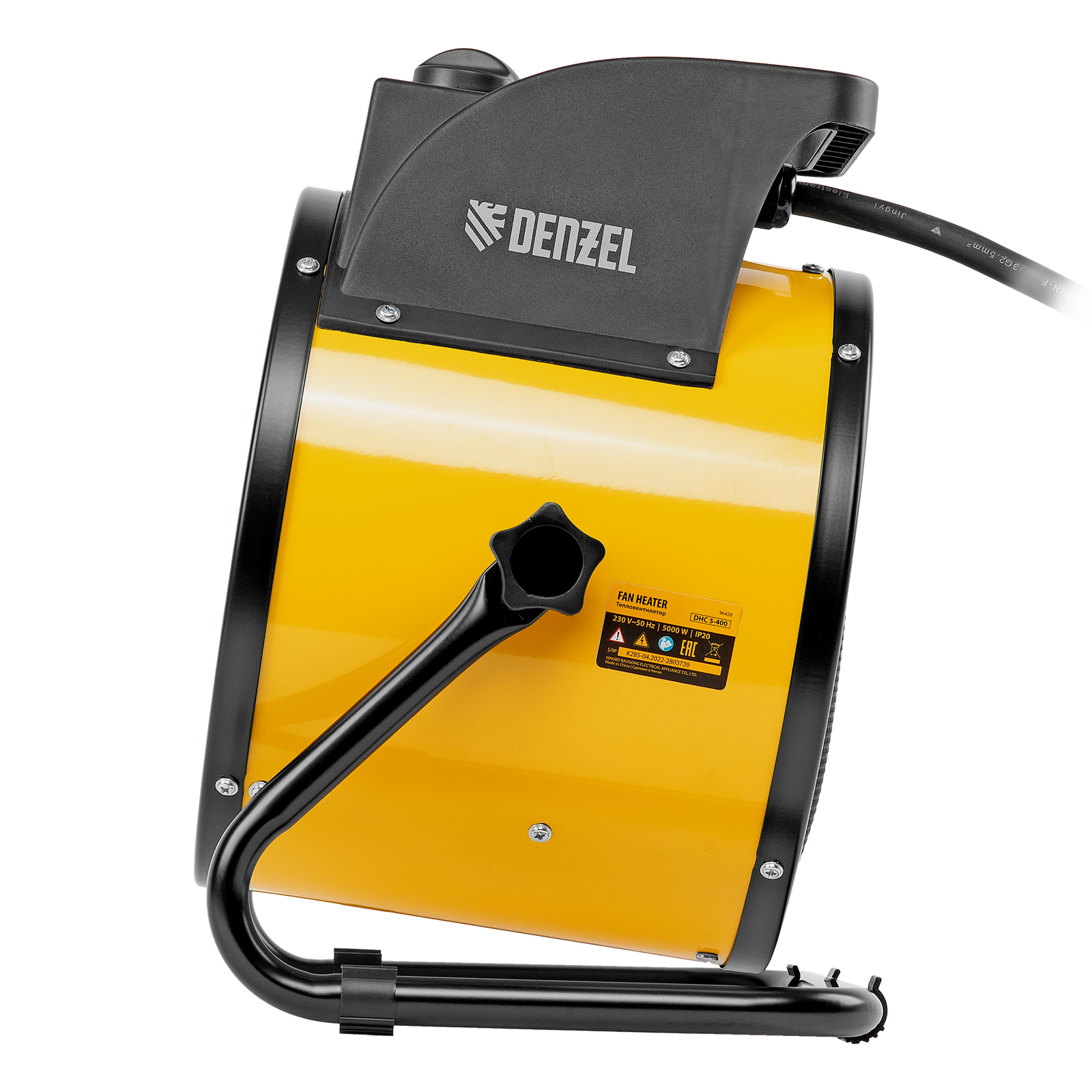 Тепловая пушка (тепловентилятор) Denzel DHC 5-400 96428 с керамическим нагревательным элементом работает на мощности 0,04/3/5 кВт. Пригодится в любую погоду: в холод обогреет помещение, в теплое время года может использоваться как вентилятор. Также пушка применяется во время отделочных работ для просушки поверхностей — окрашенных и оштукатуренных стен, стяжек и т.д. Максимальной мощности 5 кВт хватит для обогрева помещения площадью до 50 кв.м. Работа тепловентилятора не доставляет дискомфорт, безопасна для здоровья людей и животных, поскольку керамический нагревательный элемент не сушит воздух и не выделяет вредных веществ.,Внимание! Тепловая пушка поставляется с установленным кабелем питания и силовой вилкой 230 В / 32 А, для подключения используется силовая розетка 230 В / 32 А (обычные бытовые розетки не рассчитаны на мощность 5 кВт).