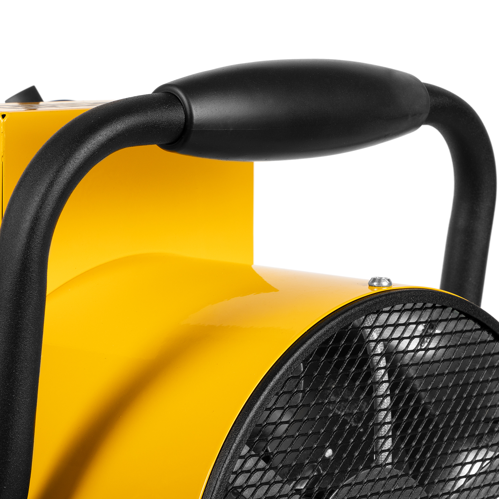 Тепловая пушка профессиональной серии Denzel SFH-5000 96438 питается от сети 230 В и генерирует воздушный поток мощностью 260 м³/ч. Работает в одном из 3 режимов: вентилятор, обогрев на мощности 2250 и обогрев на мощности 4500 Вт. Используется в складских, производственных, общественных помещениях площадью до 45 м². Подходит для дистанционной просушки поверхностей, например, окрашенных или оштукатуренных стен во время отделочных работ.