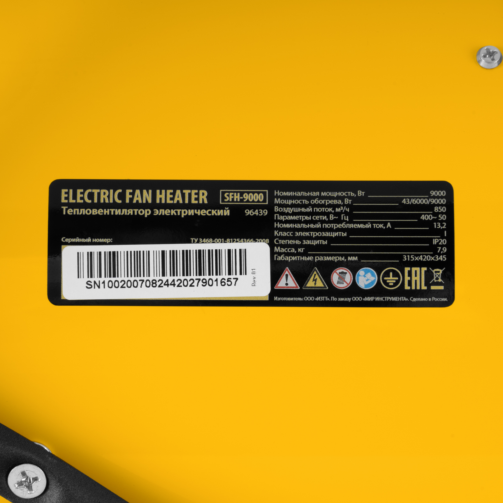 3 режима работы — вентиляция (без обогрева), обогрев 6000 Вт и обогрев 9000 Вт — позволяют настроить работу тепловой пушки под разные задачи.