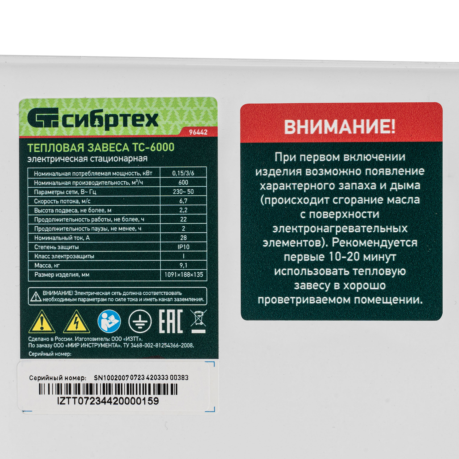 Электрическая тепловая завеса (тепловентилятор) Сибртех ТС-6000 96442 работает в 3 режимах: обдув без нагрева, обогрев на мощности 3000 и 6000 Вт. Создает узконаправленный воздушный поток, позволяющий разделить различные климатические зоны, например, отделить воздух в помещении от воздуха снаружи. Устанавливается над оконными или дверными проемами, расход воздуха составляет 600 м3/ч. Питается от сети 220 В, поэтому подходит для домашнего применения. Игольчатый нагревательный элемент (ститч) обеспечивает быстрый разогрев до заданной температуры. Рекомендуемая площадь обогрева составляет 60 м2.
