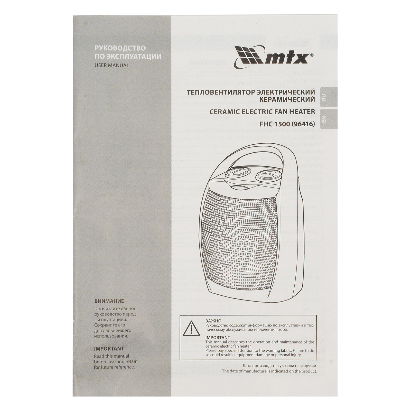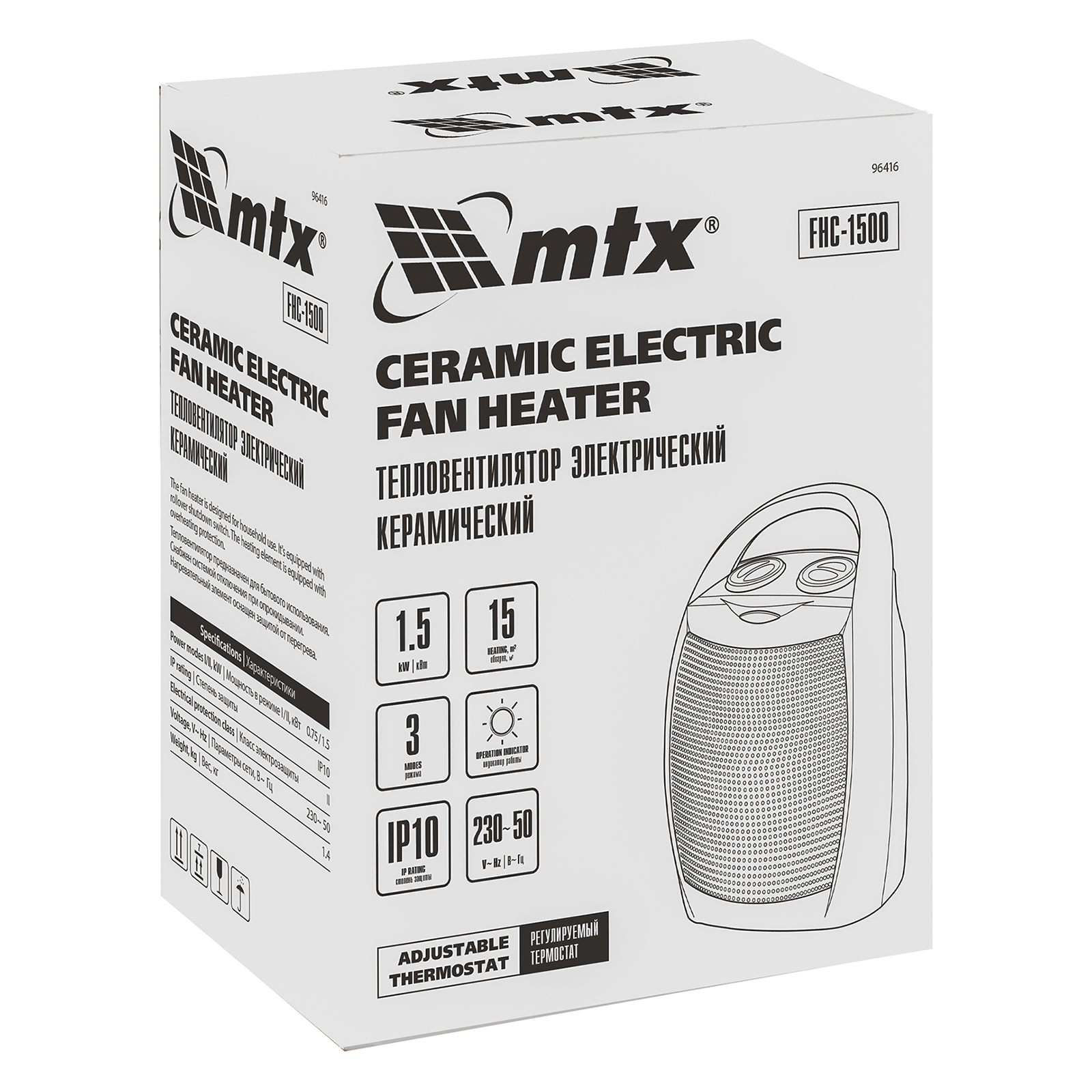 Тепловентилятор MTX FHC-1500 96416 работает в одном из трех режимов работы: вентиляция без нагрева, нагрев на мощности 750 Вт и 1500 Вт. Используется для обогрева комнат площадью до 20 кв. м на даче или в квартире. Тепловентилятор поддерживает необходимую температуру в холодную погоду и обеспечивает вентиляцию помещения в жару. Благодаря керамическому нагревательному элементу устройство не сжигает пыль, не выделяет вредных веществ и не сушит воздух, а также отличается повышенной пожаробезопасностью.