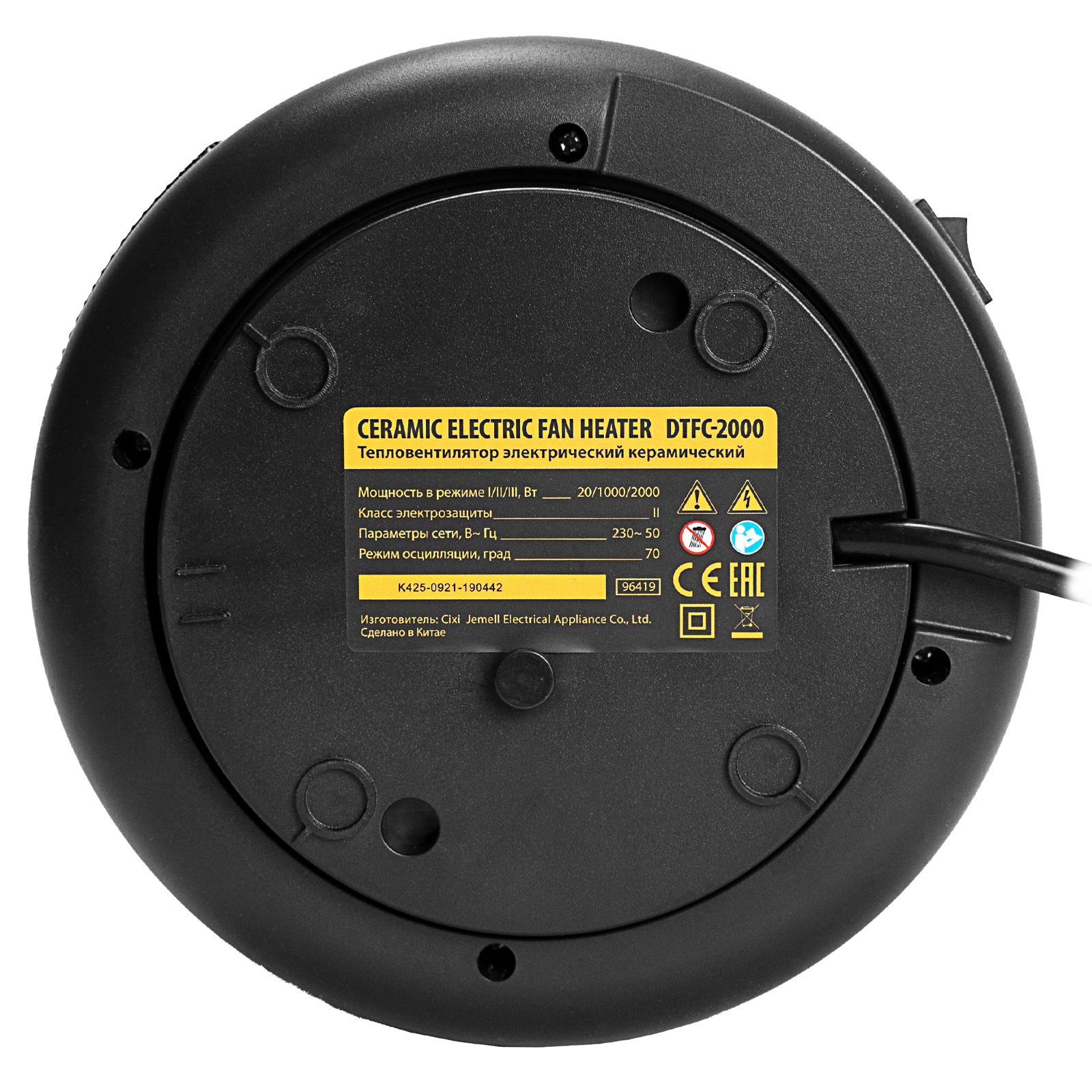 - Защита при опрокидывании — в нижней части корпуса находится специальная кнопка, которая срабатывает при падении и выключает тепловентилятор.