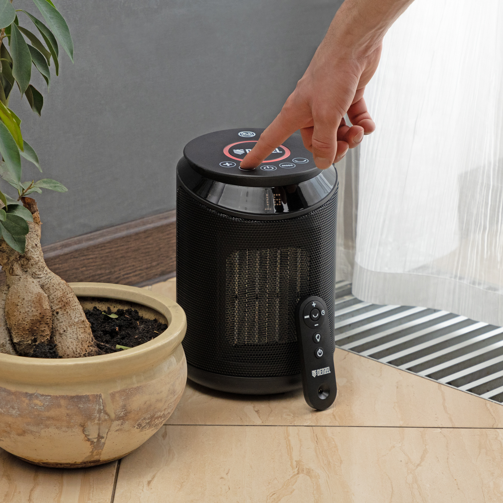 - Керамический нагревательный элемент — тепловентилятор не выделяет вредных веществ, не сушит воздух и не сжигает пыль.