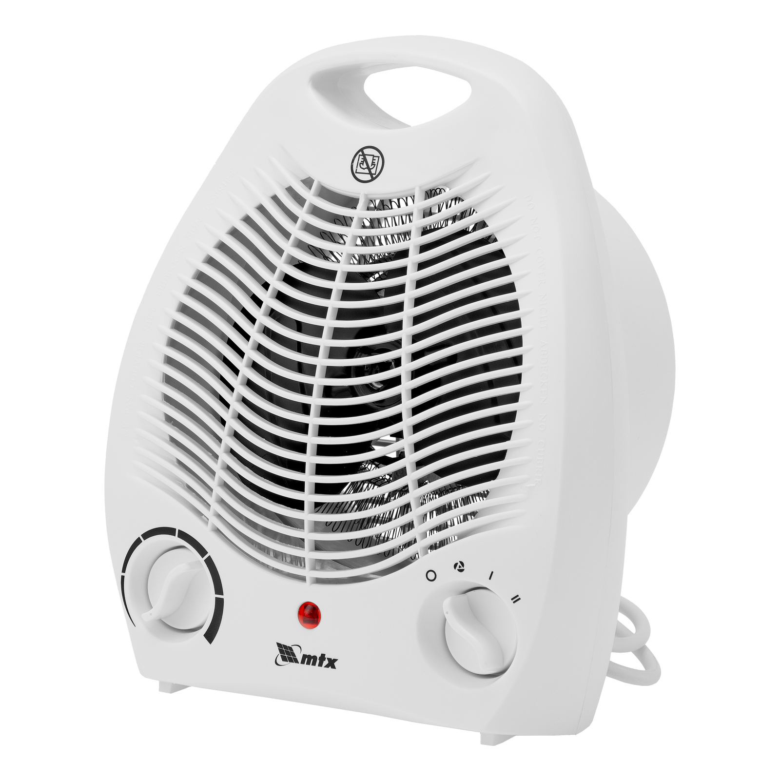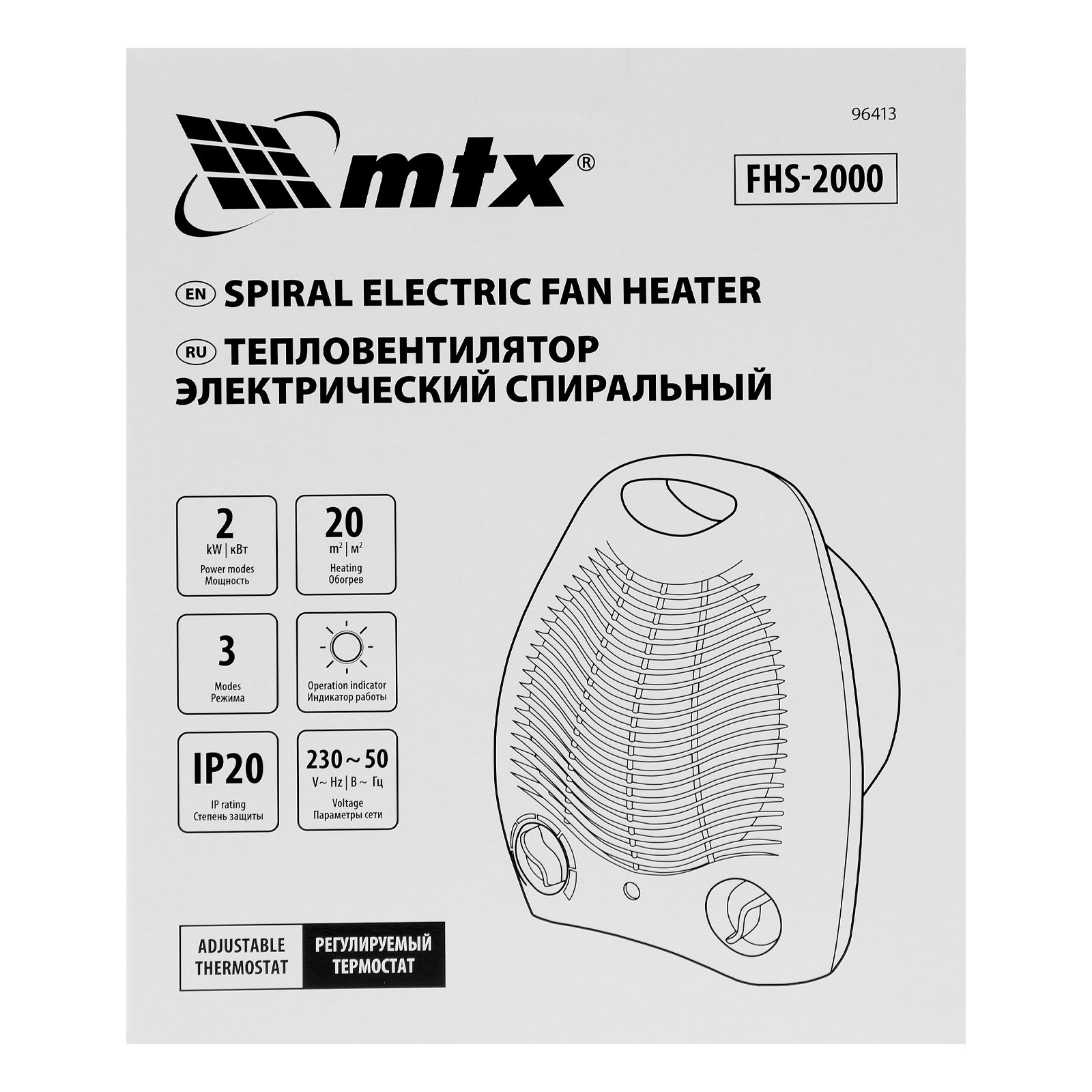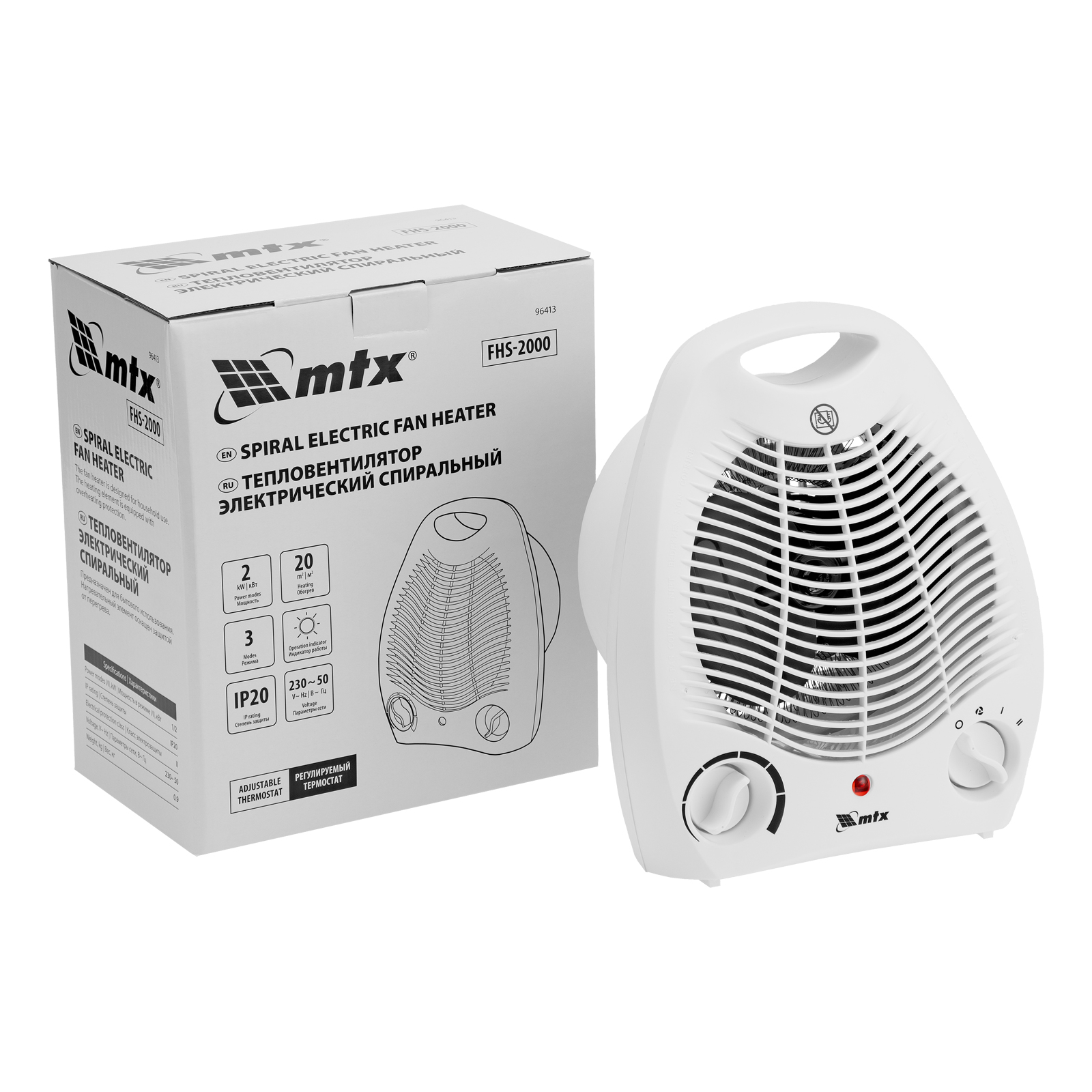 Электрический тепловентилятор MTX FHS-2000 96413 мощностью 1000/2000 Вт, с нагревателем спирального типа и вентилятором, имеет 3 режима работы и используется для обогрева комнат площадью до 20 кв. м в квартире или на даче. Его можно применять для поддержания необходимой температуры в помещении в холодную погоду, а также для вентиляции в жару. Устройство устанавливают на полу или на столе, управление осуществляется при помощи 2 механических переключателей.