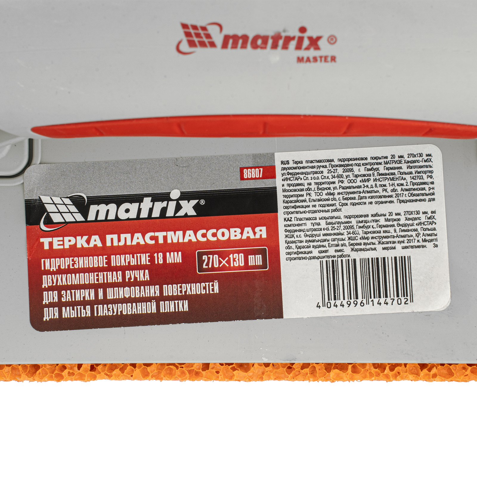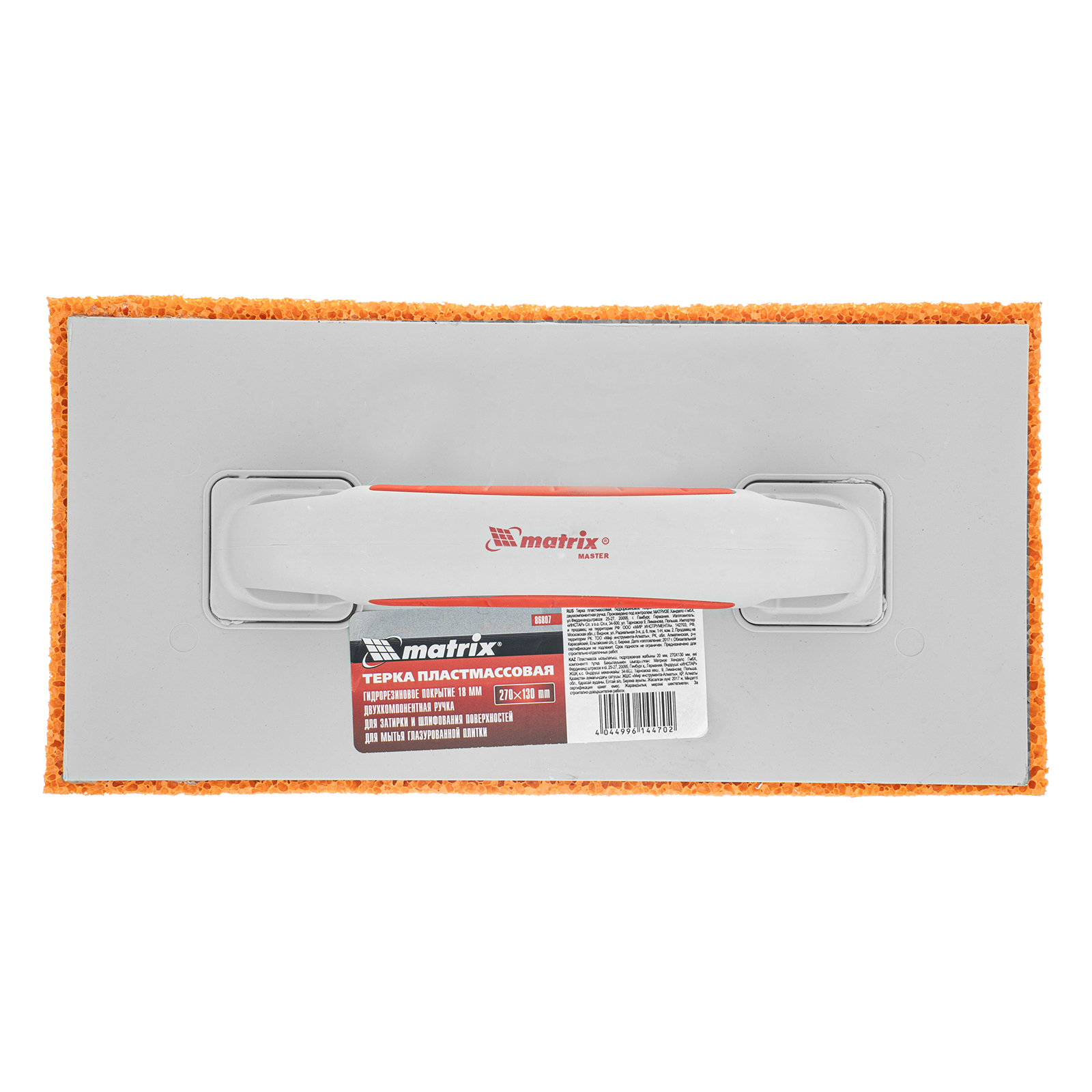 Пластмассовая терка Matrix 86807, 270 х 130 мм, с гидрорезиновым покрытием высотой 18 мм, с двухкомпонентной ручкой, — инструмент для очищения плитки после нанесения затирки, а также для размачивания верхнего слоя гипсовой штукатурки перед шпаклеванием. Плотное гидрорезиновое покрытие позволяет устранить все дефекты и добиться максимальной гладкости поверхности.