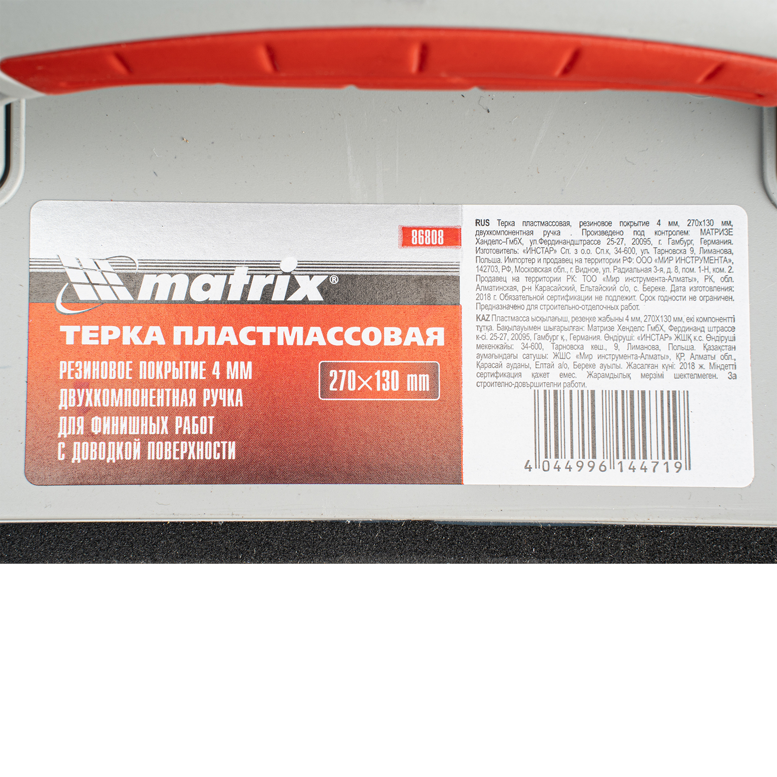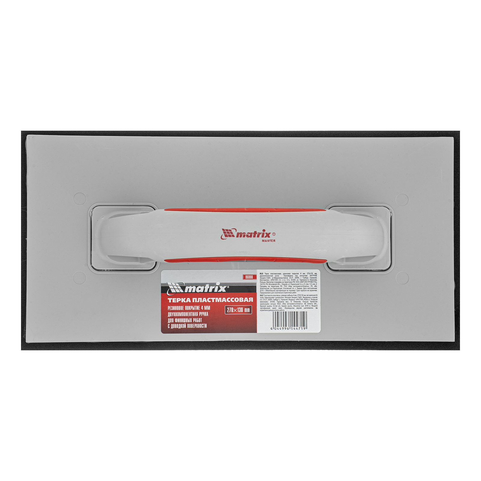 Пластмассовая терка Matrix 86808 размером 270 х 130 мм, с резиновым покрытием высотой 4 мм и двухкомпонентной рукояткой, — инструмент для затирки швов после укладки плитки. Также используется для выравнивания нанесенного штукатурного слоя во время отделочных работ.