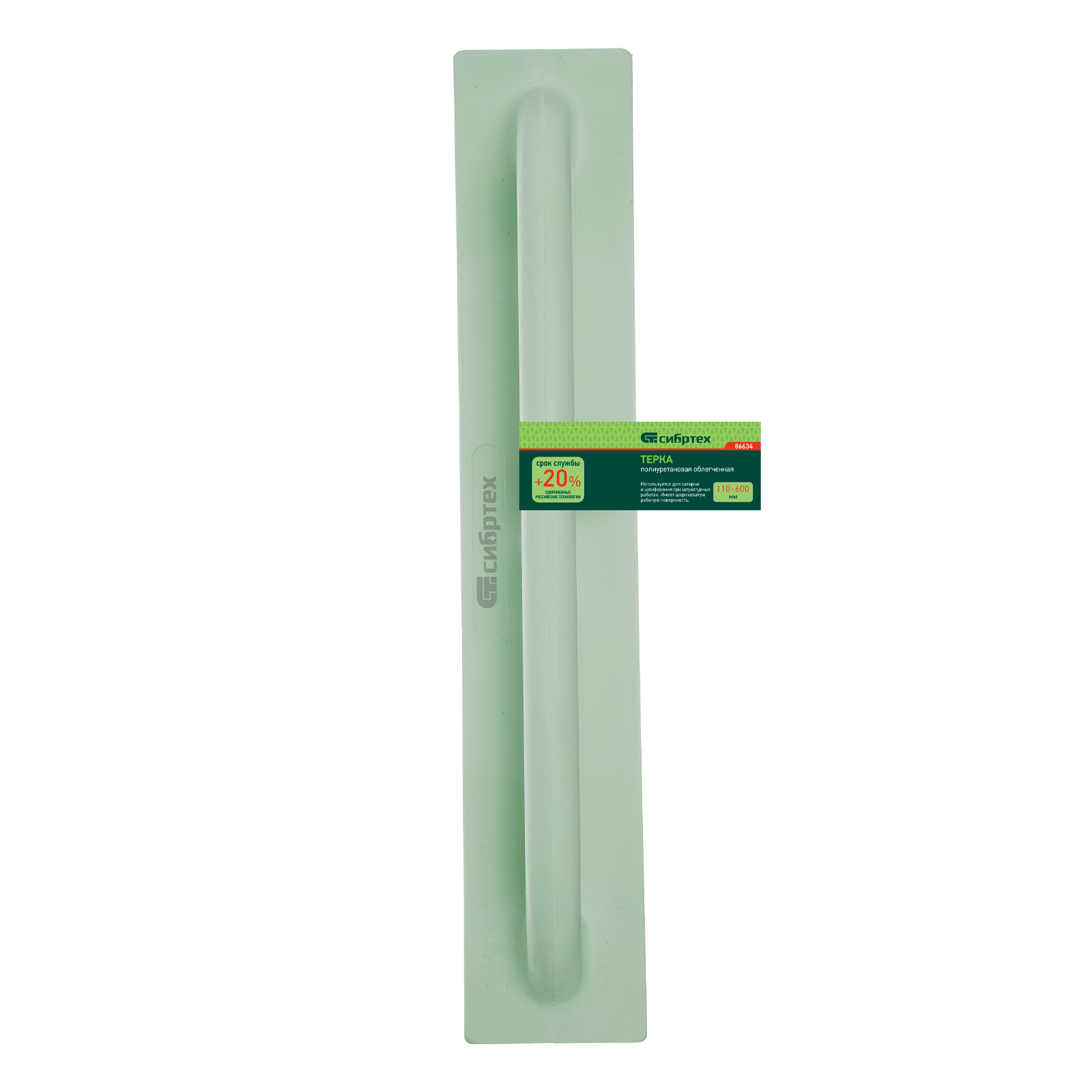 Облегченная полиуретановая терка Сибртех 86634 размером 110 х 600 мм применяется во время отделочных работ. Специальные навыки для ее использования не требуются. Шероховатая подошва терки эффективно выравнивает поверхность штукатурного слоя. Инструмент удобен для обработки открытых участков большой площади. Ее вес составляет 248 г, поэтому длительная работа с инструментом не вызывает усталость.