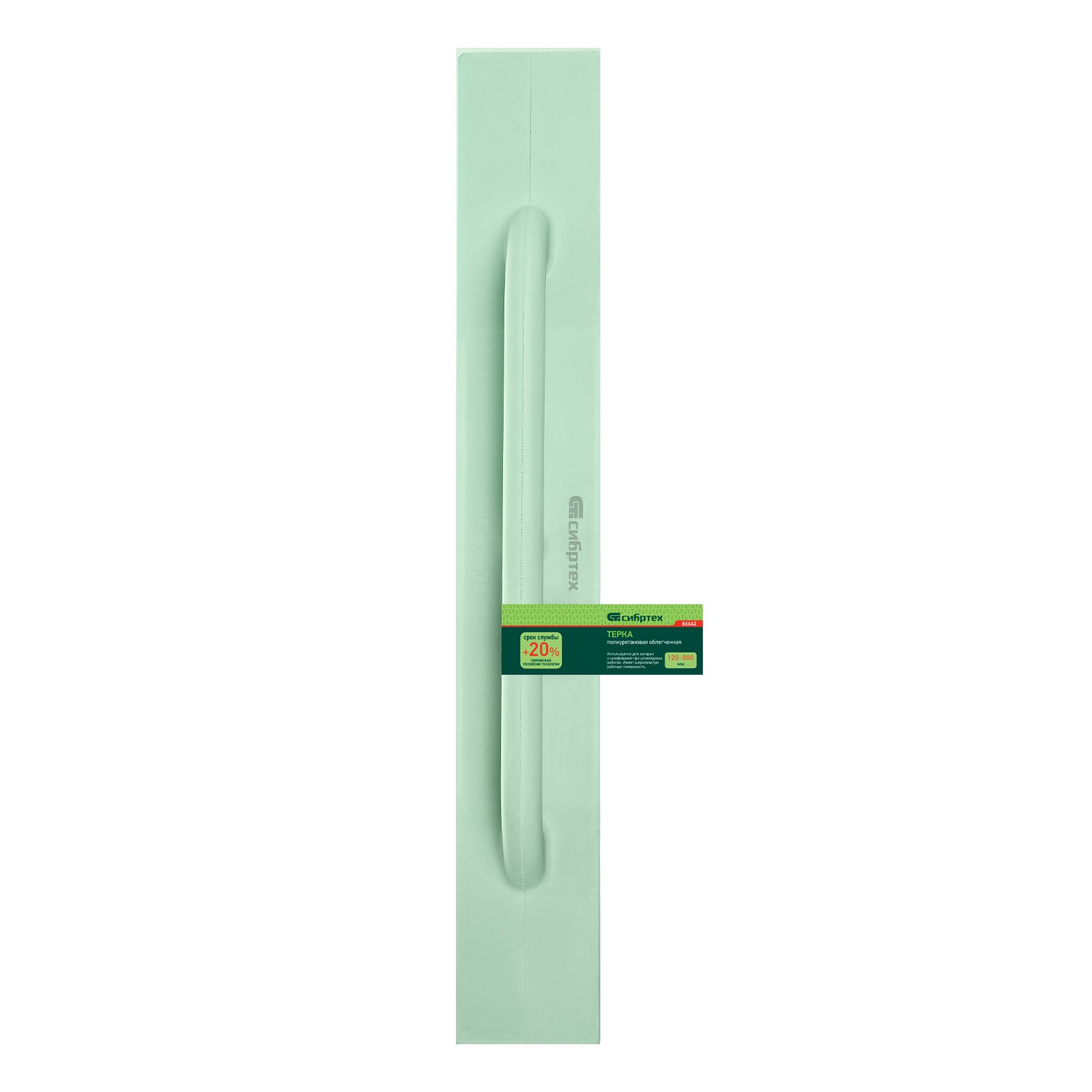 Облегченная полиуретановая терка Сибртех 86642 размером 120 х 800 мм применяется во время отделочных работ. Специальные навыки для ее использования не требуются. Шероховатая подошва терки эффективно выравнивает поверхность штукатурного слоя. Инструмент удобен для обработки открытых участков большой площади. Ее вес составляет 292 г, поэтому длительная работа с инструментом не вызывает усталость.
