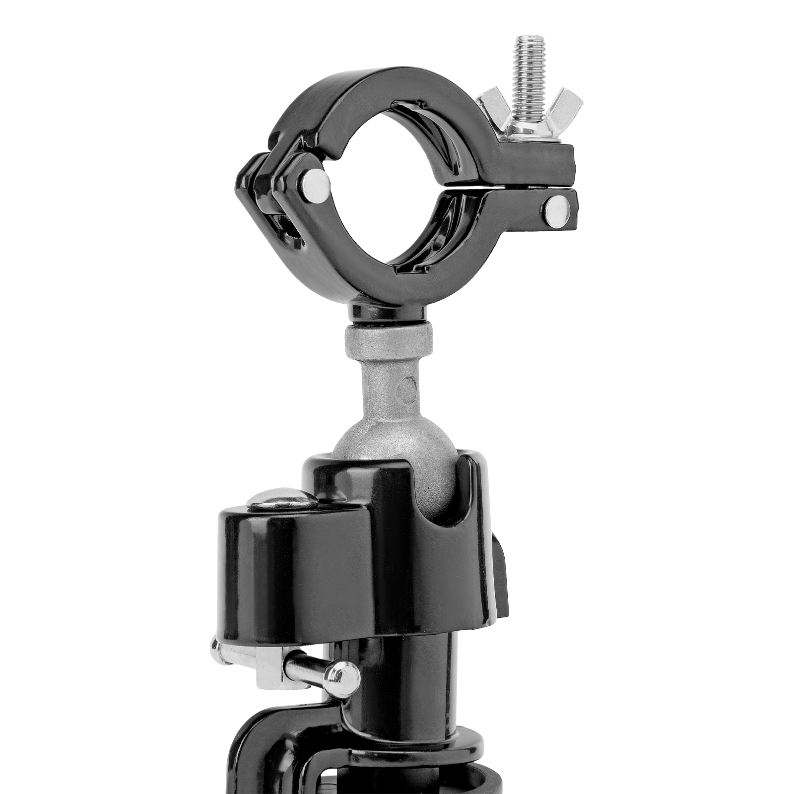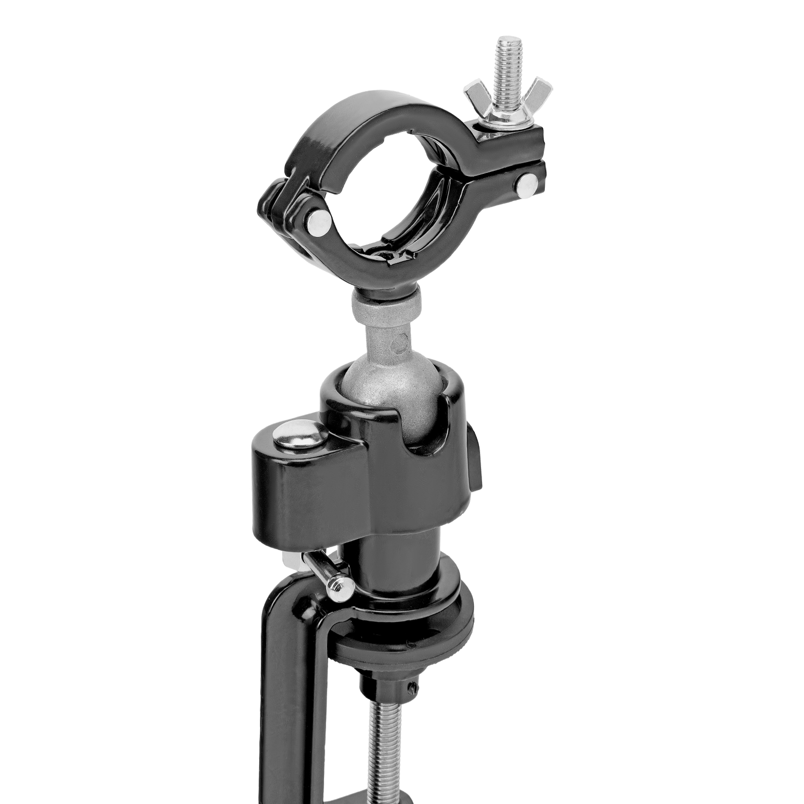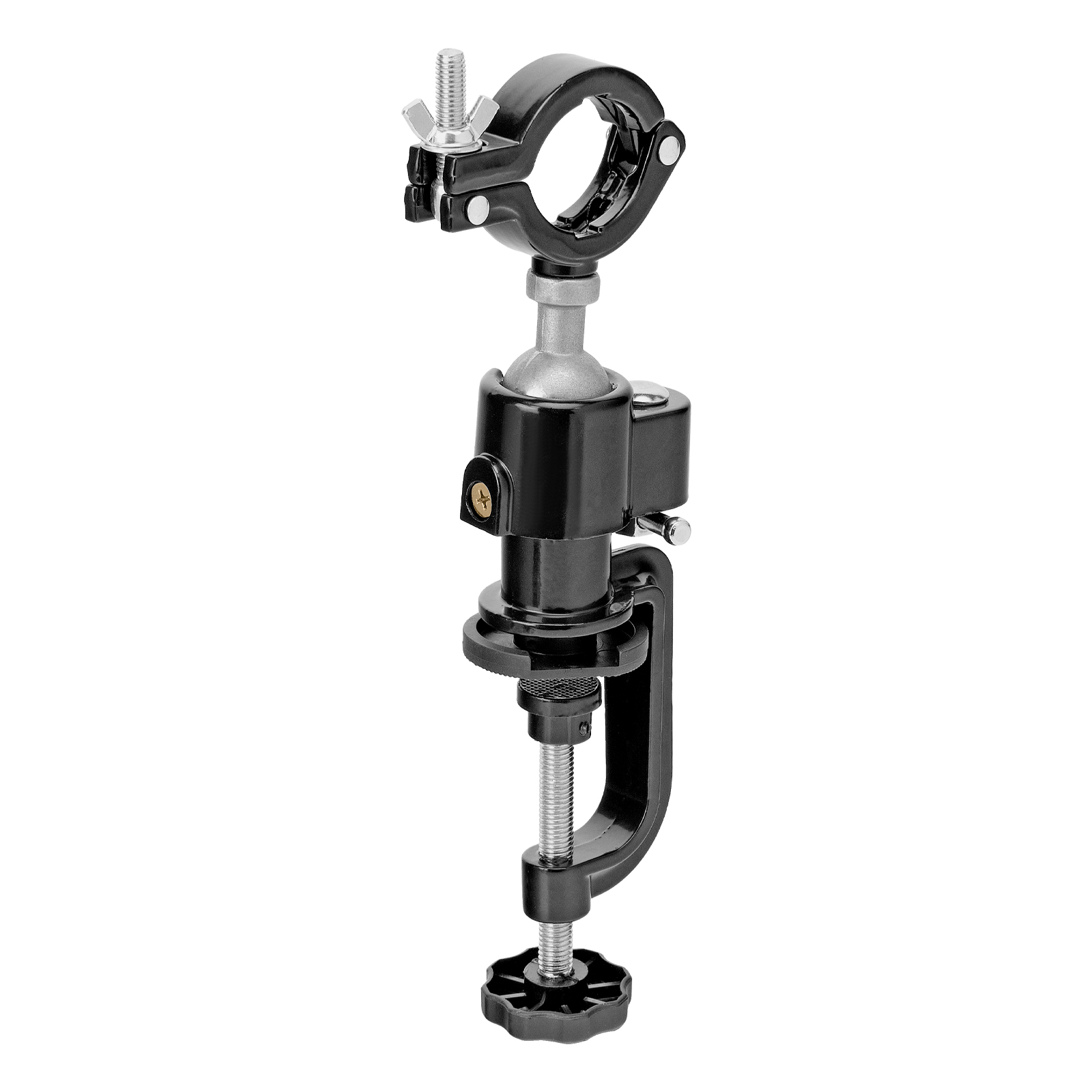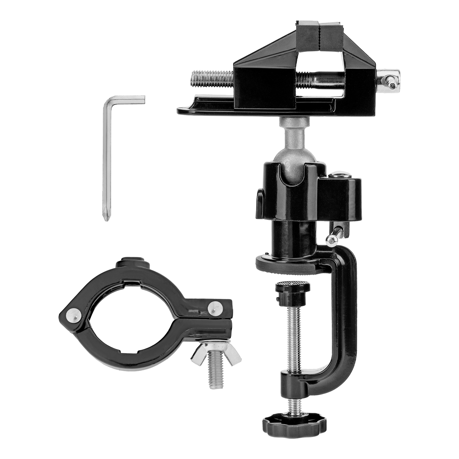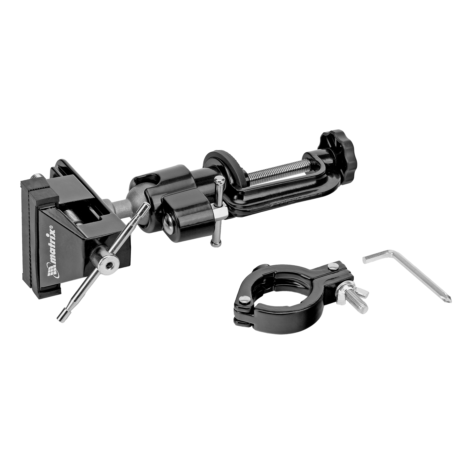 - Зажимной хомут позволяет зафиксировать дрель для удобства сверления деталей.