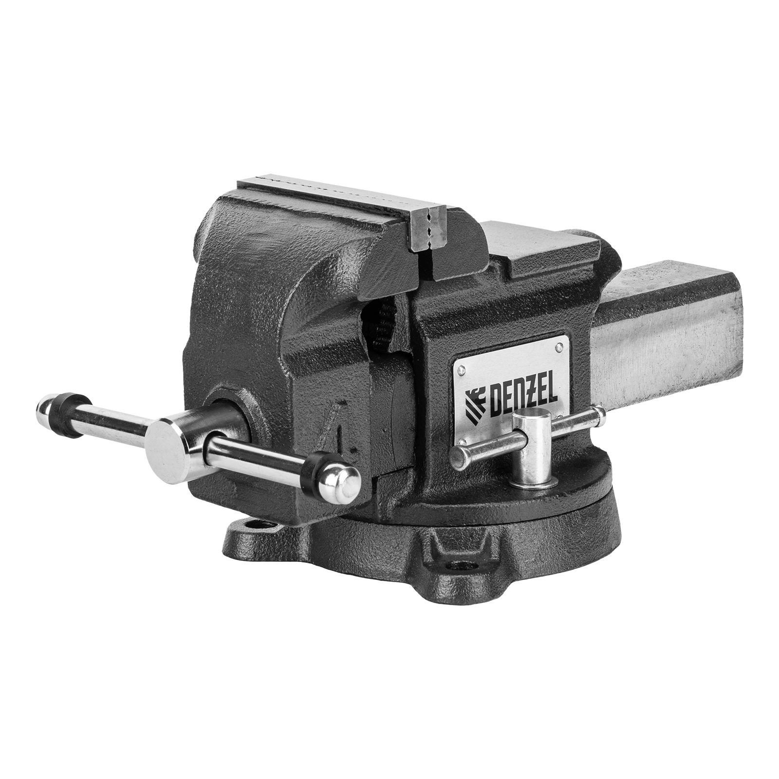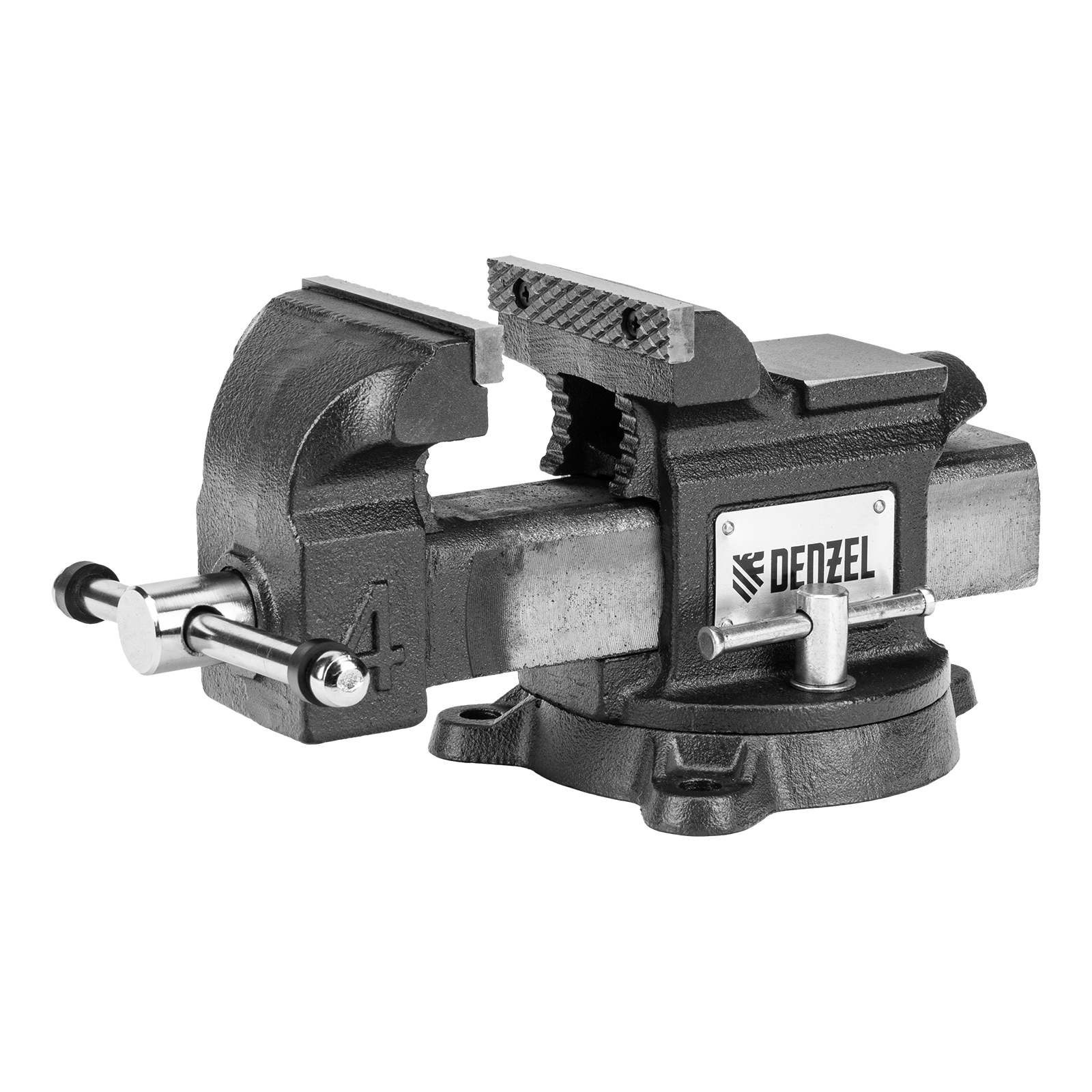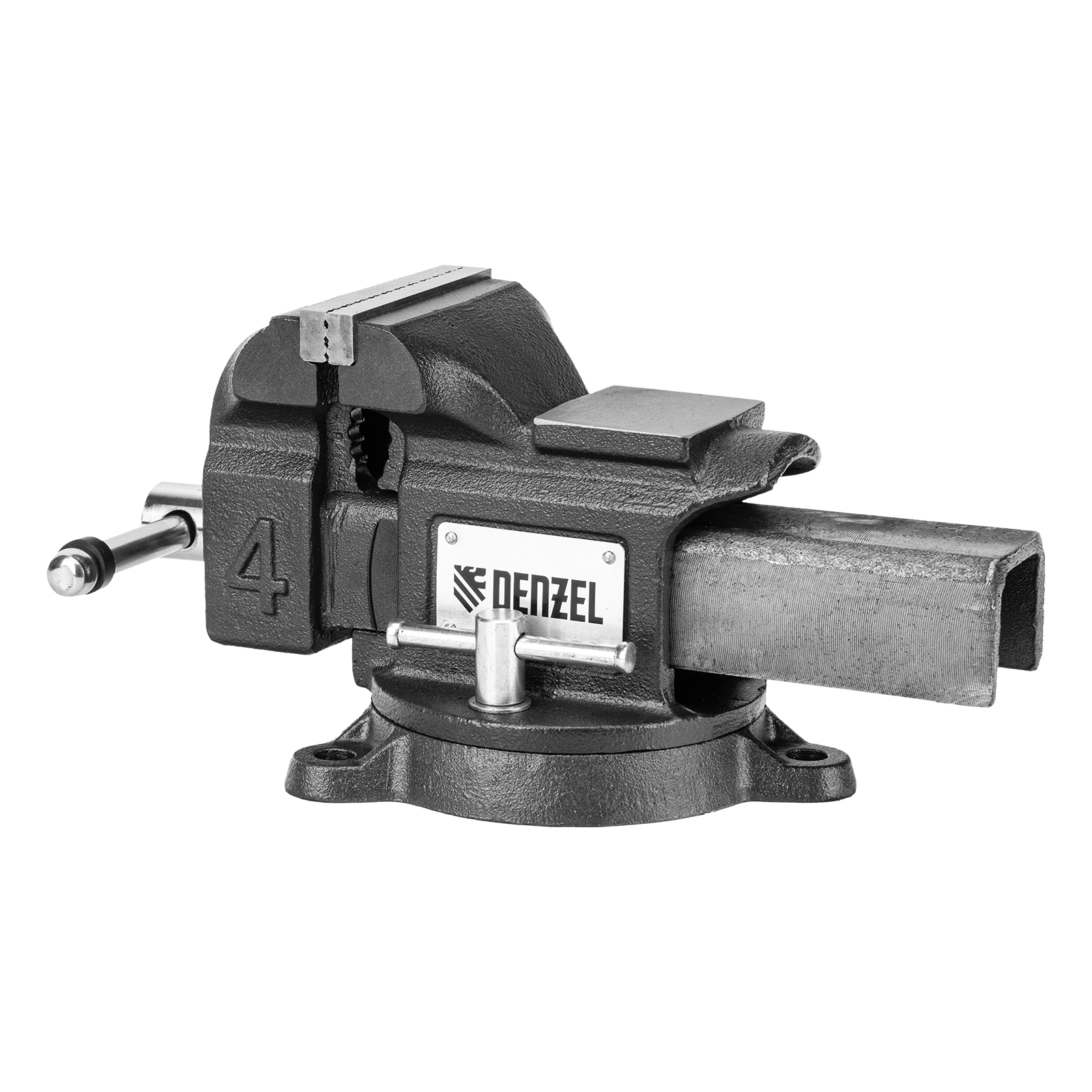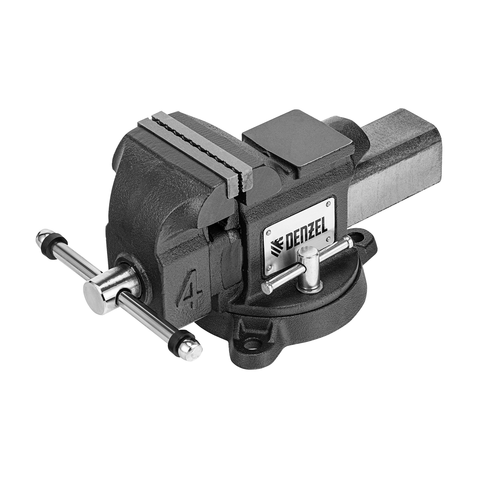Слесарные поворотные тиски Denzel BVH-100 18683 с губками шириной 100 мм и стальной направляющей предназначены для фиксации деталей и заготовок, а также для выполнения мелких ударных работ — в конструкции предусмотрена наковальня. Рабочий ход составляет 100 мм, глубина зажима — 60 мм. Специальный зажим позволяет фиксировать трубы диаметром 15-35 мм, что расширяет возможности использования инструмента. На губки можно установить защитные накладки (приобретаются отдельно) для предотвращения повреждения зажимаемых предметов. Тиски поставляются с болтами для фиксации на рабочем столе и запасными штифтами-предохранителями. Пригодятся в мастерской и гараже.