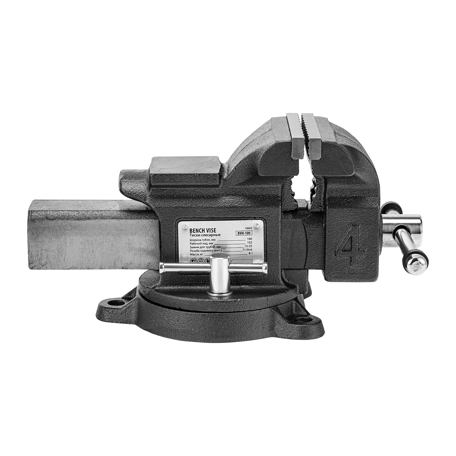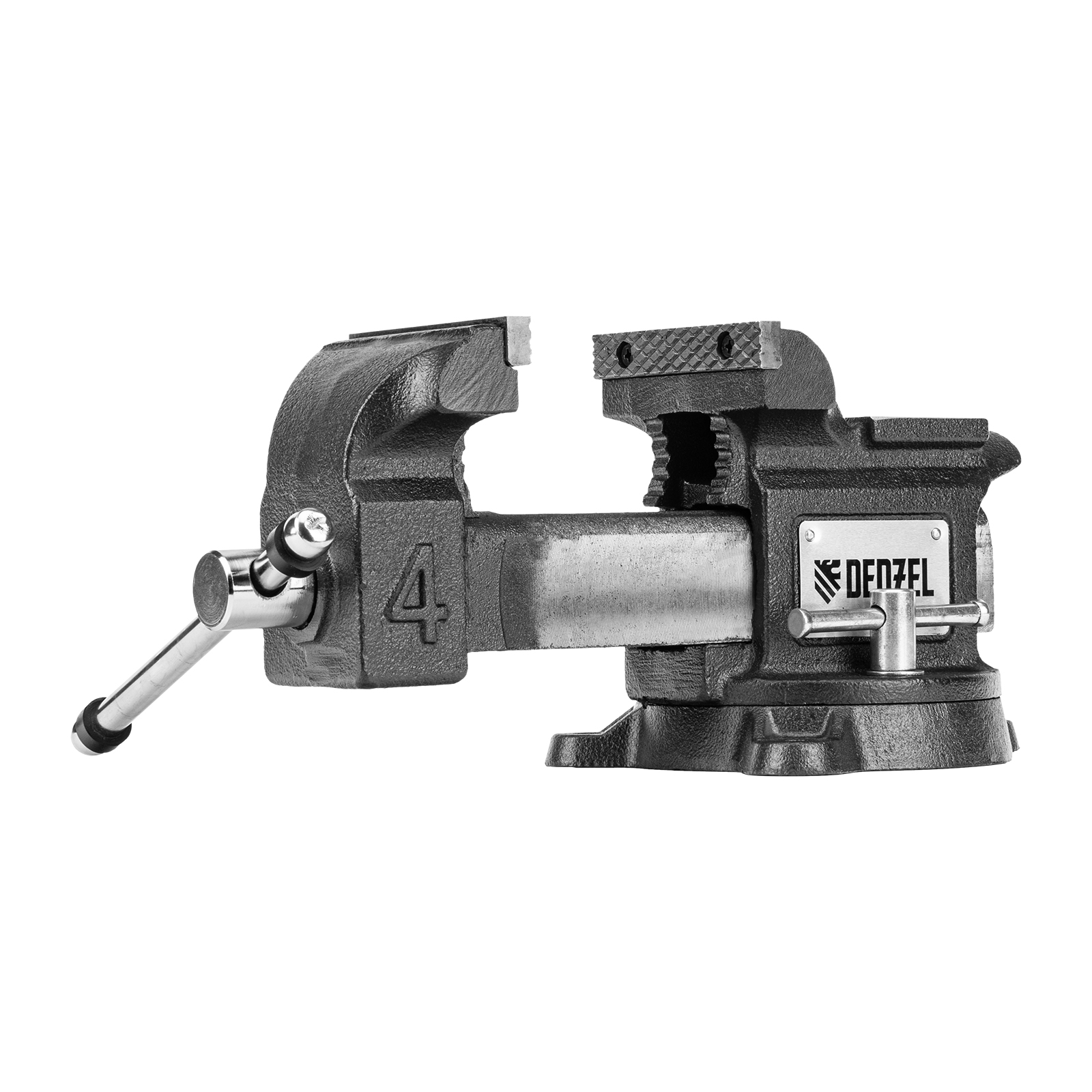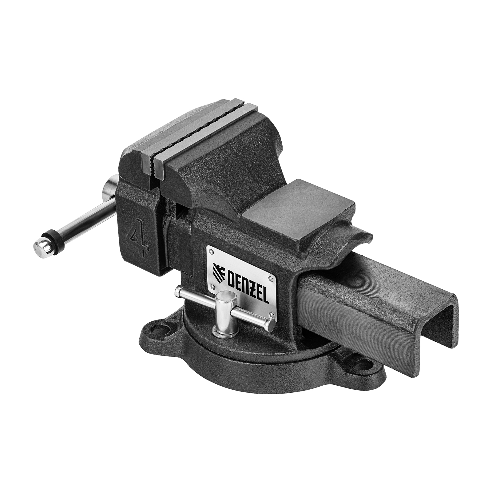 Слесарные поворотные тиски Denzel BVH-100 18683 с губками шириной 100 мм и стальной направляющей предназначены для фиксации деталей и заготовок, а также для выполнения мелких ударных работ — в конструкции предусмотрена наковальня. Рабочий ход составляет 100 мм, глубина зажима — 60 мм. Специальный зажим позволяет фиксировать трубы диаметром 15-35 мм, что расширяет возможности использования инструмента. На губки можно установить защитные накладки (приобретаются отдельно) для предотвращения повреждения зажимаемых предметов. Тиски поставляются с болтами для фиксации на рабочем столе и запасными штифтами-предохранителями. Пригодятся в мастерской и гараже.