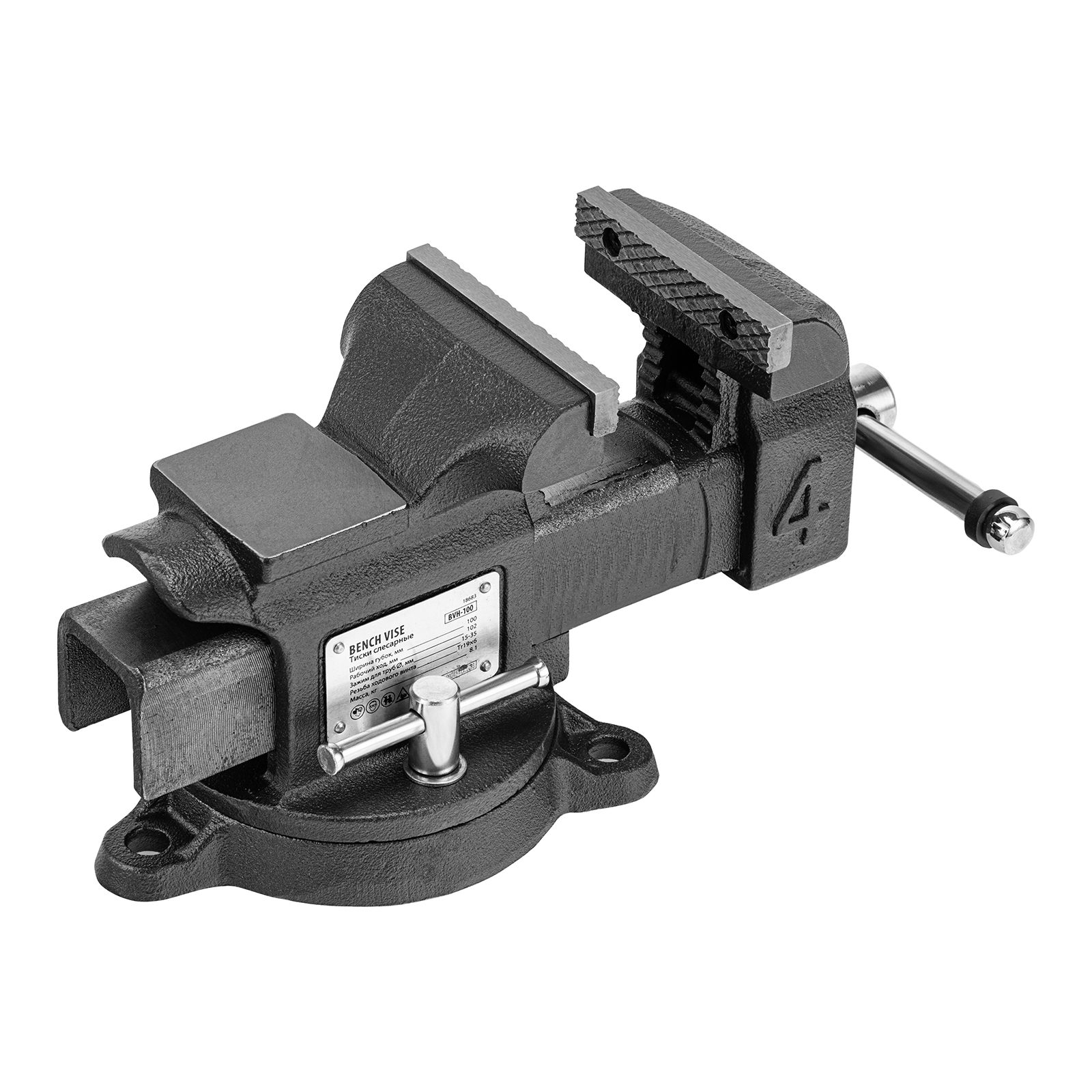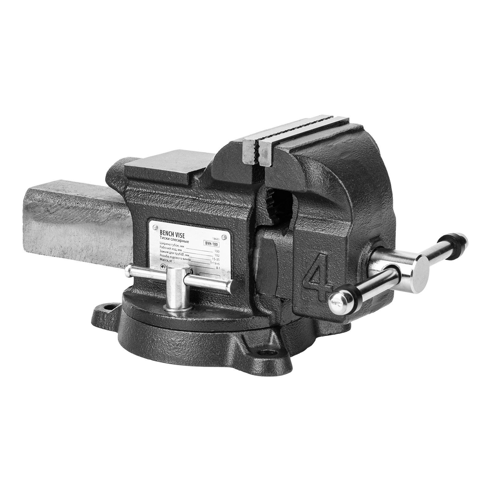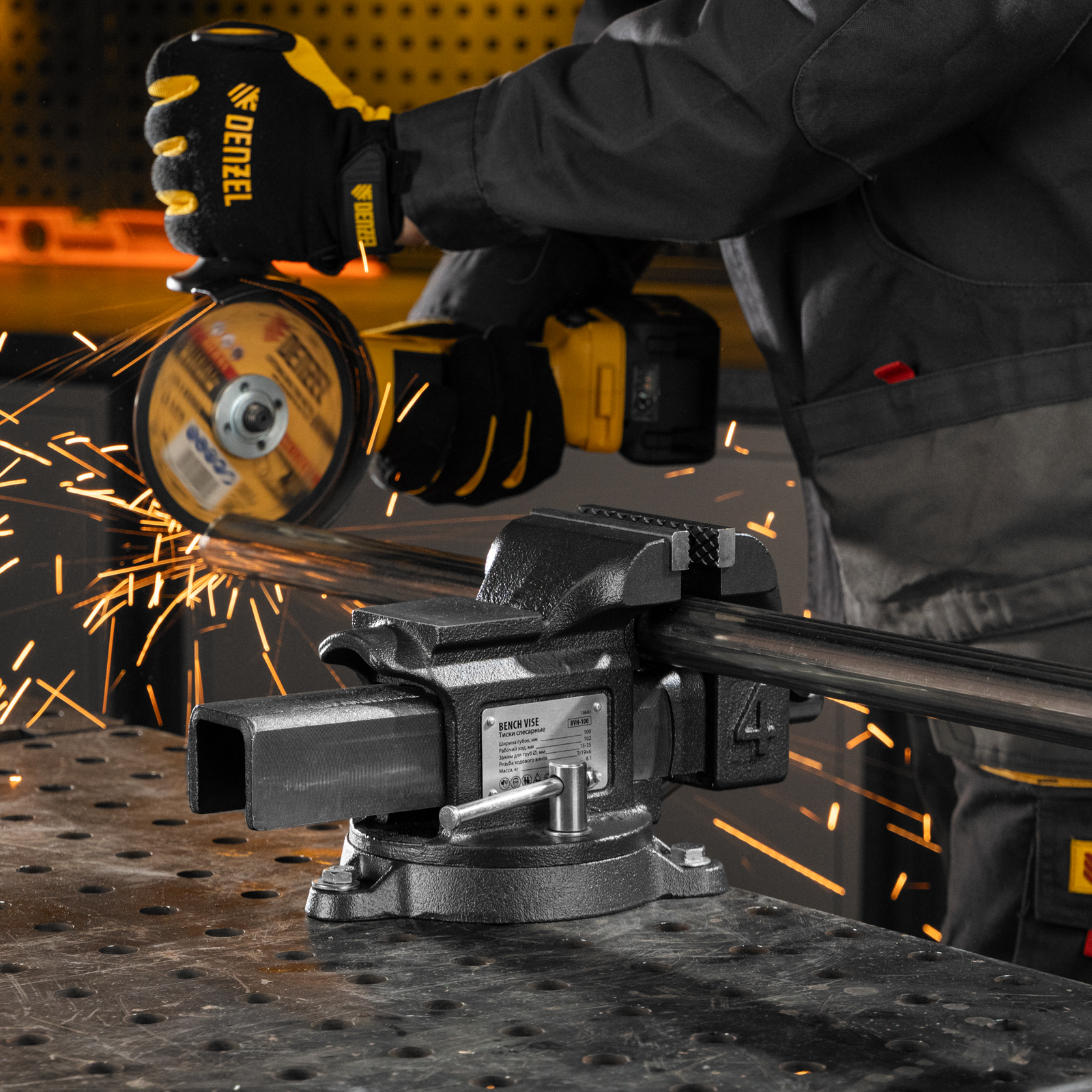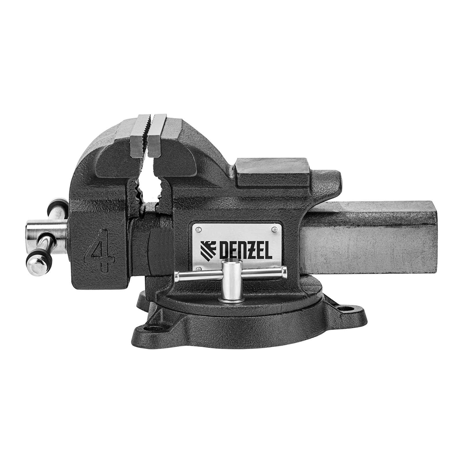 Слесарные поворотные тиски Denzel BVH-100 18683 с губками шириной 100 мм и стальной направляющей предназначены для фиксации деталей и заготовок, а также для выполнения мелких ударных работ — в конструкции предусмотрена наковальня. Рабочий ход составляет 100 мм, глубина зажима — 60 мм. Специальный зажим позволяет фиксировать трубы диаметром 15-35 мм, что расширяет возможности использования инструмента. На губки можно установить защитные накладки (приобретаются отдельно) для предотвращения повреждения зажимаемых предметов. Тиски поставляются с болтами для фиксации на рабочем столе и запасными штифтами-предохранителями. Пригодятся в мастерской и гараже.