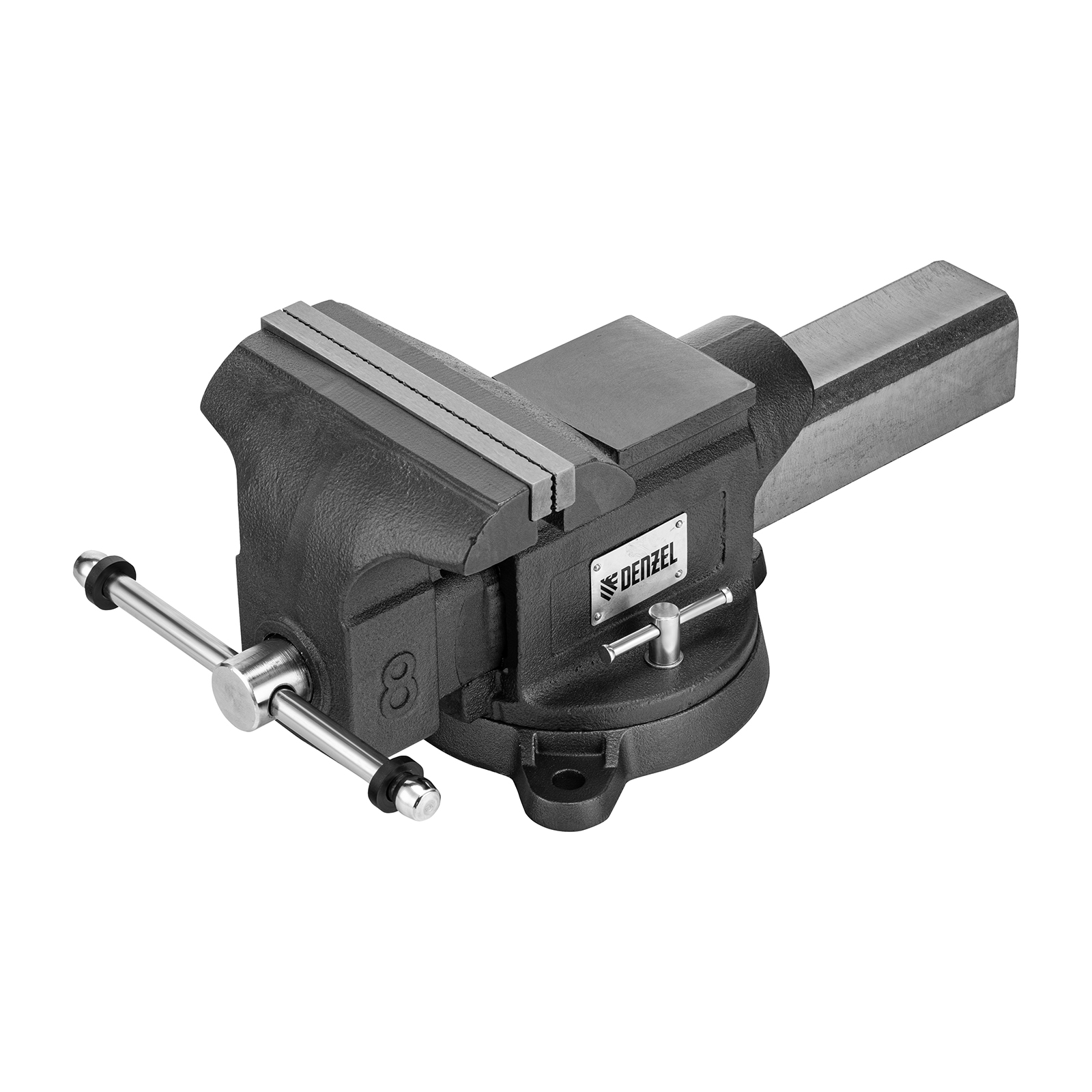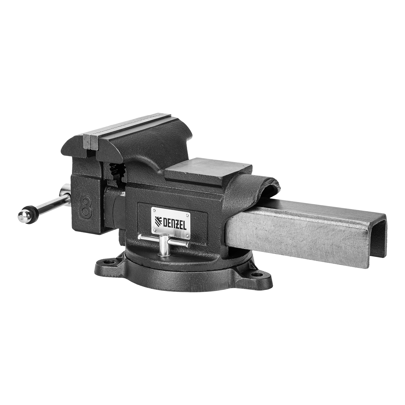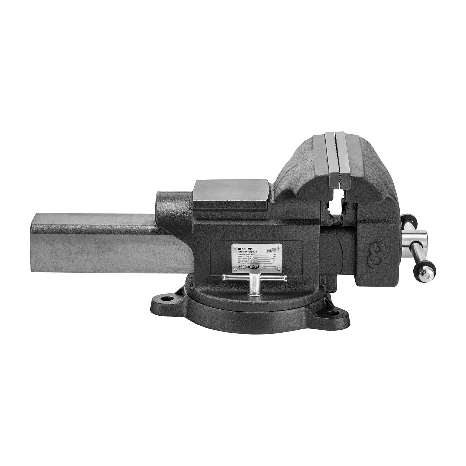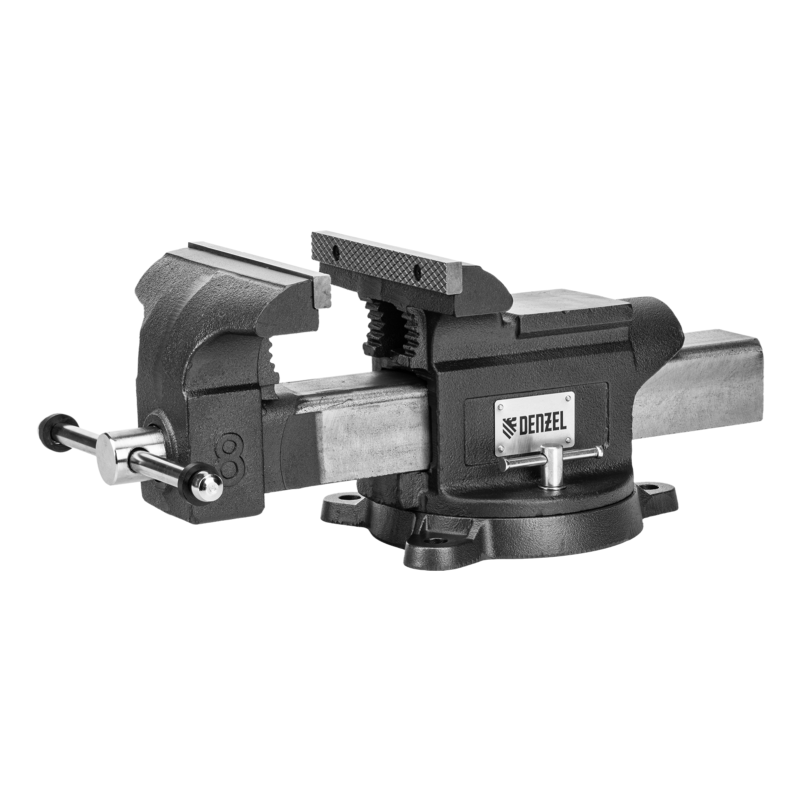 Слесарные поворотные тиски Denzel BVH-200 18686 с губками шириной 200 мм и стальной направляющей предназначены для фиксации деталей и заготовок, а также для выполнения мелких ударных работ — в конструкции предусмотрена наковальня. Рабочий ход составляет 200 мм, глубина зажима — 90 мм. Специальный зажим позволяет фиксировать трубы диаметром 25-64 мм, что расширяет возможности использования инструмента. На губки можно установить защитные накладки (приобретаются отдельно) для предотвращения повреждения зажимаемых предметов. Тиски пригодятся в мастерской и гараже.