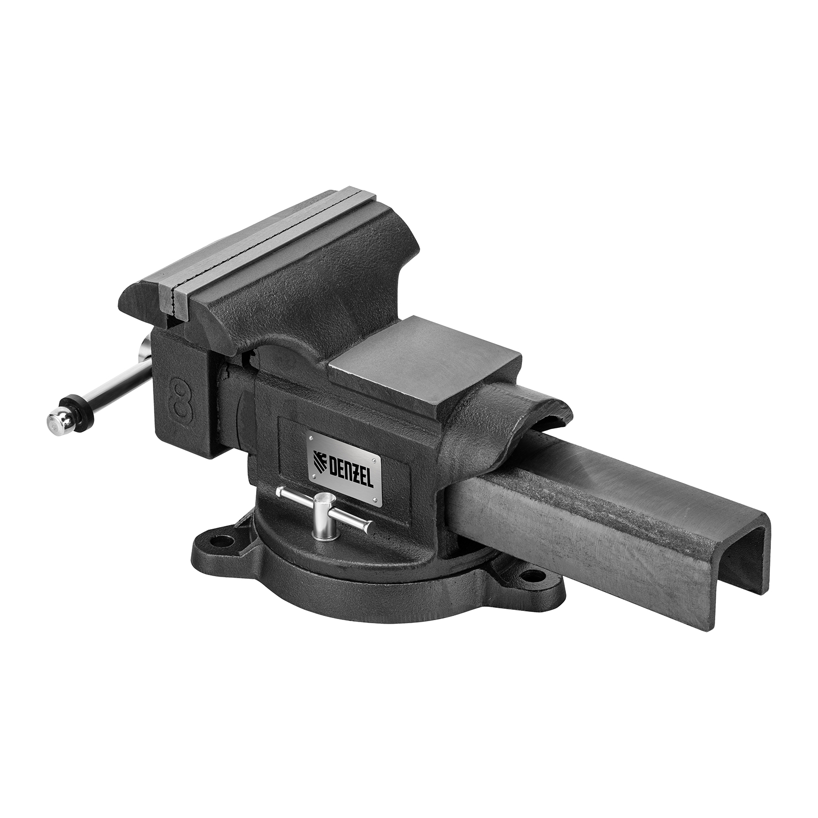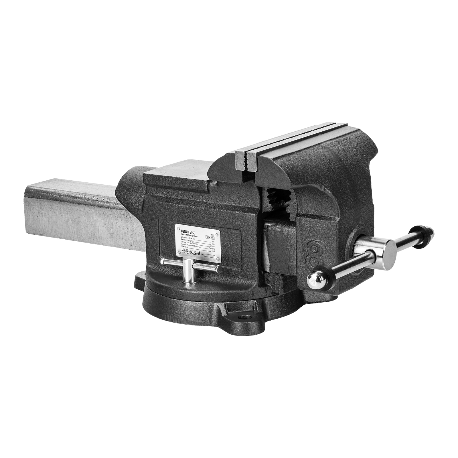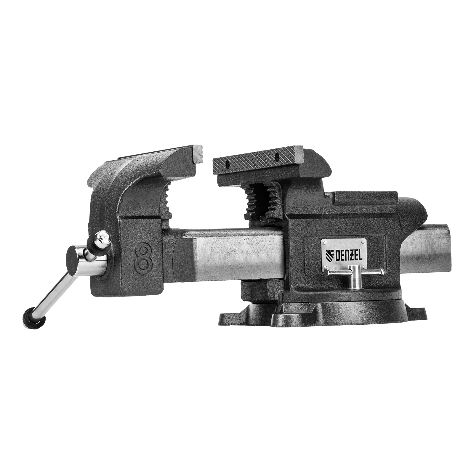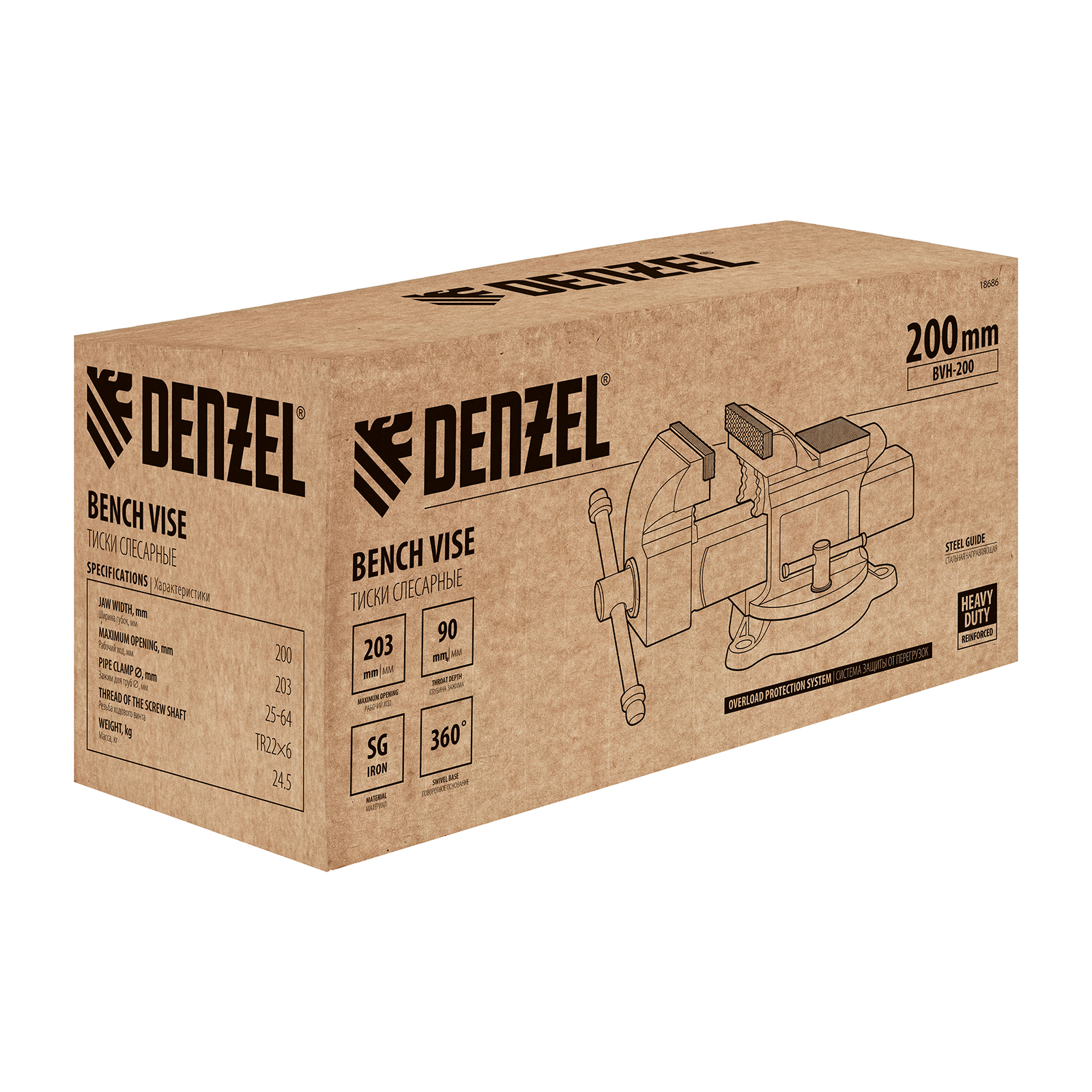 Слесарные поворотные тиски Denzel BVH-200 18686 с губками шириной 200 мм и стальной направляющей предназначены для фиксации деталей и заготовок, а также для выполнения мелких ударных работ — в конструкции предусмотрена наковальня. Рабочий ход составляет 200 мм, глубина зажима — 90 мм. Специальный зажим позволяет фиксировать трубы диаметром 25-64 мм, что расширяет возможности использования инструмента. На губки можно установить защитные накладки (приобретаются отдельно) для предотвращения повреждения зажимаемых предметов. Тиски пригодятся в мастерской и гараже.