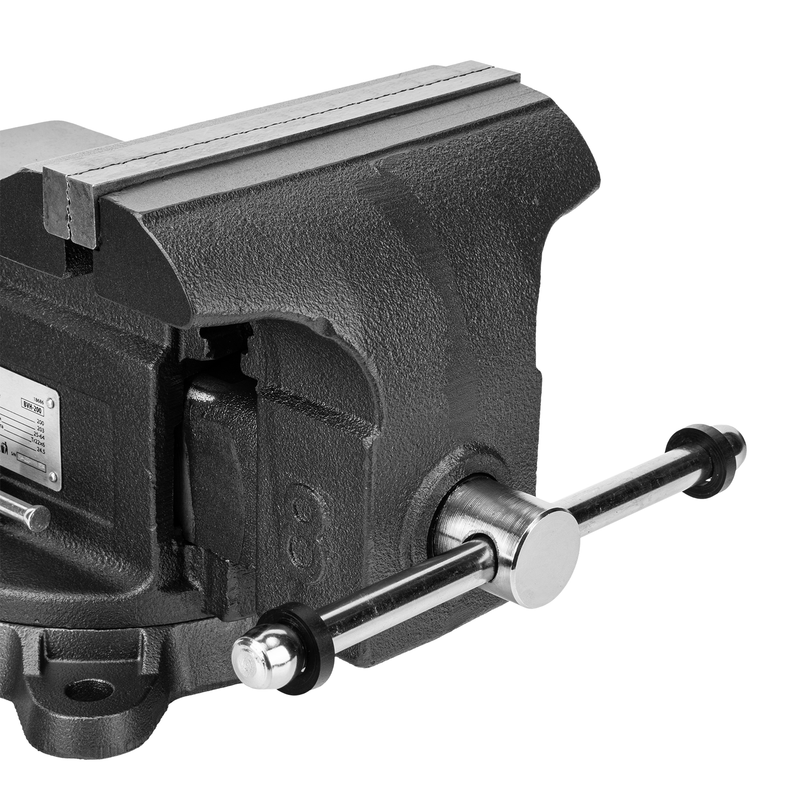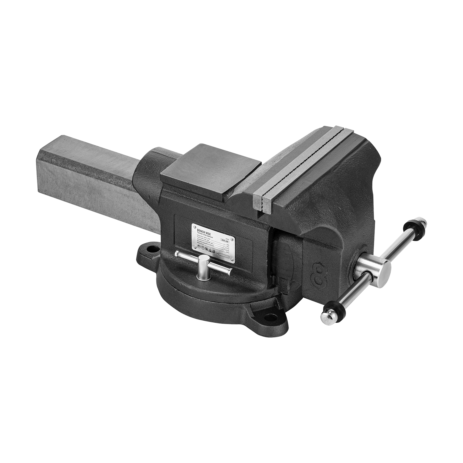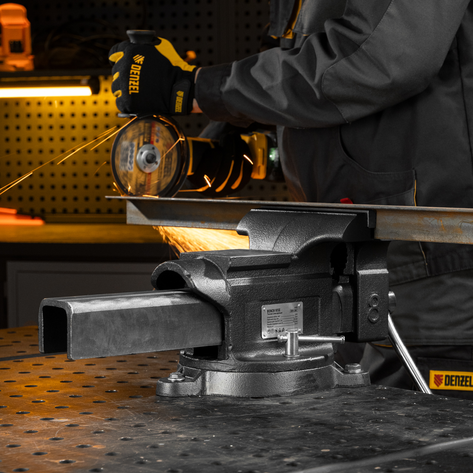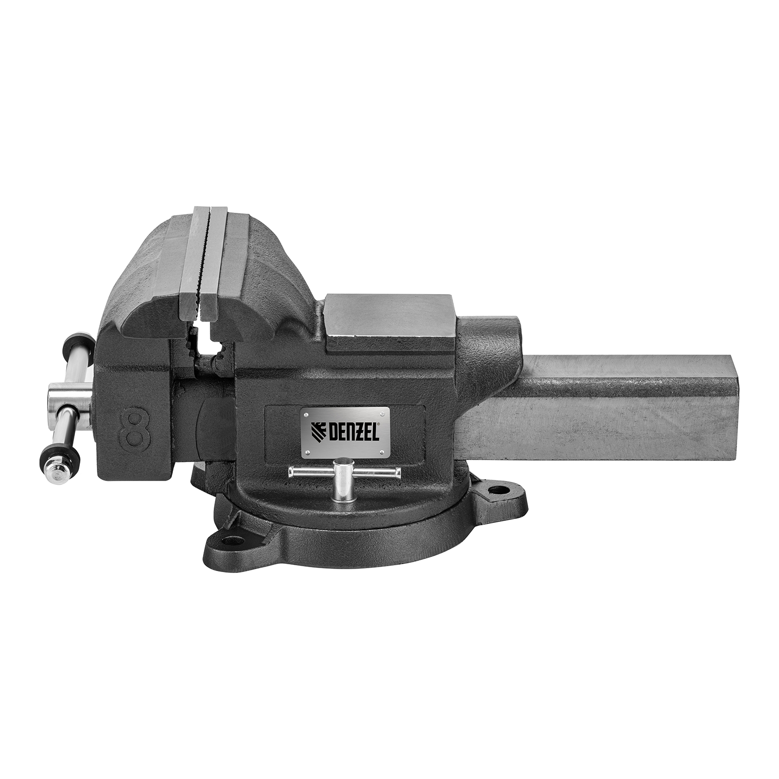 Слесарные поворотные тиски Denzel BVH-200 18686 с губками шириной 200 мм и стальной направляющей предназначены для фиксации деталей и заготовок, а также для выполнения мелких ударных работ — в конструкции предусмотрена наковальня. Рабочий ход составляет 200 мм, глубина зажима — 90 мм. Специальный зажим позволяет фиксировать трубы диаметром 25-64 мм, что расширяет возможности использования инструмента. На губки можно установить защитные накладки (приобретаются отдельно) для предотвращения повреждения зажимаемых предметов. Тиски пригодятся в мастерской и гараже.