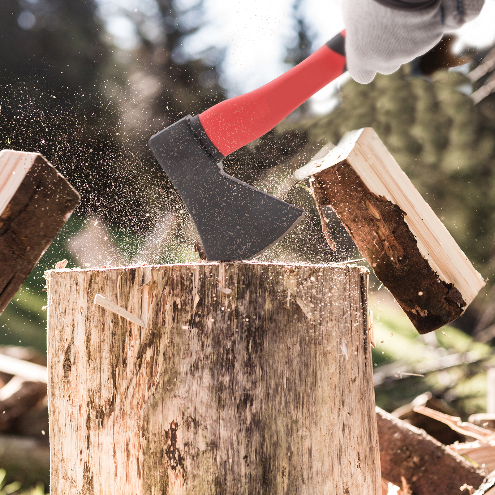 - Эффективность рубки — вес полотна 1000 г позволяет разрубать поленья за пару ударов.