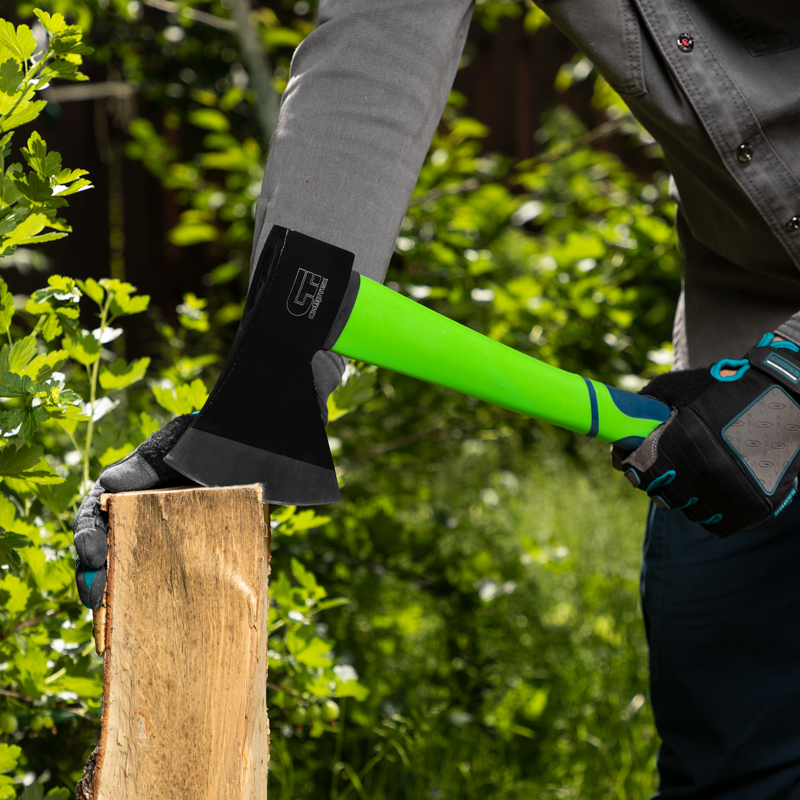 - Эффективная работа — рукоятка длиной 415 мм обеспечивает сильный замах, полотно весом 1000 г позволяет быстро разрубать поленья.