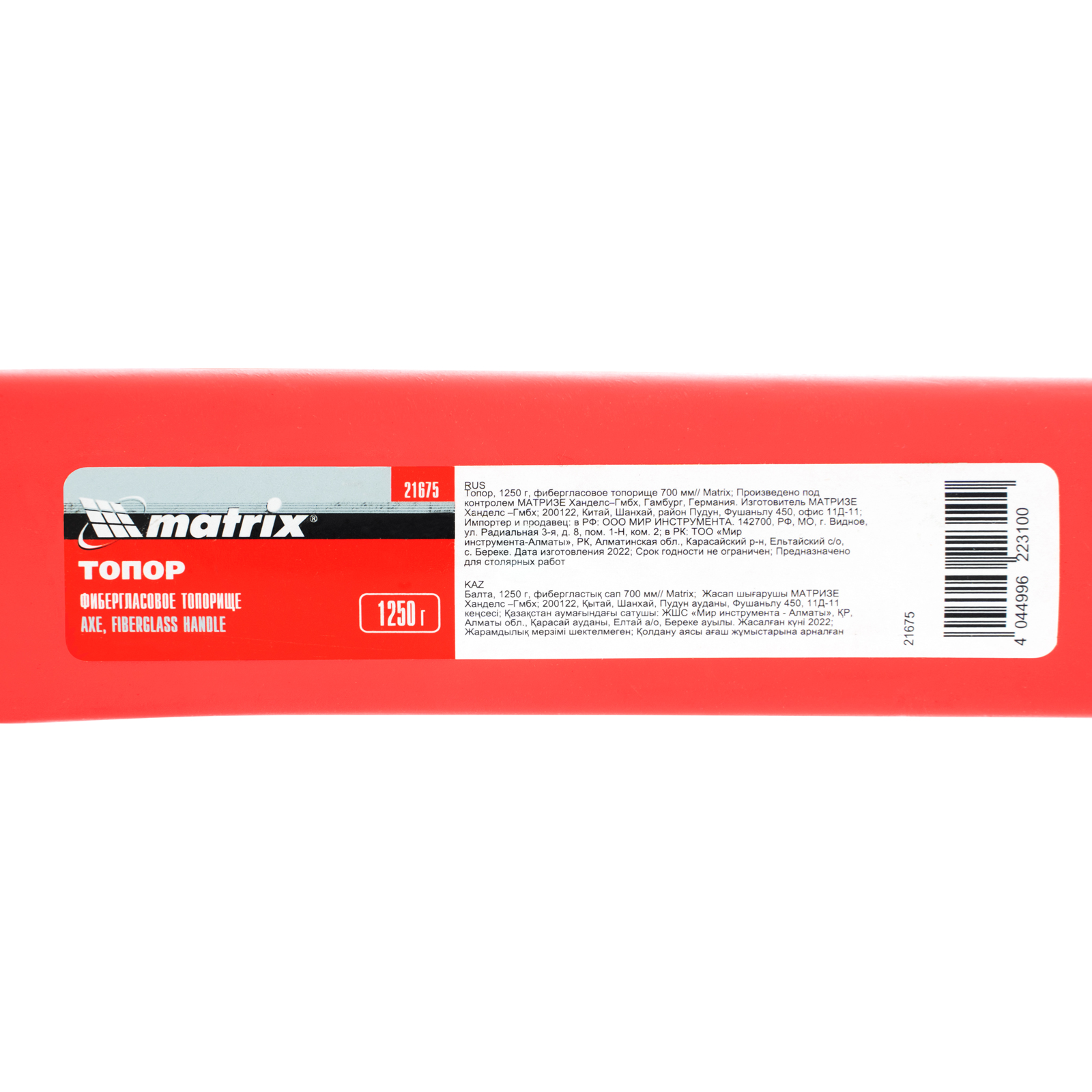 Топор Matrix 21675 длиной 700 мм, с полотном массой 1250 г и фибергласовым топорищем, предназначен для рубки и тесания древесины любых пород. Полукруглая кромка легко врезается в материал, обеспечивая эффективность работы. Топор используется для выполнения плотницких работ, будет полезен на даче и в мастерской.