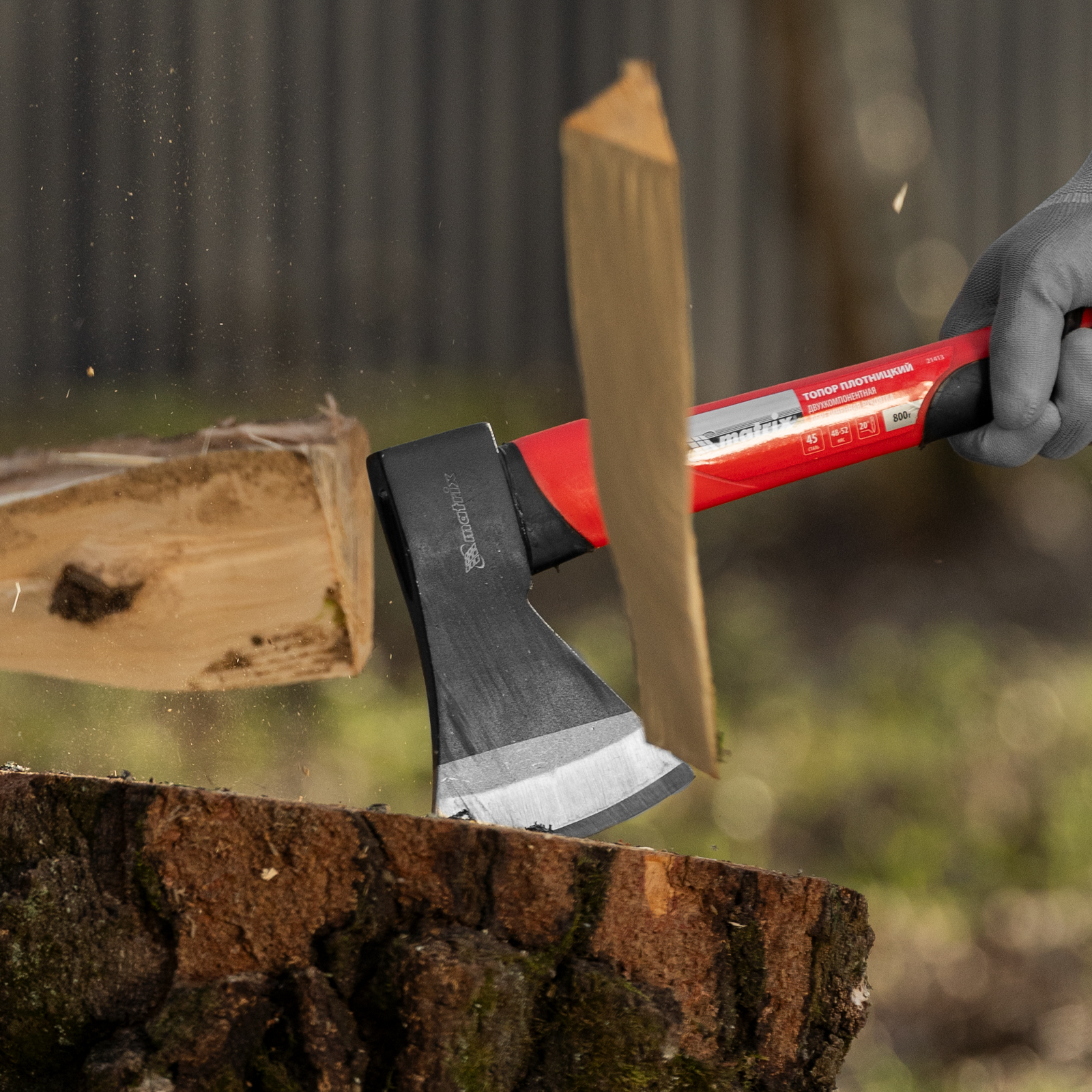 Топор Matrix 21413 длиной 450 мм, с рабочей частью весом 800 г и эргономичной фибергласовой рукояткой, используется для колки дров, заострения колышков, вырубки кустов, рубки сучьев, а также выполнения других работ. Полукруглое лезвие в сочетании с оптимальным соотношением длины и веса упрощает работу. Инструмент используется для решения бытовых задач.