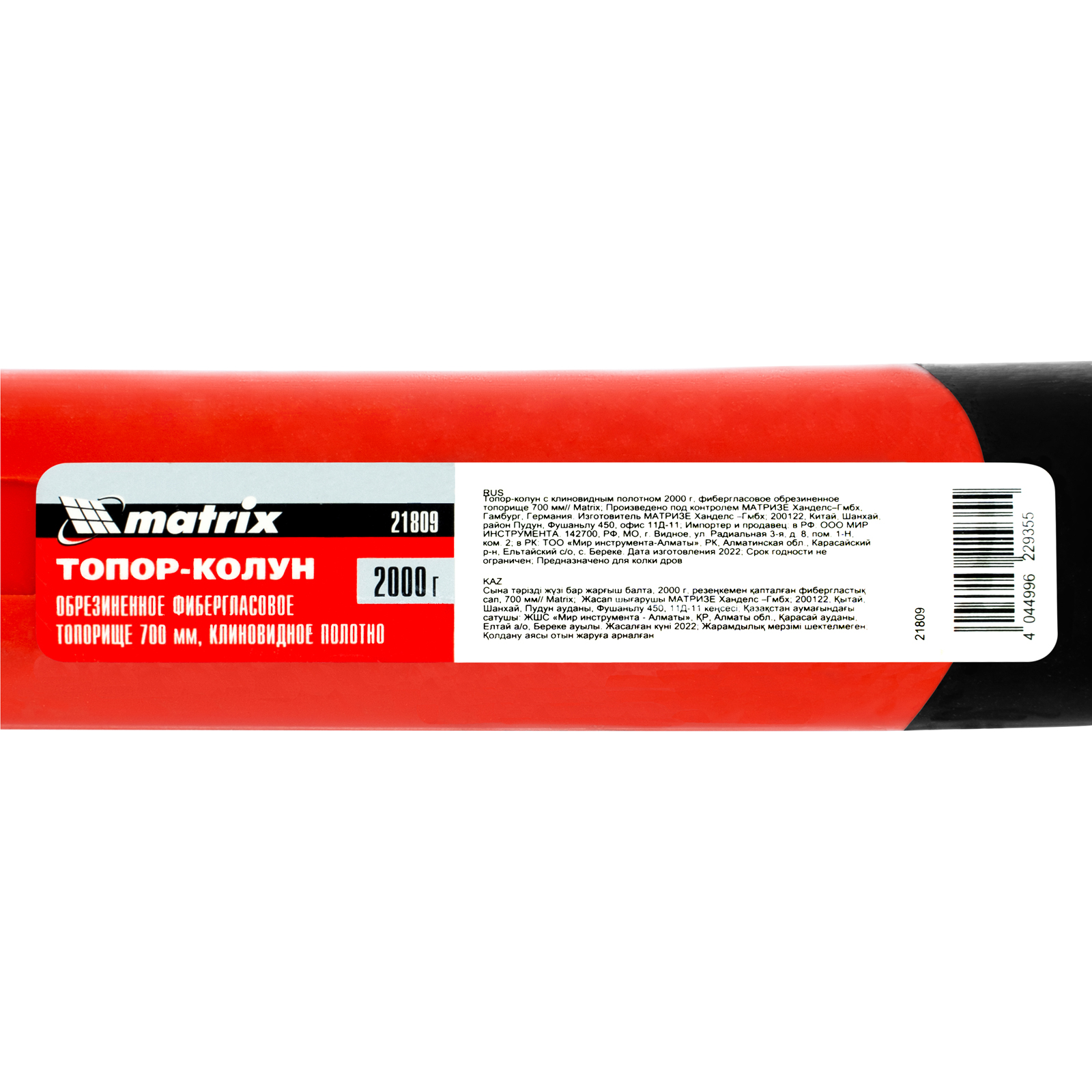 Топор-колун Matrix 21809 с клиновидным полотном весом 2000 г и фибергласовым двухкомпонентным топорищем длиной 700 мм позволяет не только колоть, но и рубить древесину. Утолщенная по бокам рабочая часть позволяет легко раскалывать бревна и заготовки.