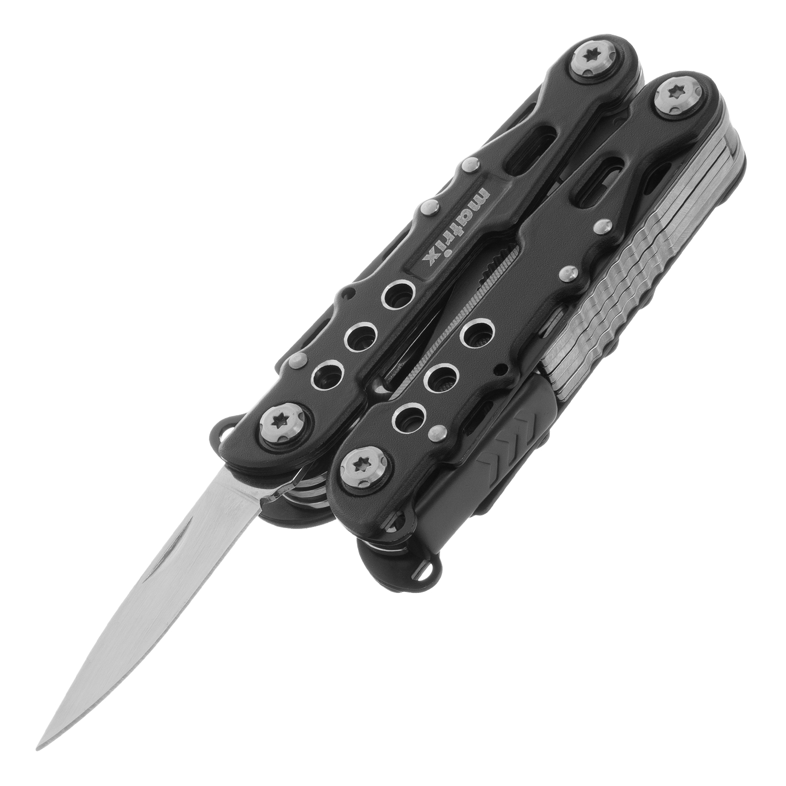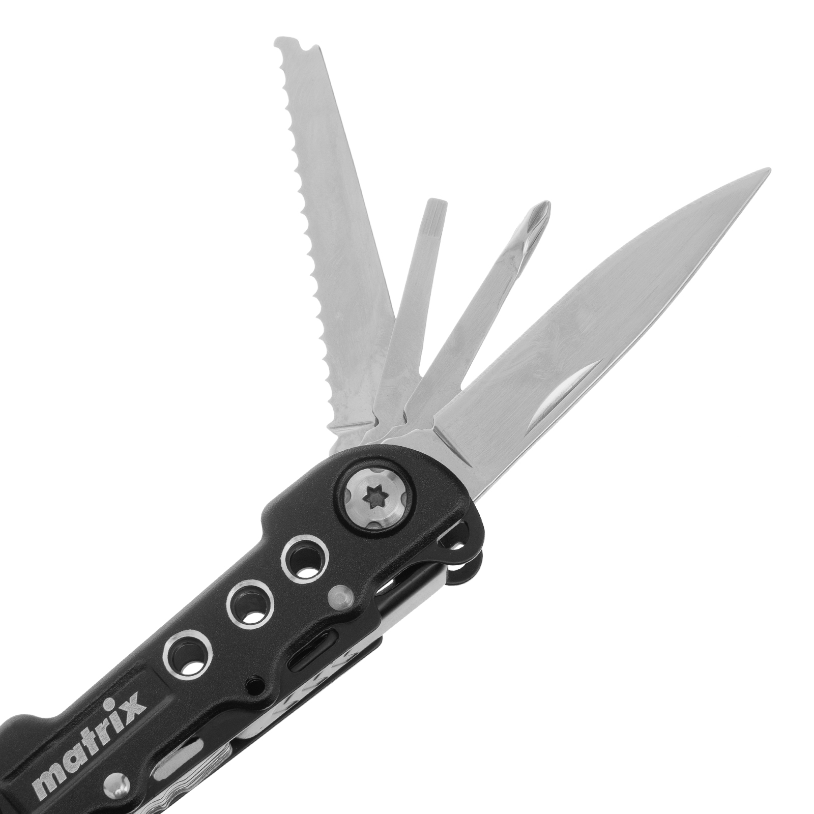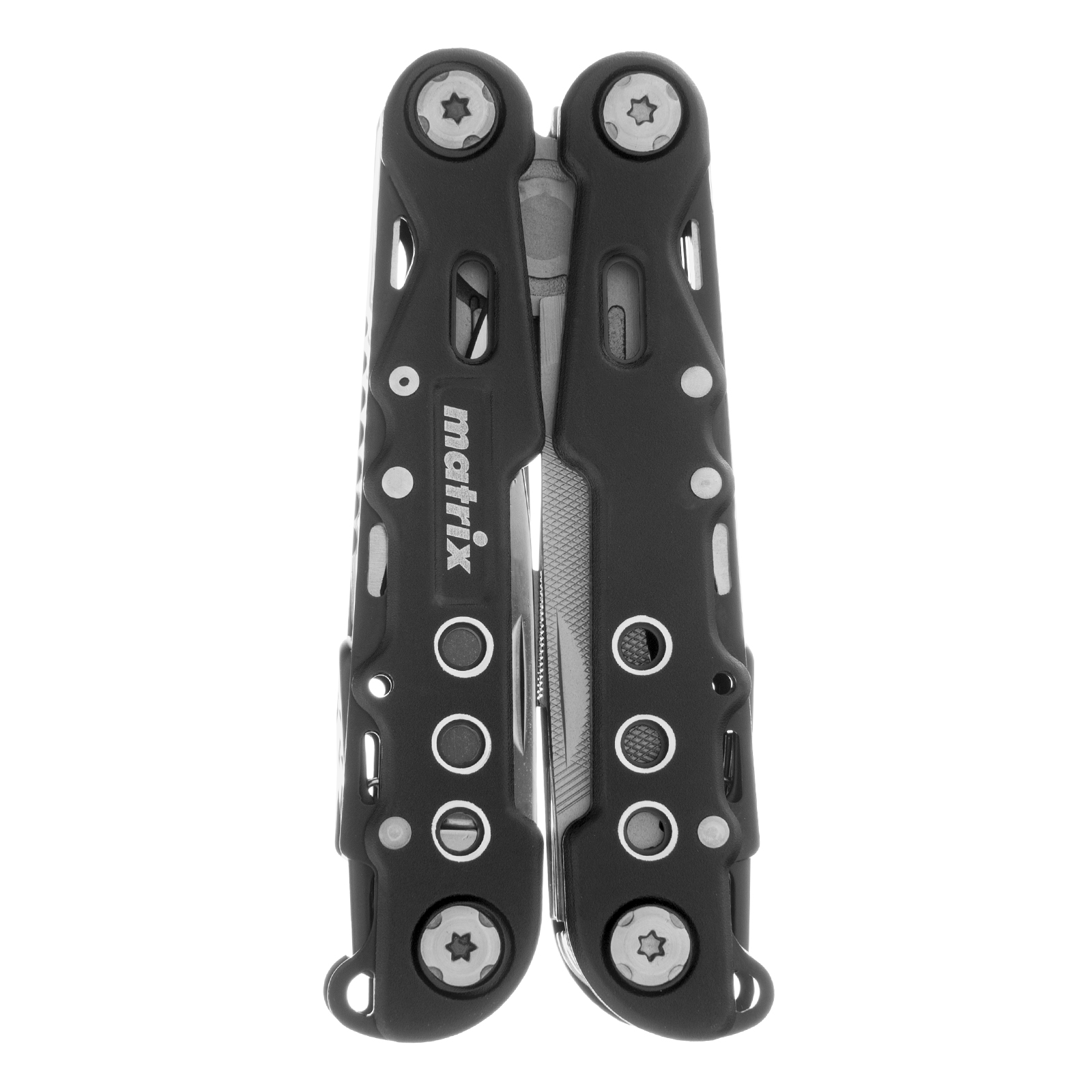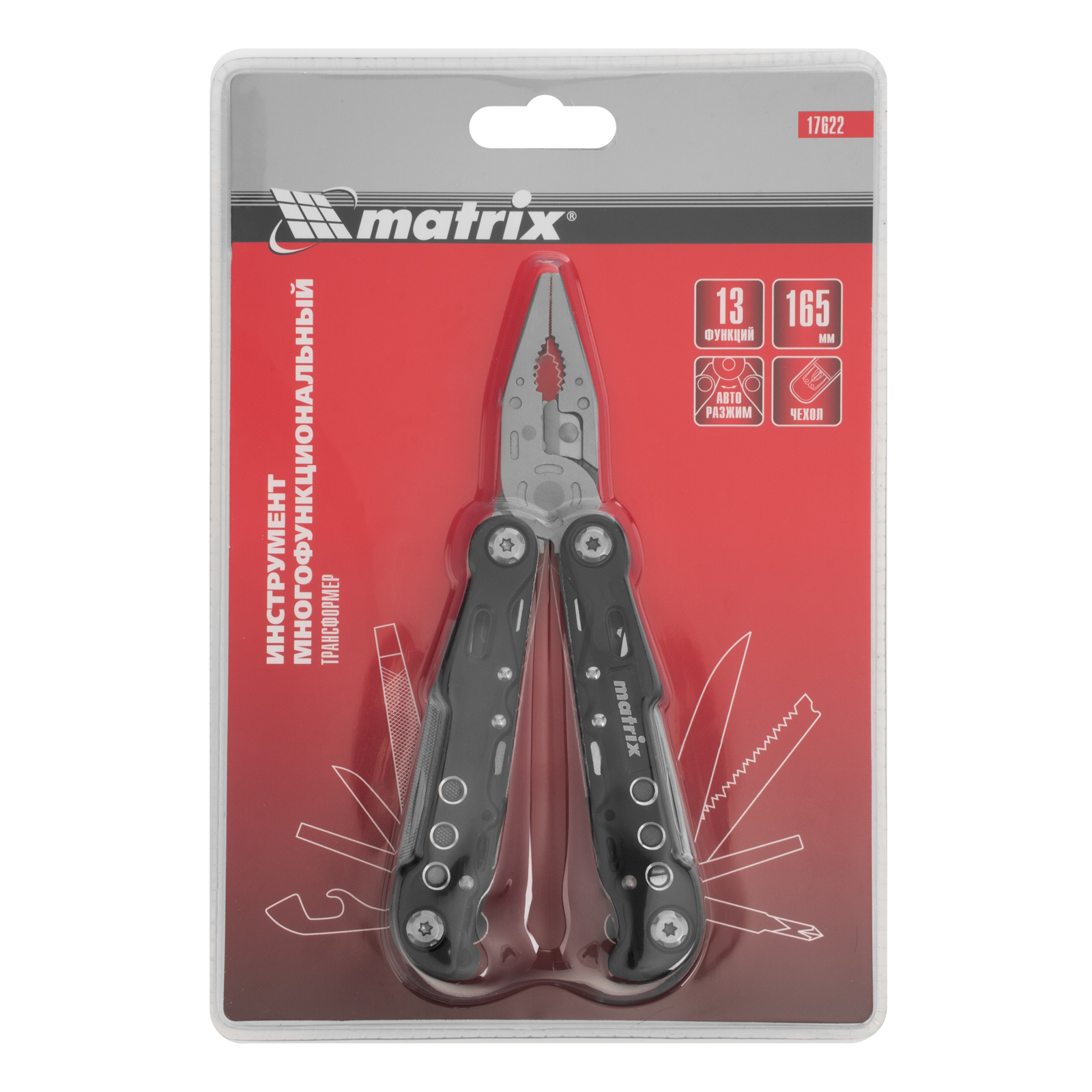 Трансформер Matrix 17622 — это мультитул длиной 165 мм с 13 функциями и авторазжимом, поставляется с чехлом. Его можно использовать в гараже — он включает длинногубцы с кусачками и захватом полукруглых предметов, а также отвертки. Инструмент пригодится в походе, на рыбалке или охоте, поскольку имеет в составе нож, пилу, открывалку и консервный нож. Благодаря пилке для ногтей мультитул будет полезен в быту.