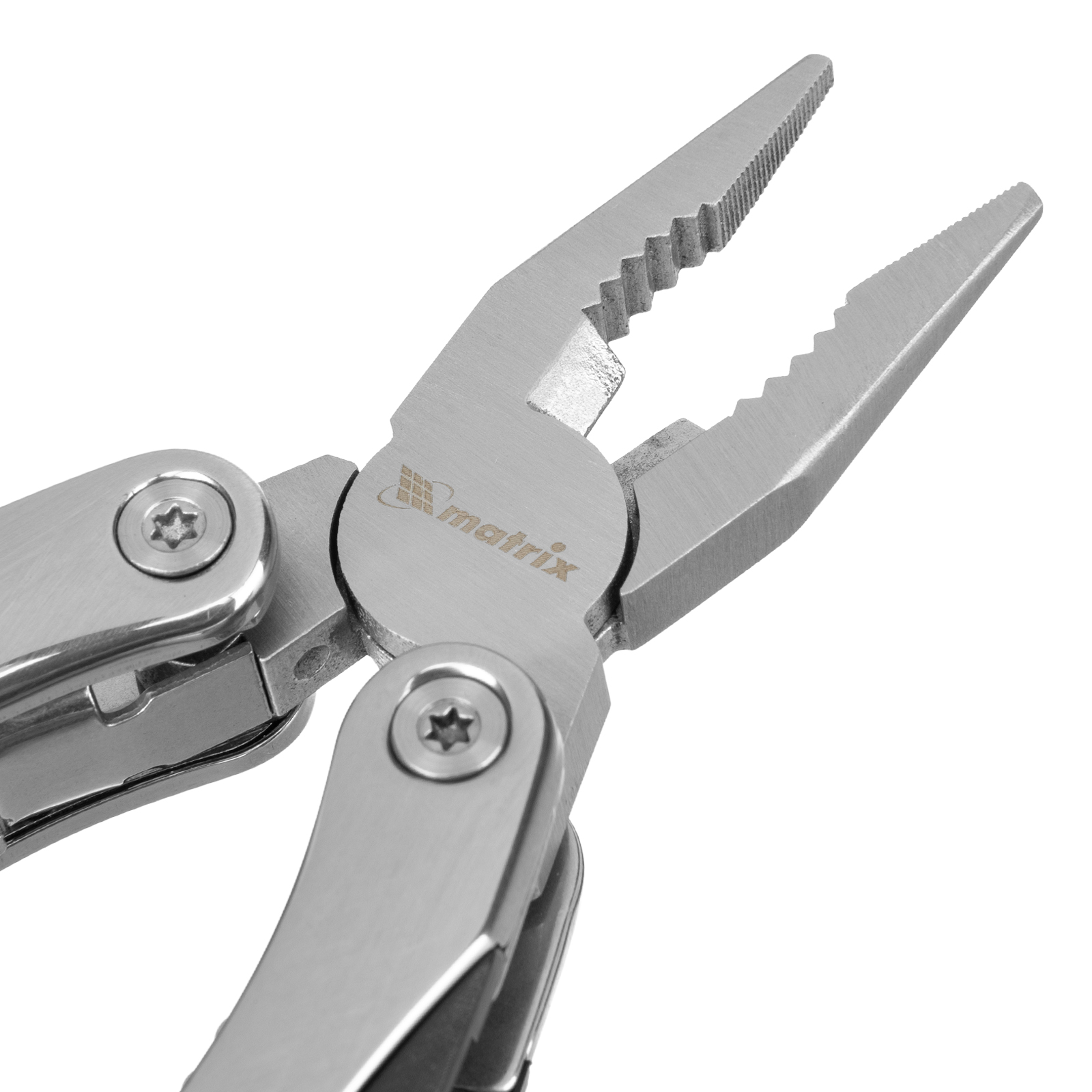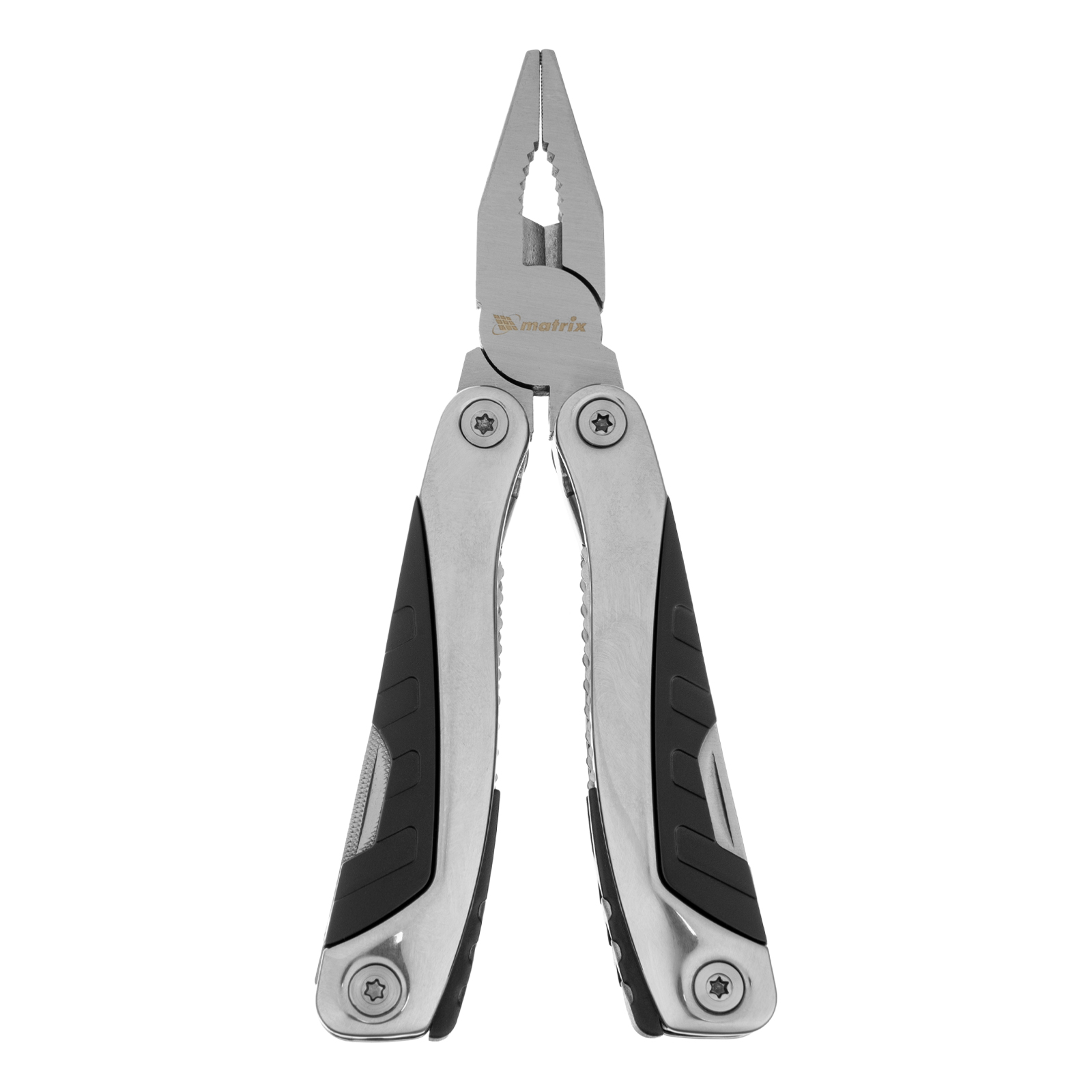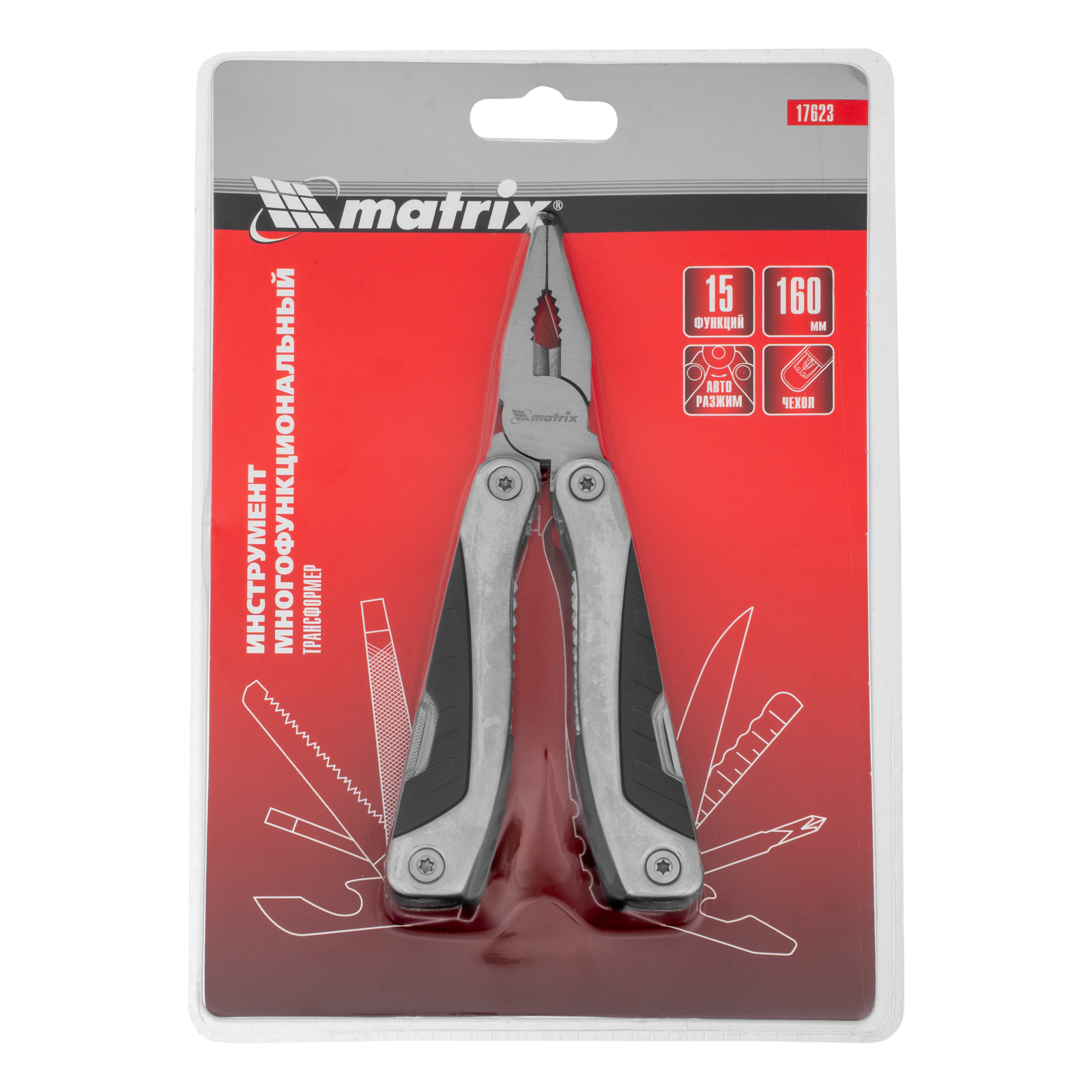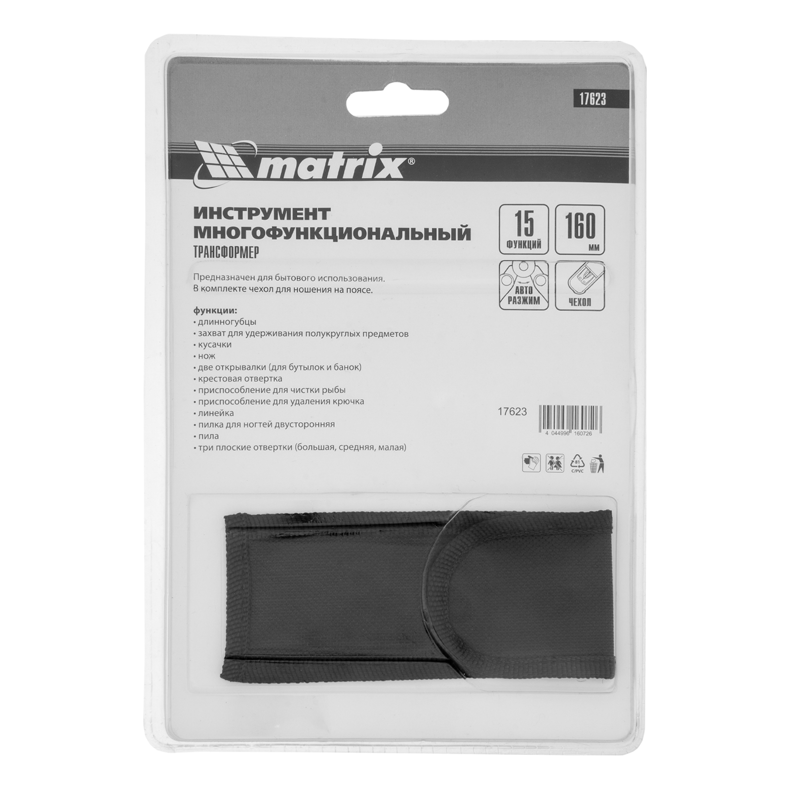 <p>Трансформер Matrix 17623 длиной 160 мм имеет 15 функций и авторазжим, поставляется с чехлом. Может использоваться в гараже, т.к. включает длинногубцы с кусачками и захватом полукруглых предметов, а также отвертки и линейку. Трансформер пригодится в походе, на рыбалке или охоте, поскольку имеет в составе нож, пилу, открывалку, консервный нож, инструменты для чистки рыбы и удаления крючка. Благодаря пилке для ногтей мультитул будет полезен в быту.</p><h2>Преимущества</h2><ul><li>Долговечность — нож и другие элементы изготовлены из прочной стали.</li><li>Комфортное использование длинногубцев — инструмент имеет функцию авторазжима.</li><li>Удобное хранение и транспортировка — трансформер комплектуется чехлом.</li></ul>