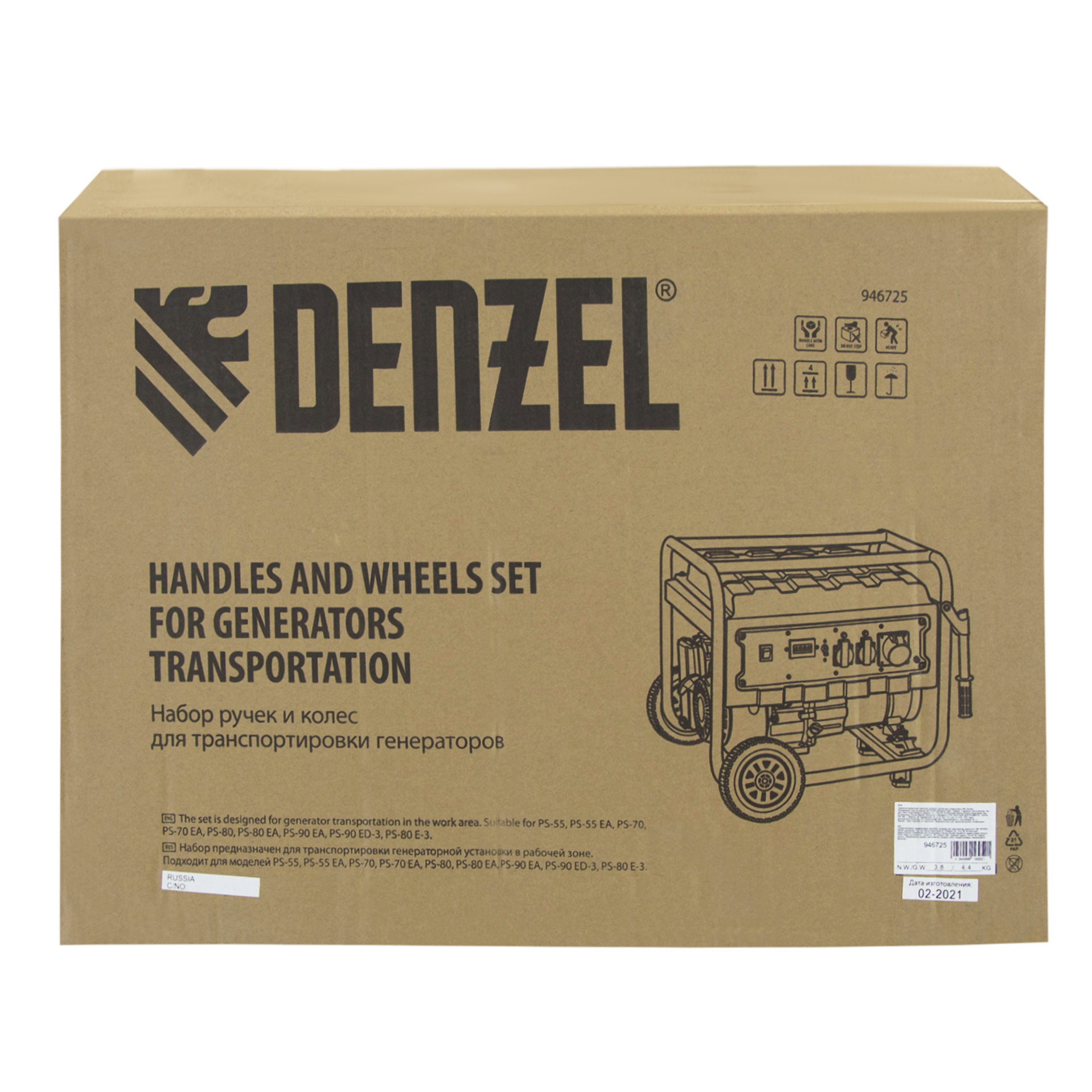 <p>Транспортировочный набор Denzel 946725, состоящий из колес и двух рукояток, предназначен для перемещения генераторов серии PS по рабочей площадке. Подходит к генераторным установкам Denzel PS 55 EA, PS 70 EA, PS 80 EA и PS 90 EA (артикулы 946874, 946894, 946924, 946934, 946944, 946954).</p><h2>Преимущества</h2><ul><li>Быстрая подготовка к работе — рукоятки легко собираются, все необходимое для монтажа входит в комплект поставки.</li><li>Удобное использование — транспортировка генератора происходит быстро и без усилий.</li><li>Надежность — элементы комплекта рассчитаны на длительную эксплуатацию.</li></ul>