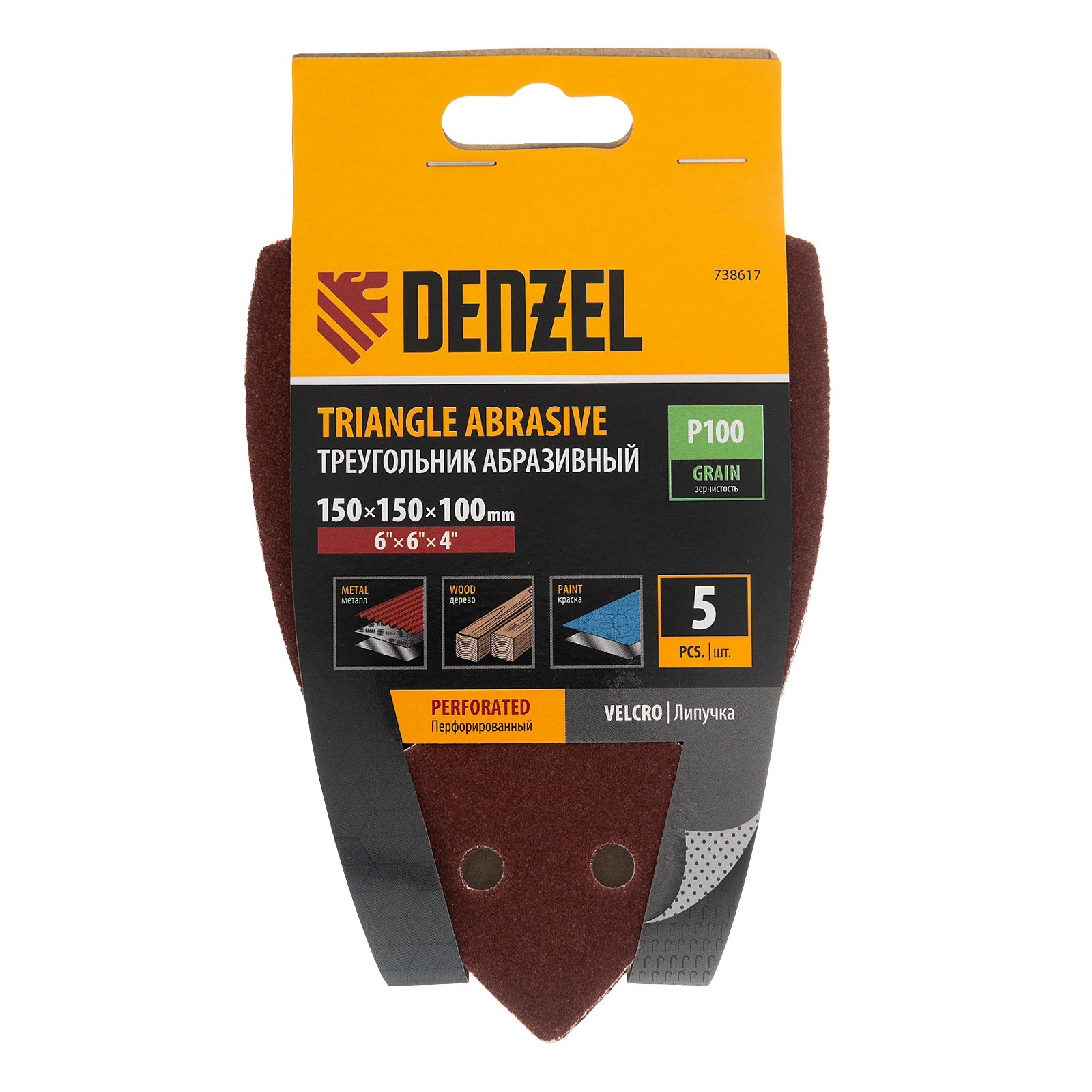 Абразивный перфорированный треугольник на ворсовой подложке «под липучку» Denzel 738617 размером 150 х 150 х 100 мм, 5 шт. в упаковке, имеет зернистость P 100 и предназначен для промежуточной обработки металлических, деревянных и других поверхностей. Позволяет удалять заусенцы, старые лакокрасочные покрытия и ржавчину, удобен для работы в углах и других труднодоступных местах. Треугольник совместим с плоскошлифовальной машиной Denzel 27614, также подходит для установки на другие шлифмашины с размером рабочей платформы 150 х 150 х 100 мм.