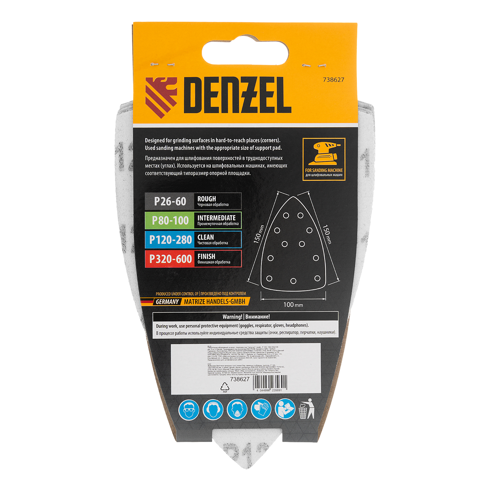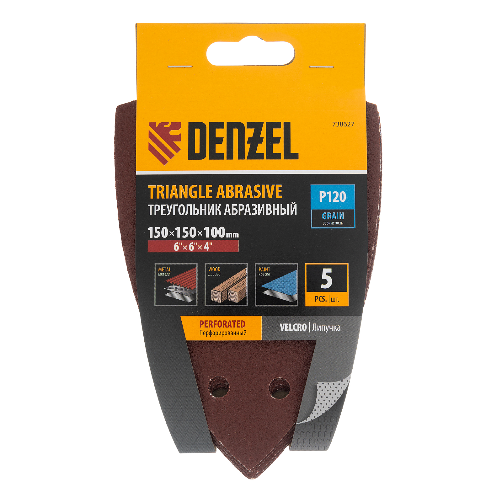 Абразивный перфорированный треугольник на ворсовой подложке «под липучку» Denzel 738627 размером 150 х 150 х 100 мм, 5 шт. в упаковке, имеет зернистость P 120 и предназначен для чистовой обработки металлических, деревянных и других деталей. Позволяет придать поверхности гладкость и подготовить ее к отделкеу, удобен для работы в углах и других труднодоступных местах. Треугольник совместим с плоскошлифовальной машиной Denzel 27614, также подходит для установки на другие шлифмашины с размером рабочей платформы 150 х 150 х 100 мм.