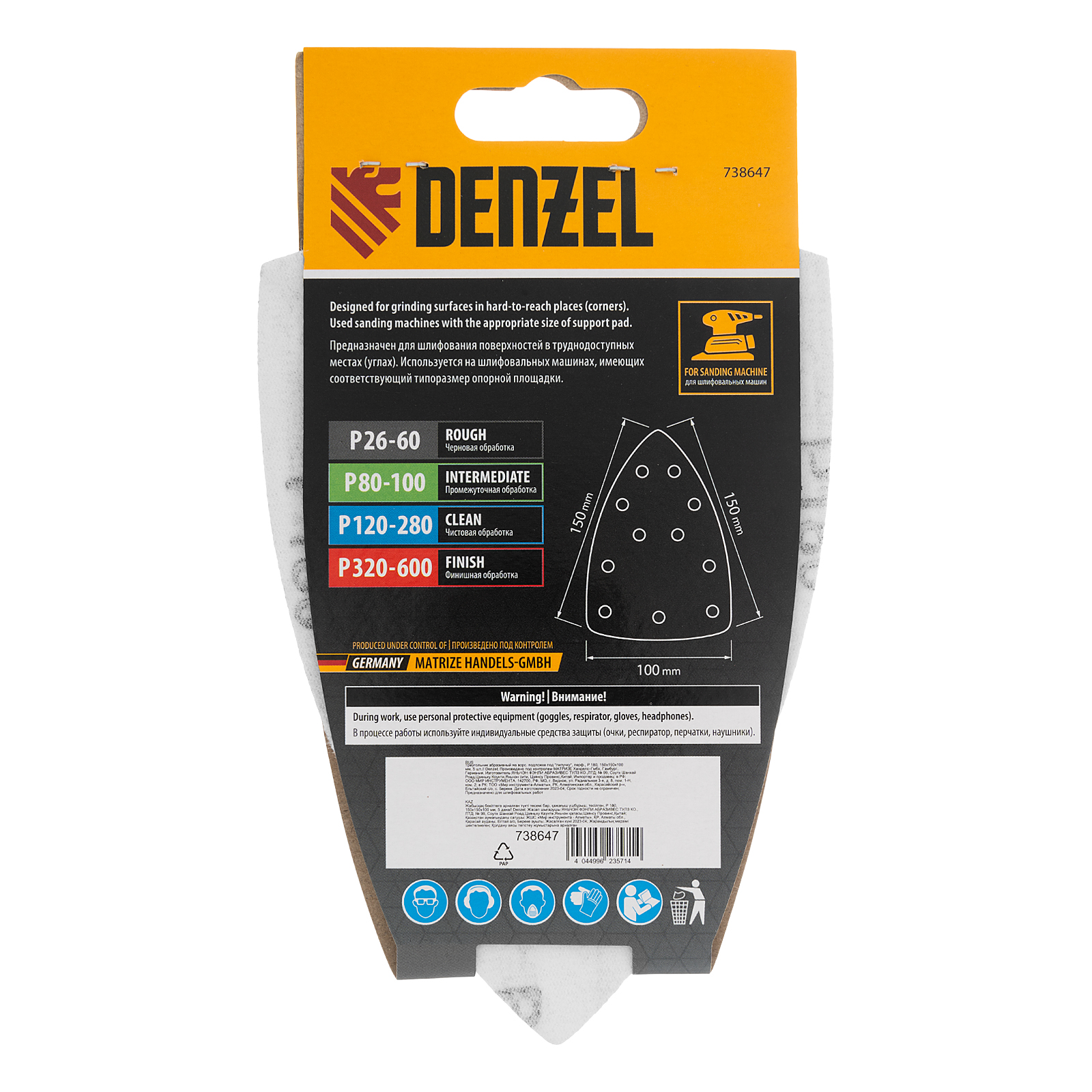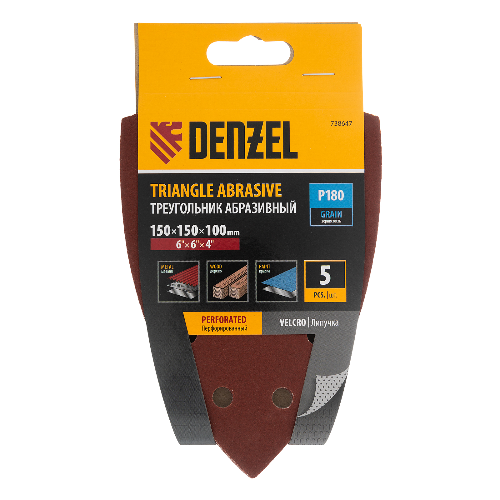 Абразивный перфорированный треугольник на ворсовой подложке «под липучку» Denzel 738647 размером 150 х 150 х 100 мм, 5 шт. в упаковке, имеет зернистость P 180 и предназначен для чистовой обработки металлических, деревянных и других деталей. Позволяет придать поверхности гладкость и подготовить ее к отделке. Удобен для работы в углах и других труднодоступных местах. Треугольник совместим с плоскошлифовальной машиной Denzel 27614, подходит для установки на другие шлифмашины с размером рабочей платформы 150 х 150 х 100 мм.
