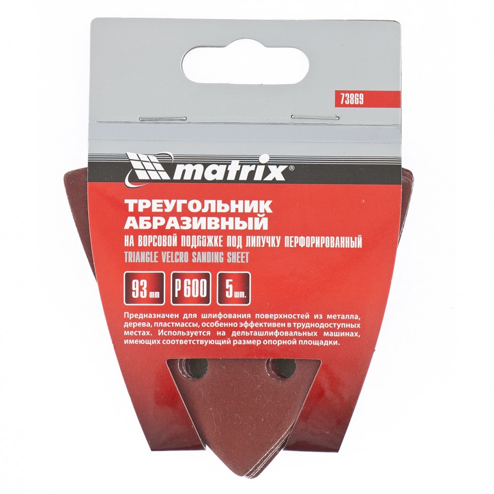 Перфорированный абразивный треугольник под «липучку» Matrix Р600 арт. 73869 предназначен для дельташлифовальных машин с опорной площадкой 93 мм. С помощью абразива мелкой зернистости Р600 можно до блеска обработать древесину, металл, пластмассу методом сухой шлифовки. Треугольная форма облегчает обработку труднодоступных мест.