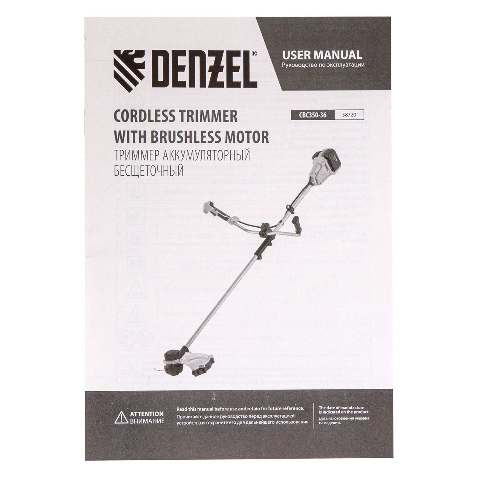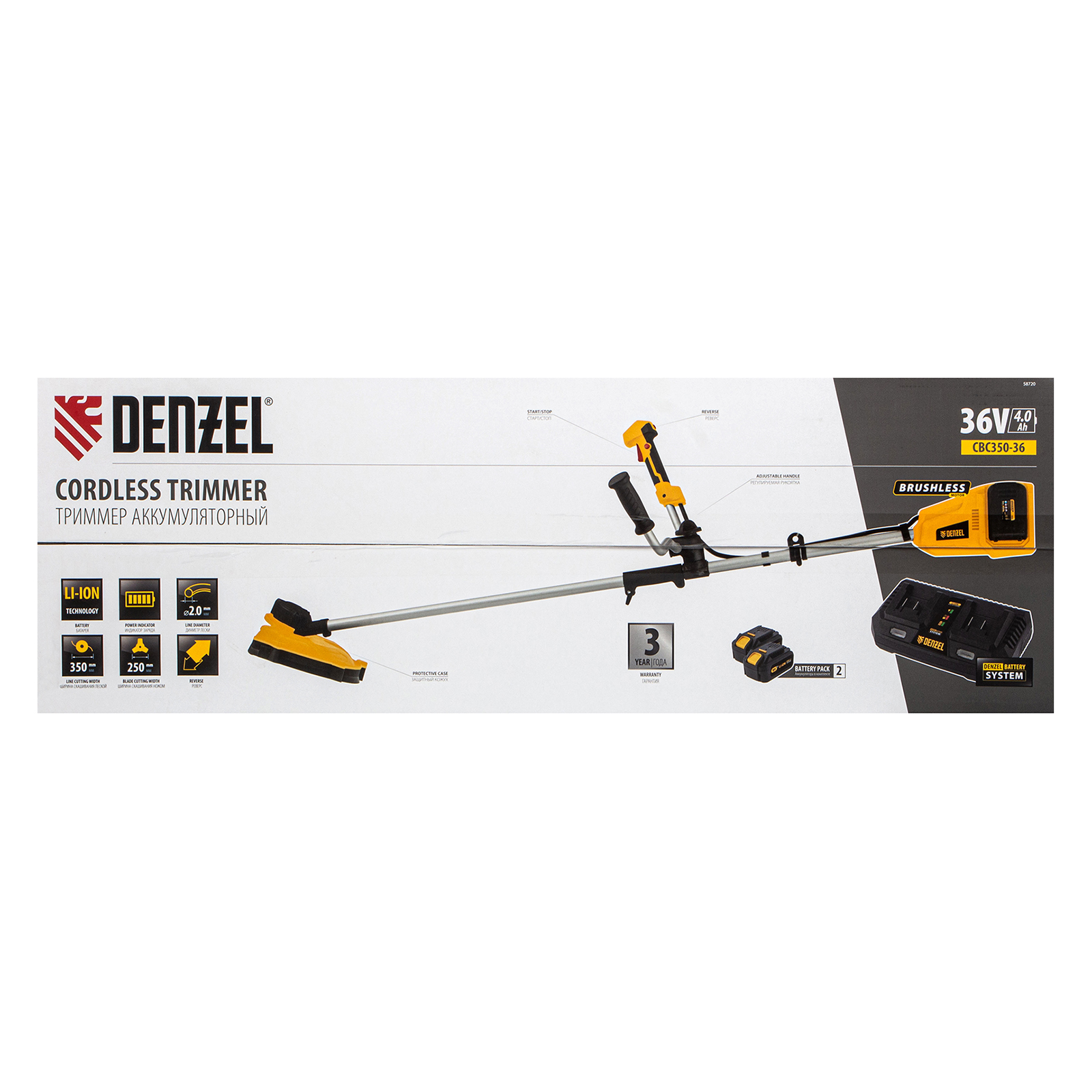 Аккумуляторный бесщеточный триммер Denzel CBC350-36 58720 с двумя батареями Li-ion, 36 В, используется для скашивания густой травы, сорняков и мелкого кустарника на приусадебном участке. В качестве оснастки используется катушка с леской диаметром 2 мм и трехлопастный нож. Ширина скашивания леской составляет 350 мм, ножом — 250 мм.,Триммер работает от двух аккумуляторов увеличенной емкости с интеллектуальной системой распознавания типа нагрузки. Бесщеточный электродвигатель обеспечивает частоту вращения шпули со скоростью 6500 об/мин — этого достаточно для эффективного решения поставленных задач. Т.к. техника не зависит от электросети, работать можно даже в самых отдаленных участках сада.