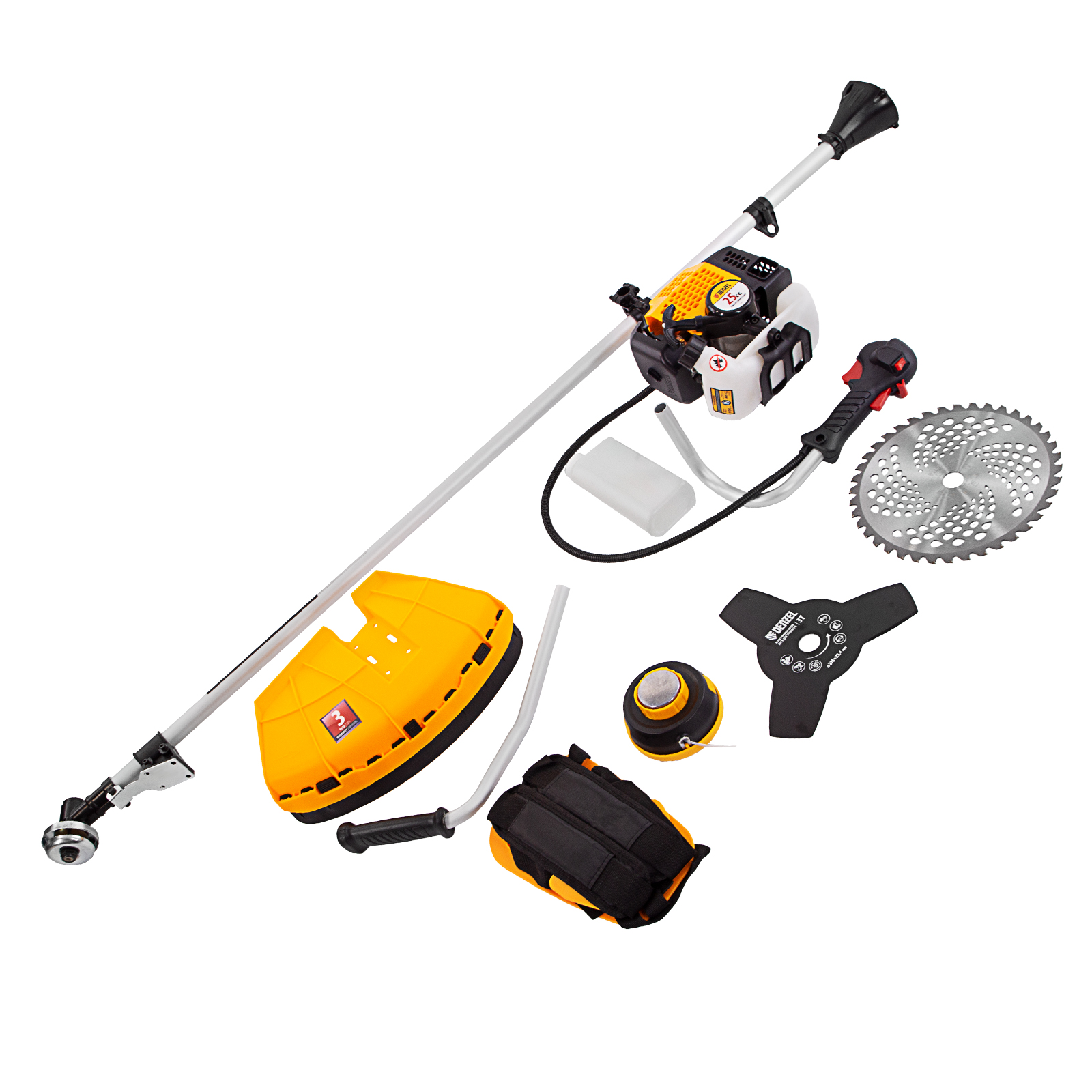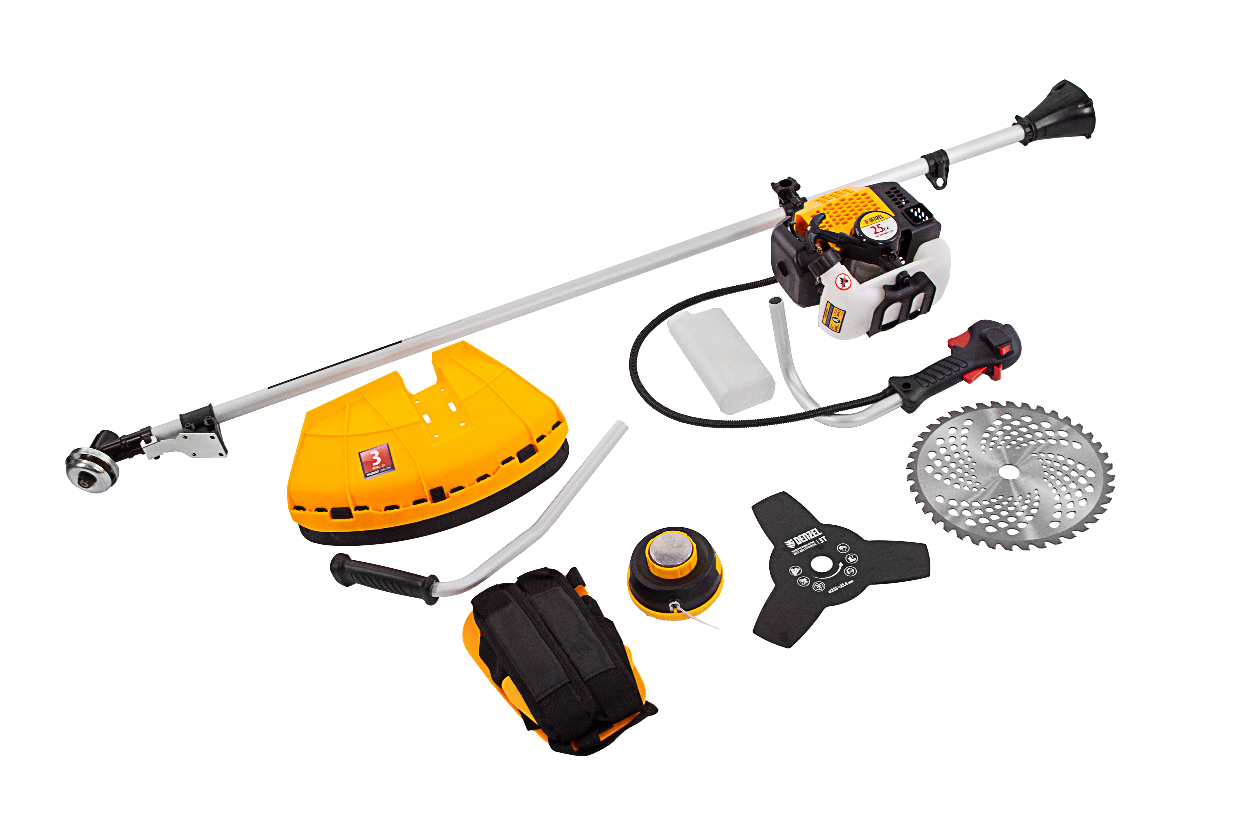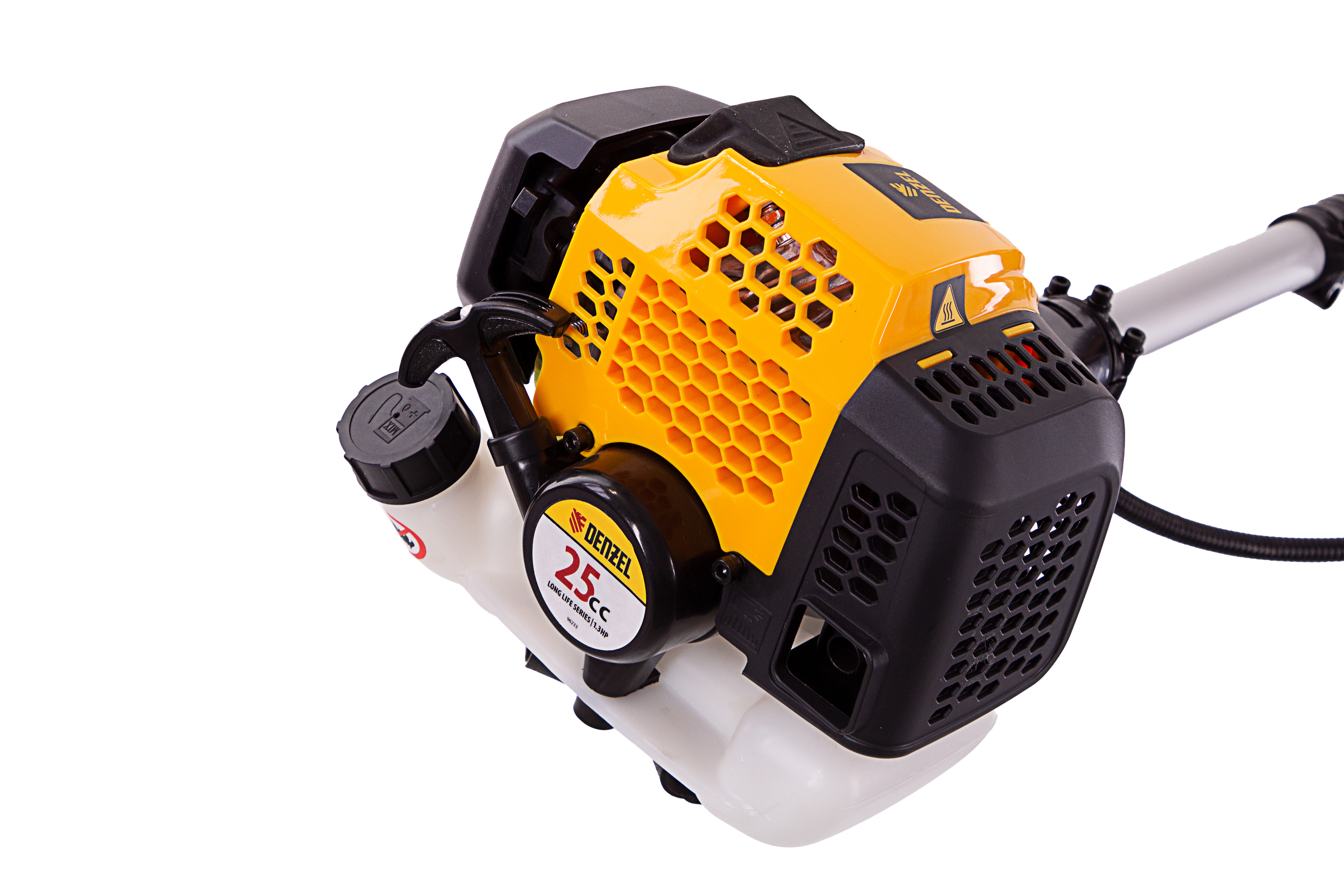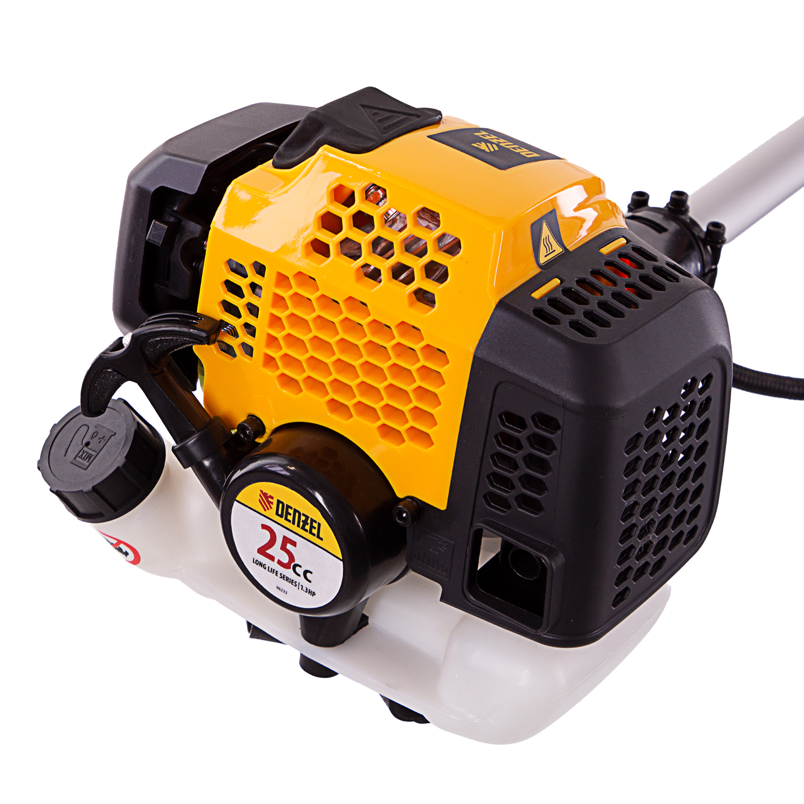 Бензиновый триммер Denzel DGT-250 96223 с двигателем объемом 25 см3 и мощностью 1,3 л. с., с неразъемной штангой, состоит из 2 частей. Комплектуется усиленной катушкой, трехлопастным ножом и пильным диском. Предназначен для подравнивания газона, скашивания травы различных типов, в том числе с жесткими стеблями (полыни, крапивы, лебеды), а также срезания борщевика, кустарника и молодых побегов деревьев с диаметром стволов до 10 мм. Удобен для работы в местах, недоступных для колесной косилки.