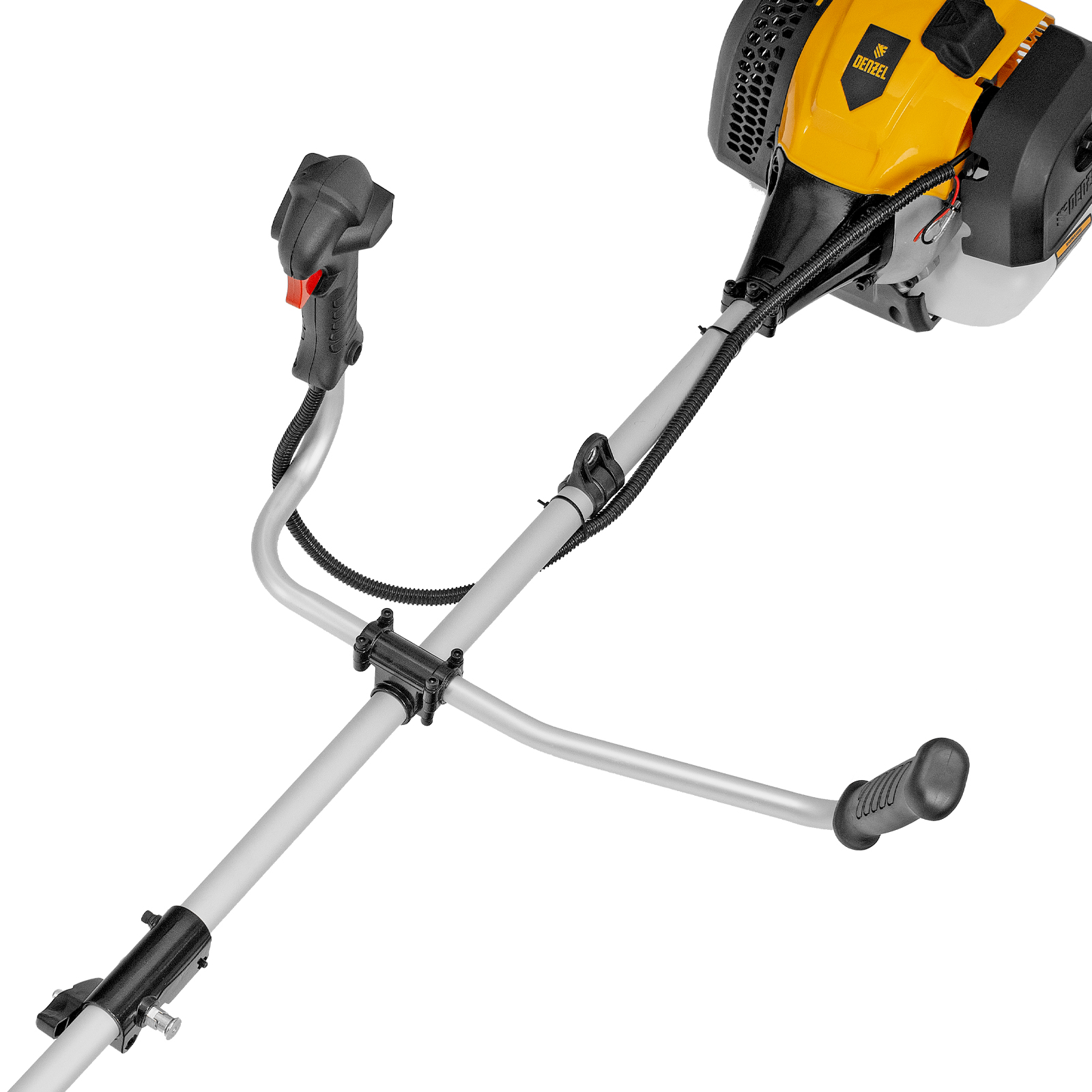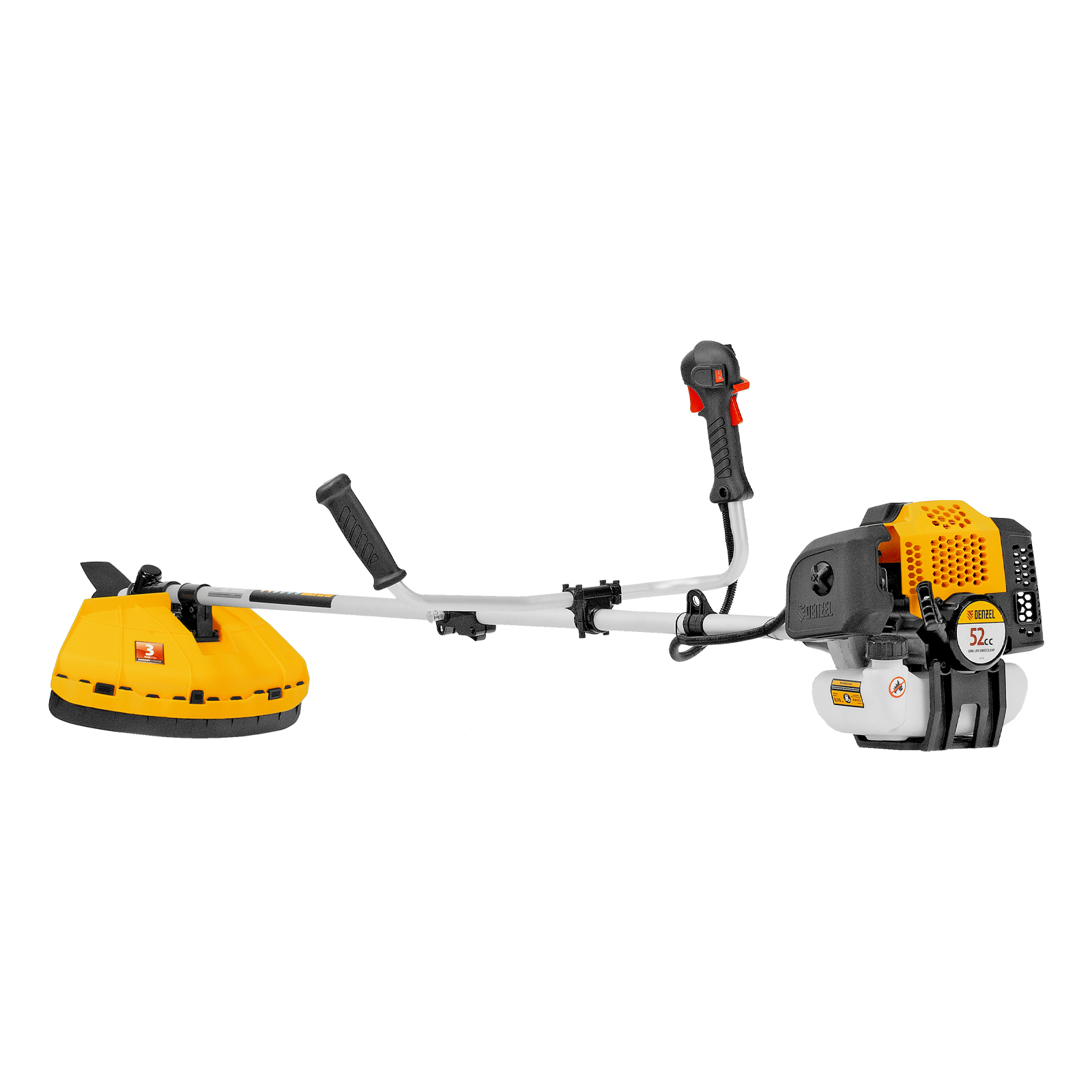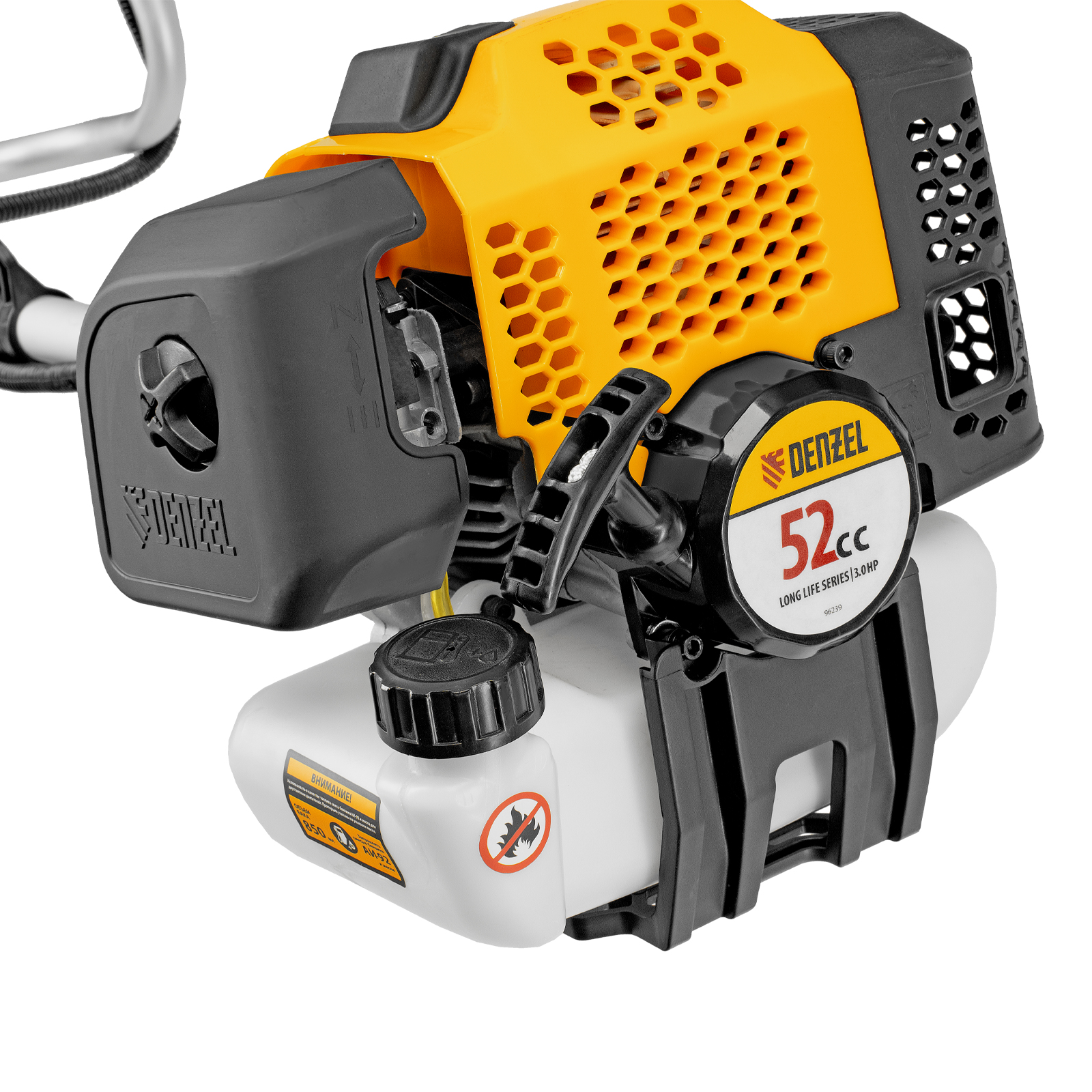 Бензиновый триммер Denzel DGT-520S 96239 с двигателем объемом 52 см3 мощностью 3 л. с., с разъемной штангой, состоит из 2 частей. Скашивает газонную траву, растительность с жесткими и древовидными стеблями (полынь, крапиву, лебеду, борщевик), подходит для срезания кустарника и молодых побегов деревьев с диаметром стволов до 10 мм. Бензиновый двигатель последнего поколения объемом 52 куб. см обеспечивает маневренность и уверенную работу даже в самых труднодоступных местах. Скорость вращения оснастки составляет 9500 об/мин. Ширина прохода диском составляет 255 см, а леской — 420 см, что позволяет обработать большой участок за короткое время.,Триммер работает на смеси бензина с маслом, а потому использовать его можно вдали от дома, независимо от источников электроэнергии. В комплект поставки входит удобный дозатор для приготовления топливной смеси.