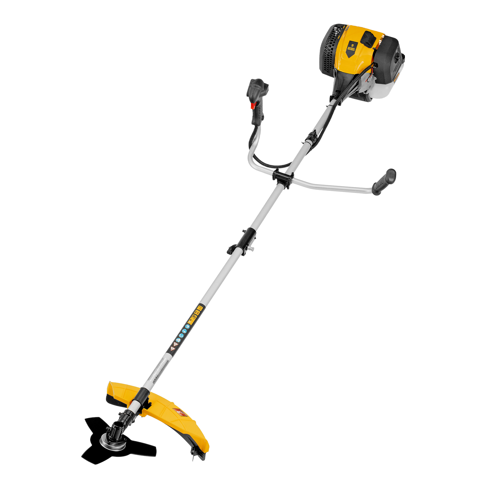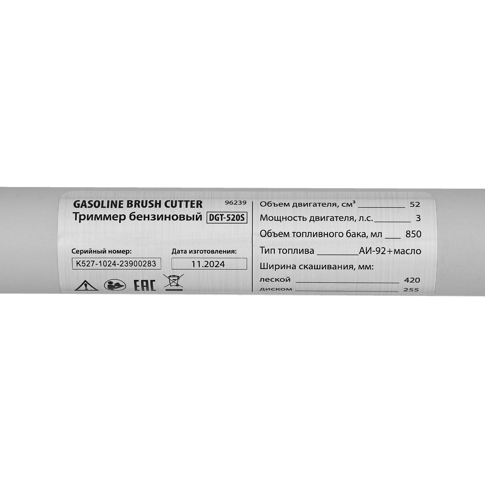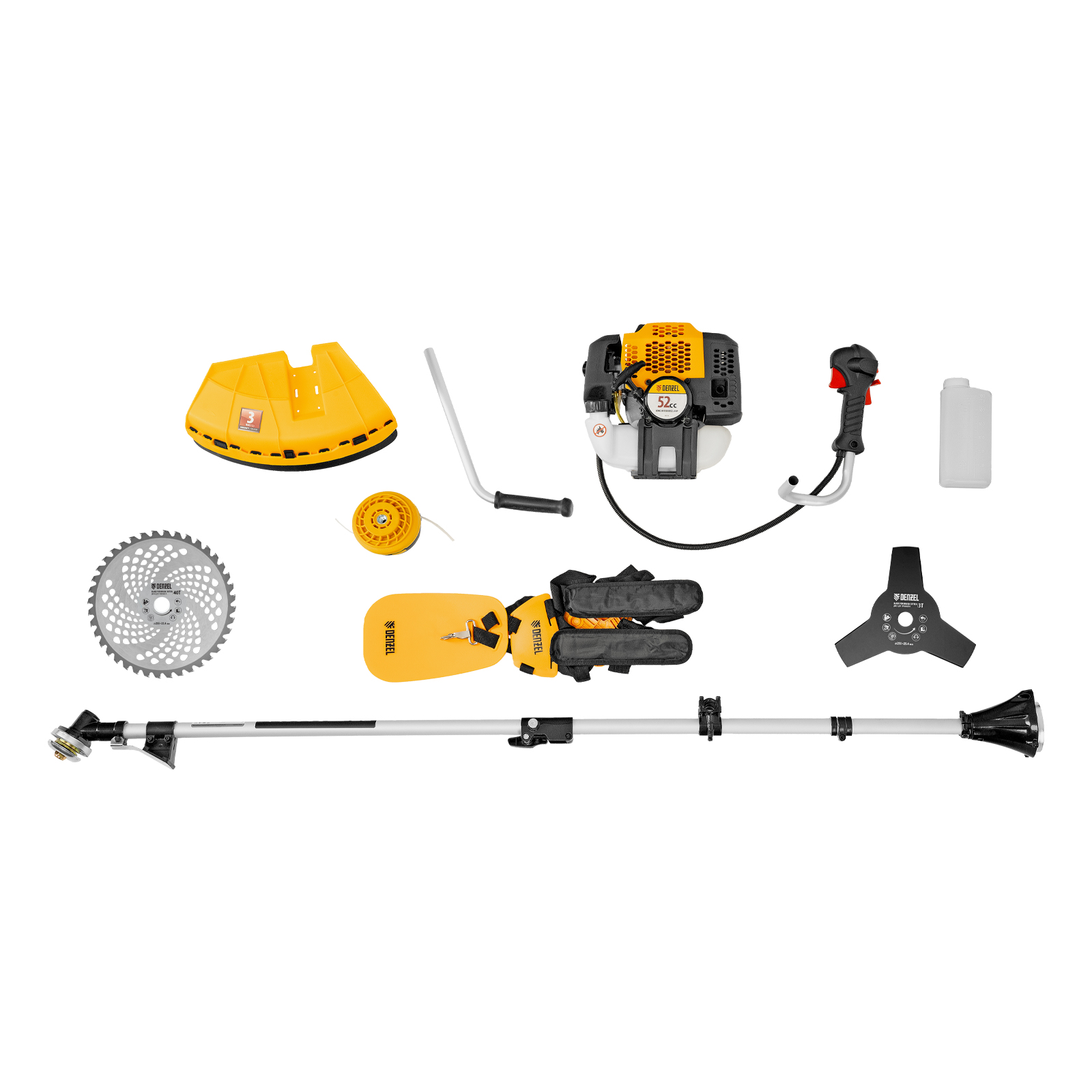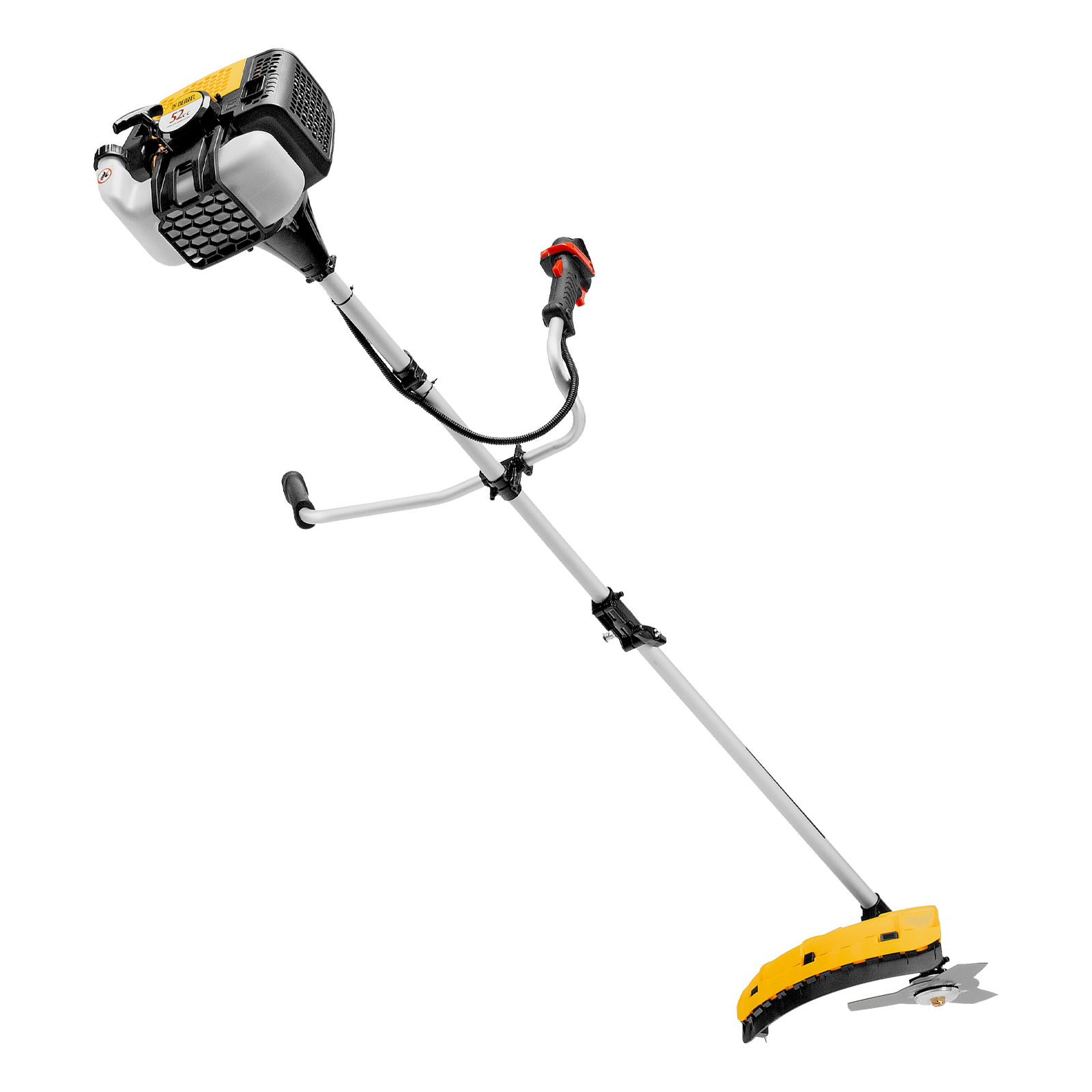 Бензиновый триммер Denzel DGT-520S 96239 с двигателем объемом 52 см3 мощностью 3 л. с., с разъемной штангой, состоит из 2 частей. Скашивает газонную траву, растительность с жесткими и древовидными стеблями (полынь, крапиву, лебеду, борщевик), подходит для срезания кустарника и молодых побегов деревьев с диаметром стволов до 10 мм. Бензиновый двигатель последнего поколения объемом 52 куб. см обеспечивает маневренность и уверенную работу даже в самых труднодоступных местах. Скорость вращения оснастки составляет 9500 об/мин. Ширина прохода диском составляет 255 см, а леской — 420 см, что позволяет обработать большой участок за короткое время.,Триммер работает на смеси бензина с маслом, а потому использовать его можно вдали от дома, независимо от источников электроэнергии. В комплект поставки входит удобный дозатор для приготовления топливной смеси.
