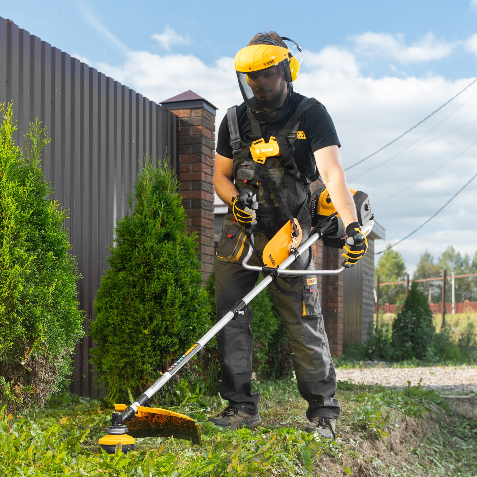 - Комфортная работа — плечевой ремень с защитой бедра снимает нагрузку с рук оператора, регулировка ремня по росту снимает проблему удержания триммера для высоких людей.