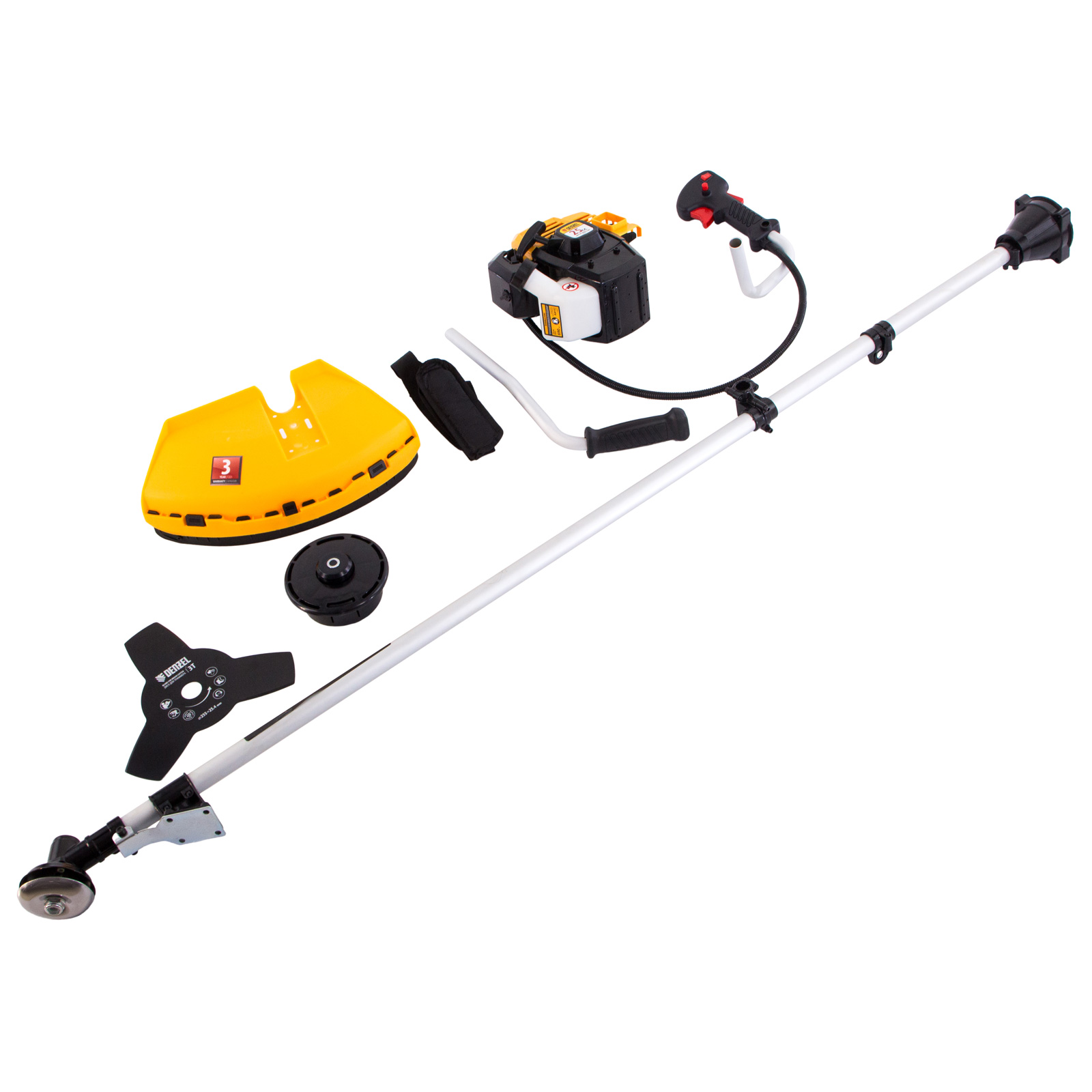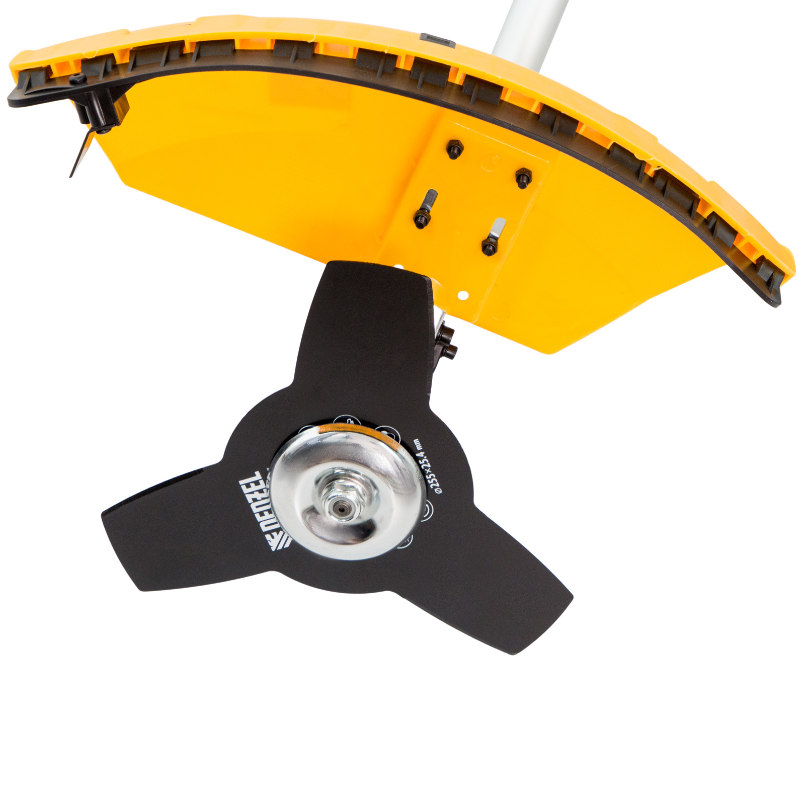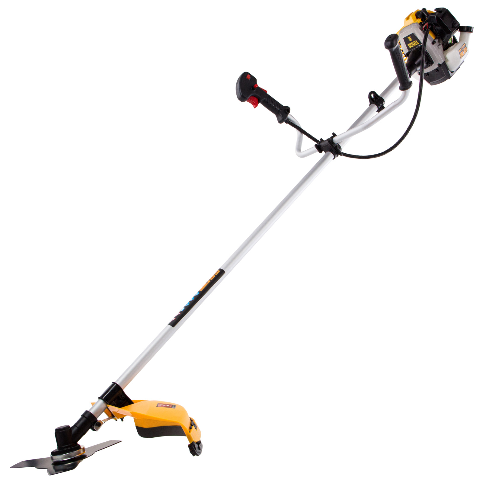 - Дополнительные возможности — можно приобрести диск Denzel 96323 с шириной скашивания 230 мм для быстрого удаления растительности с жесткими стеблями, 96328 для скашивания молодых побегов кустарника диаметром до 3 мм, 96340 для срезания борщевика, кустарника и молодых побегов деревьев с диаметром стволов до 10 мм.