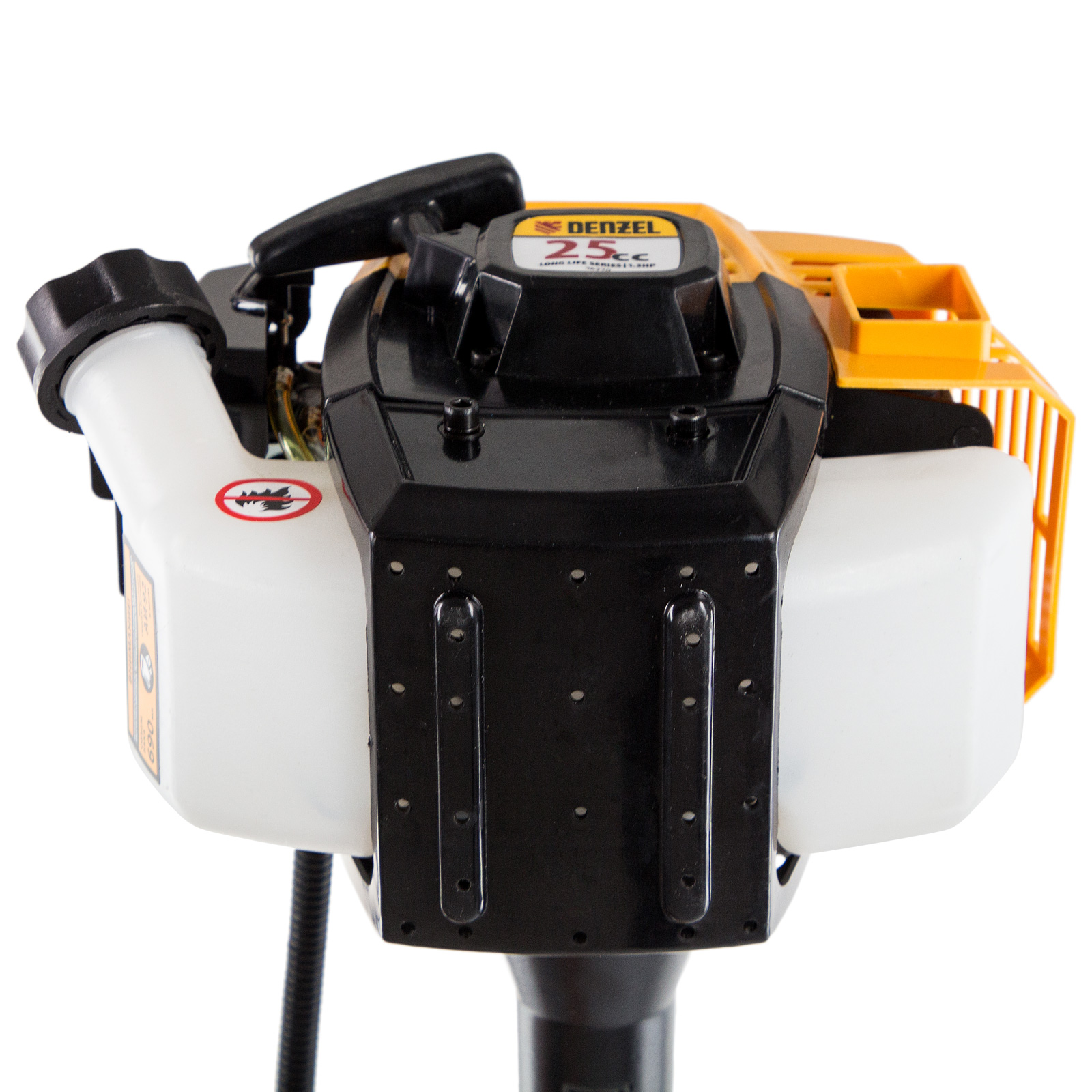 Бензиновый триммер Denzel DR-25 96270 с двигателем объемом 25 см3 и неразъемной штангой состоит из 2 частей. Срезает траву и растительность с жесткими стеблями (полынь, крапиву, лебеду) на обширной территории, включая труднодоступные места вдоль стен дома, заборов, вокруг насаждений. В качестве режущей оснастки используется стальной трехлопастный нож и усиленная катушка из полиамида с леской. Скорость их вращения составляет 9500 об/мин, а ширина скашивания — 25,5 см и 42 см. Одноцилиндровый двухтактный двигатель мощностью 1,3 л.с. работает на смеси бензина с маслом. В комплект поставки входит удобный дозатор для приготовления топлива, что облегчает обслуживание триммера. Благодаря отсутствию сетевого кабеля триммер может использоваться вдали от дома.