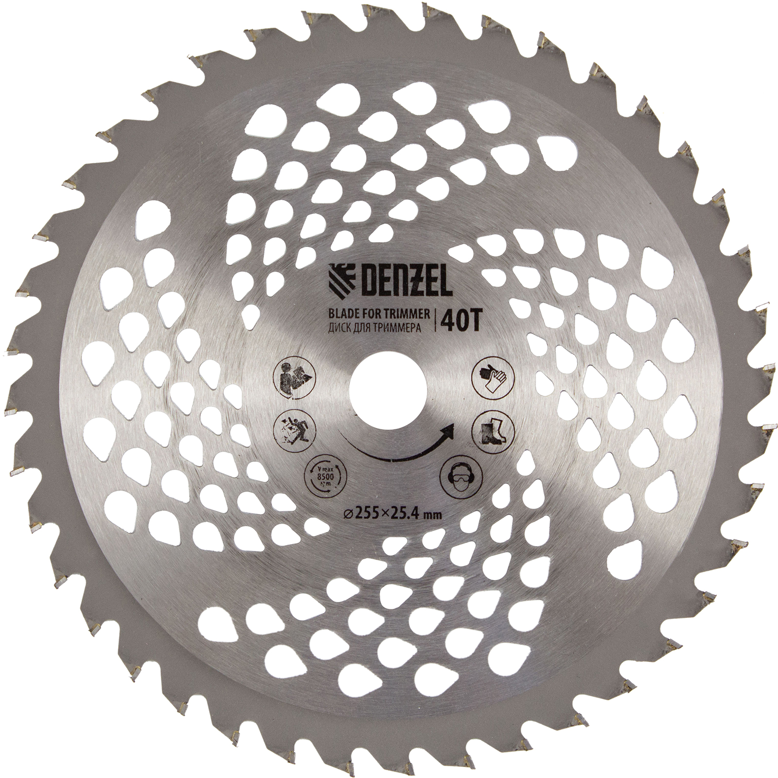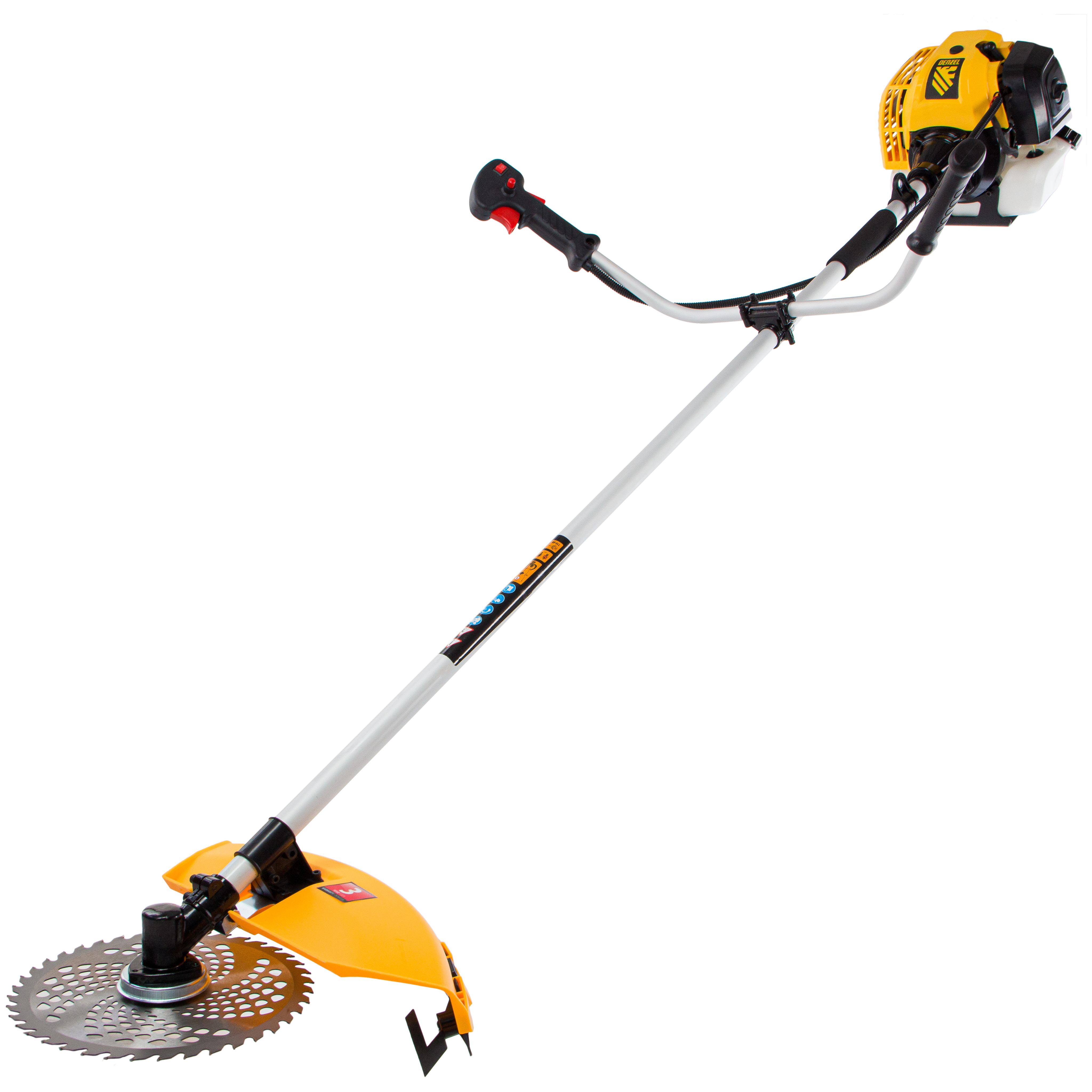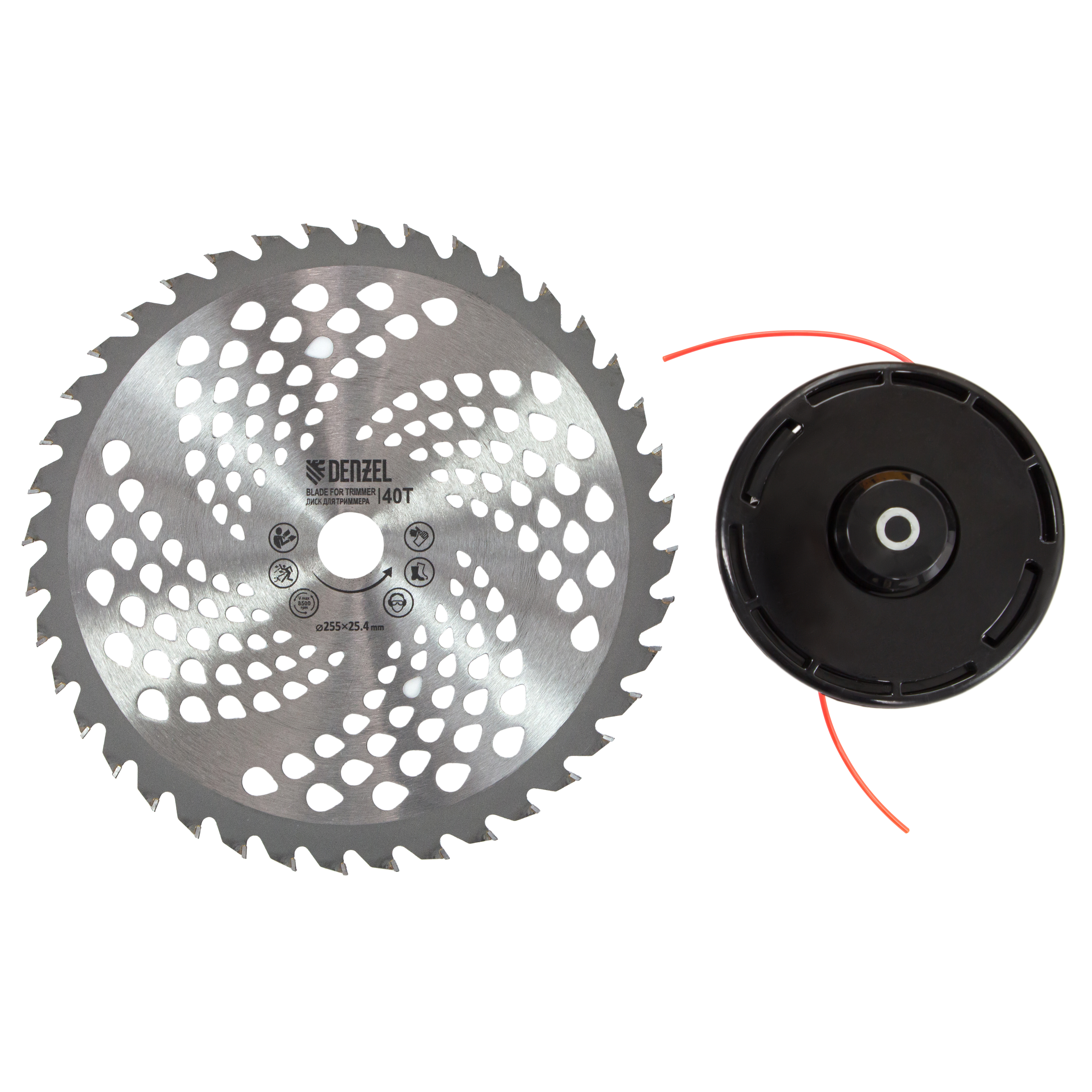 - Дополнительные возможности — можно приобрести диски Denzel 96323, 96325 для быстрого удаления растительности с жесткими стеблями, 96328 для скашивания молодых побегов кустарника диаметром до 3 мм.