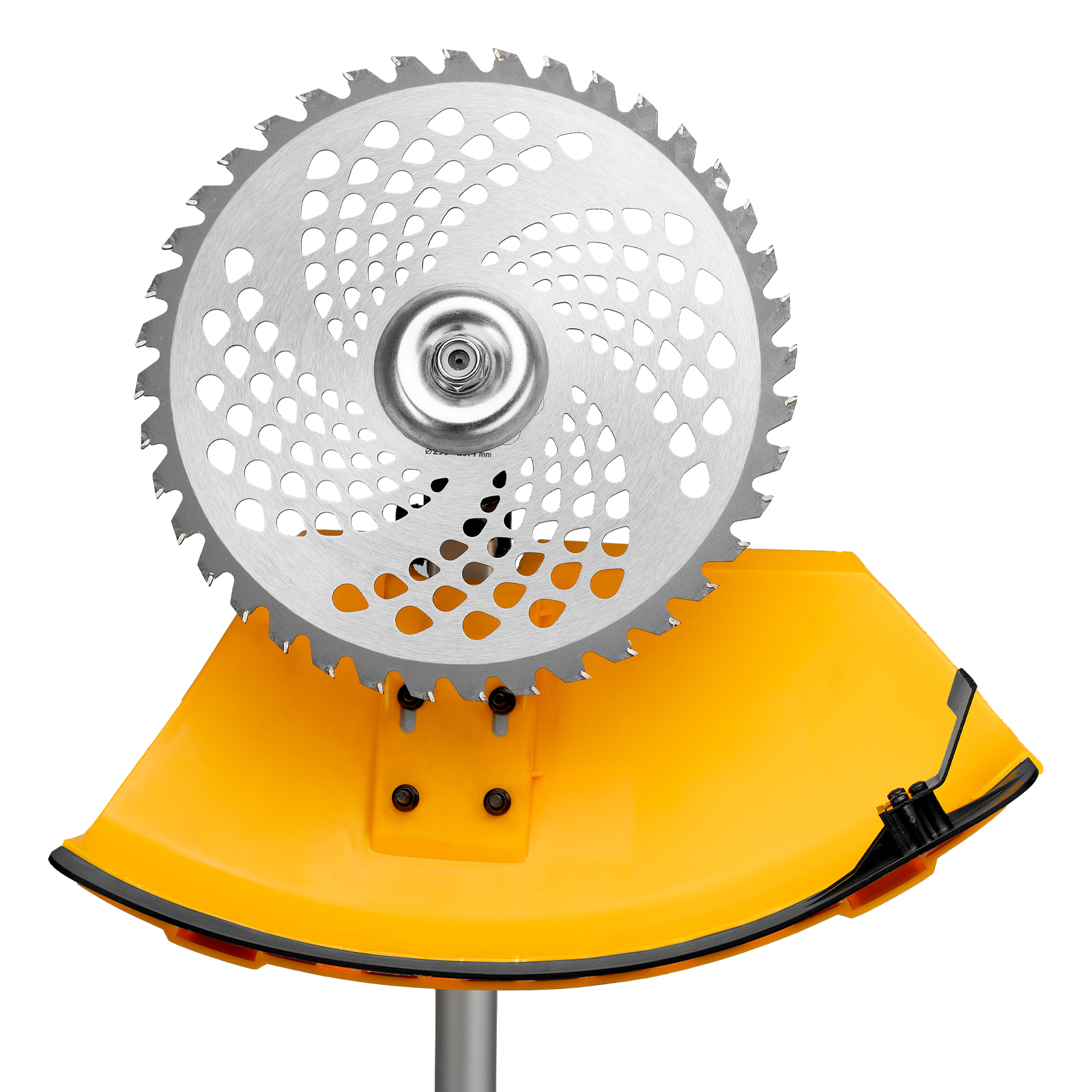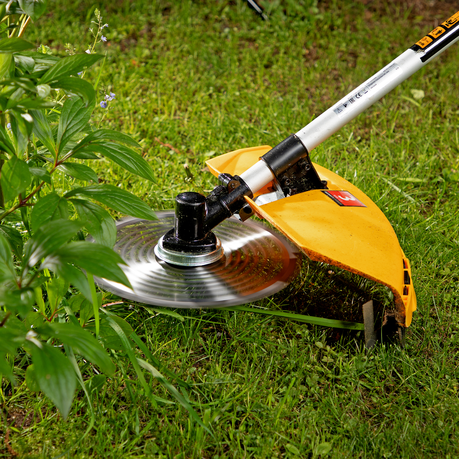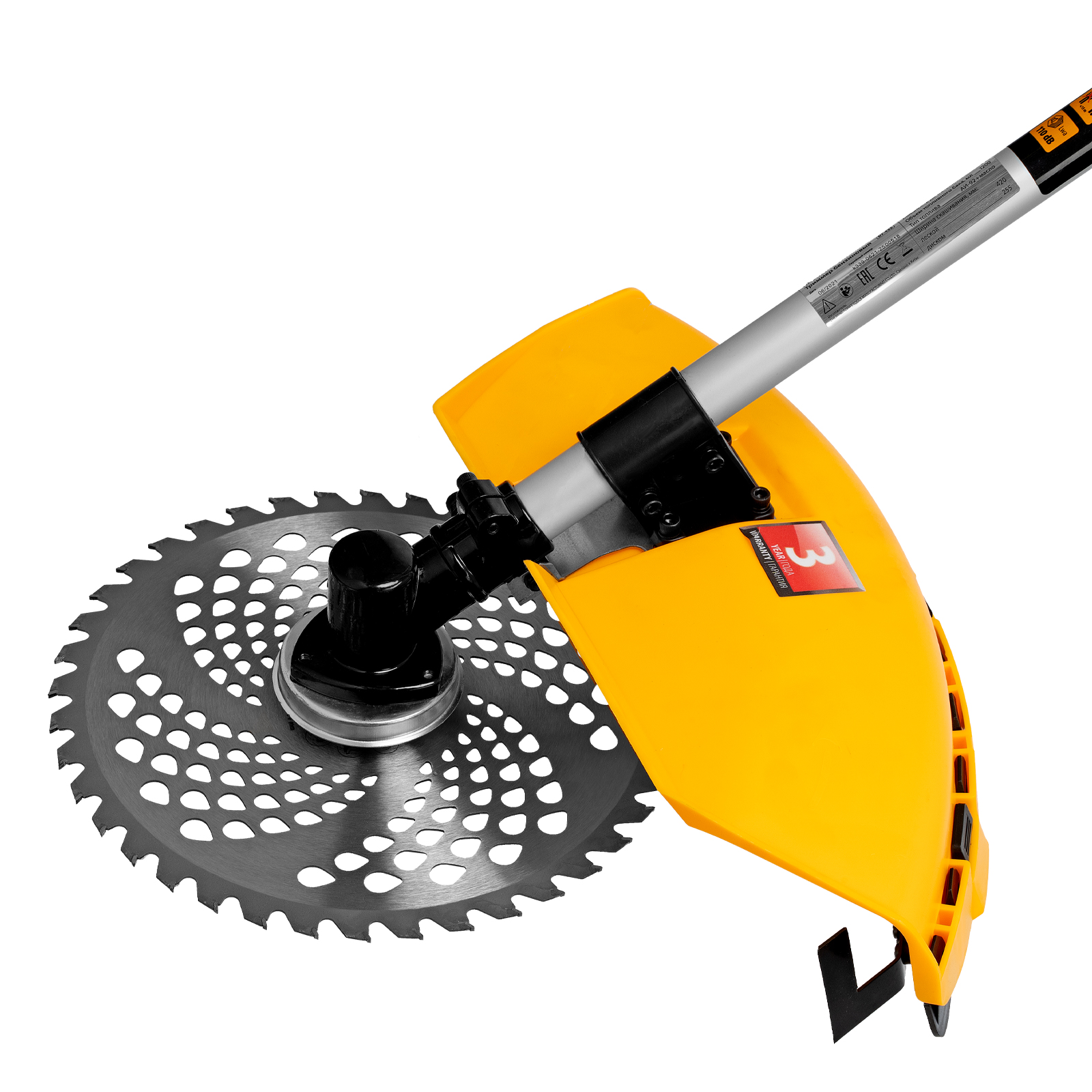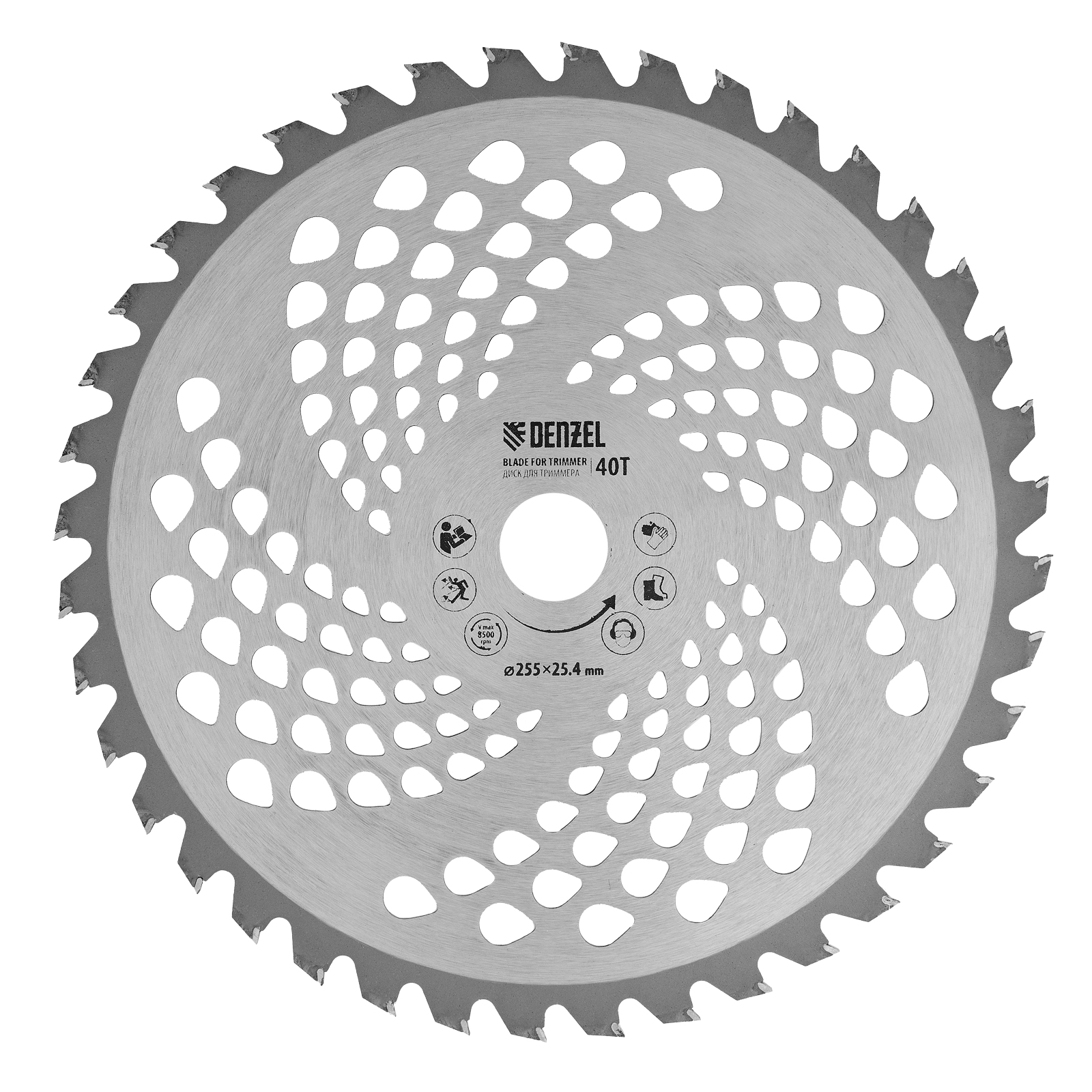 Дополнительные возможности — можно приобрести диски Denzel 96323, 96325 для быстрого удаления растительности с жесткими стеблями (полыни, крапивы, лебеды) или 96328 для скашивания молодых побегов кустарника диаметром до 3 мм.