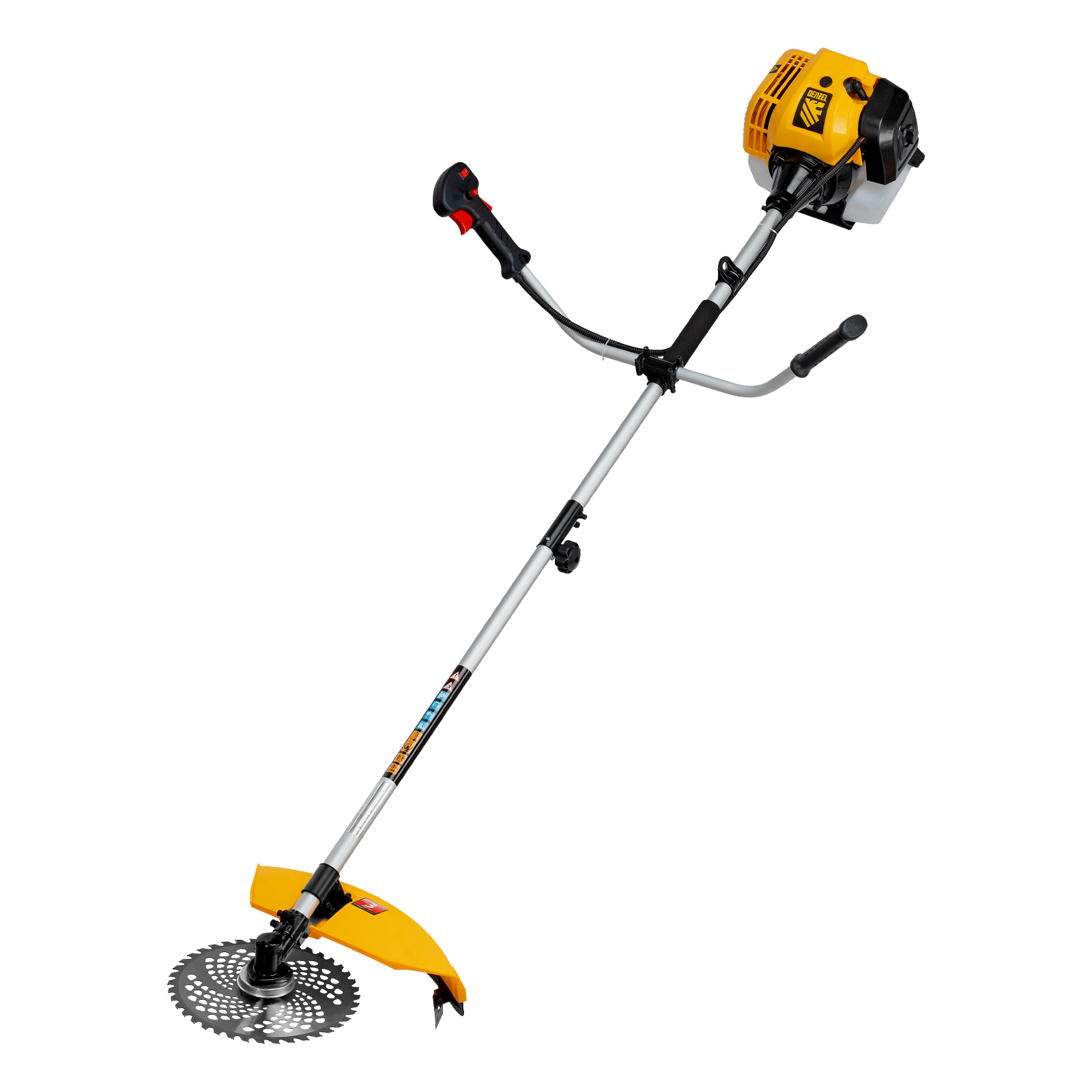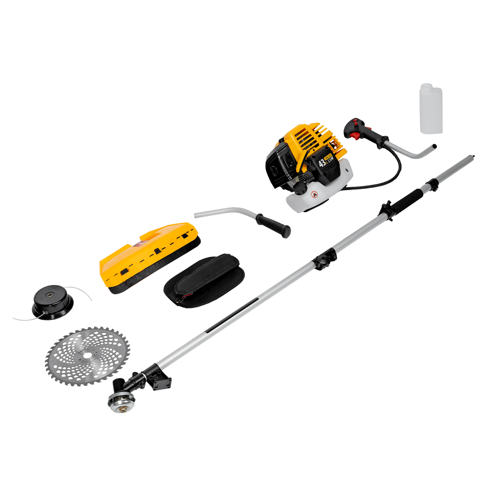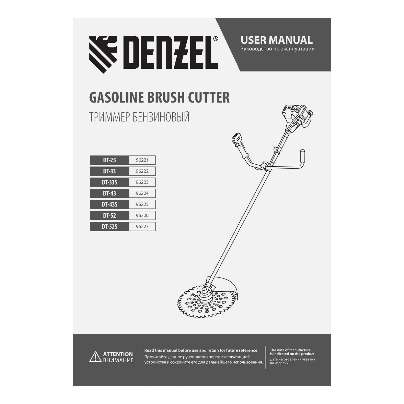 Бензиновый триммер Denzel DT-43S 96225 с двигателем объемом 43 см³ и мощностью 2,5 л.с., с разъемной штангой, состоит из 2 частей. Используется для подравнивания газона, скашивания травы всех типов, в том числе с жесткими древовидными стеблями (полыни, крапивы, лебеды, борщевика), а также срезания кустарника и молодых побегов деревьев с диаметром стволов до 10 мм. Это оптимальный вариант для работы в труднодоступных местах: вокруг насаждений, вдоль садовых дорожек, возле стен дома и т. д. Мощный двухтактный двигатель обеспечивает высокую частоту вращения оснастки 9500 об/мин. Ширина скашивания диском составляет 25,5 см, леской — 42 см.