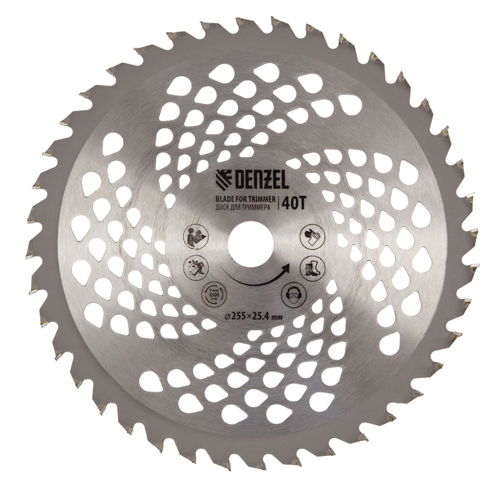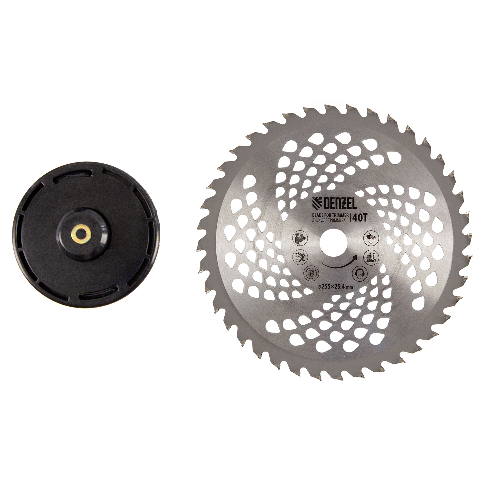 - Дополнительные возможности — можно приобрести диски Denzel 96323, 96325 для быстрого удаления растительности с жесткими стеблями, 96328 для скашивания молодых побегов кустарника диаметром до 3 мм.