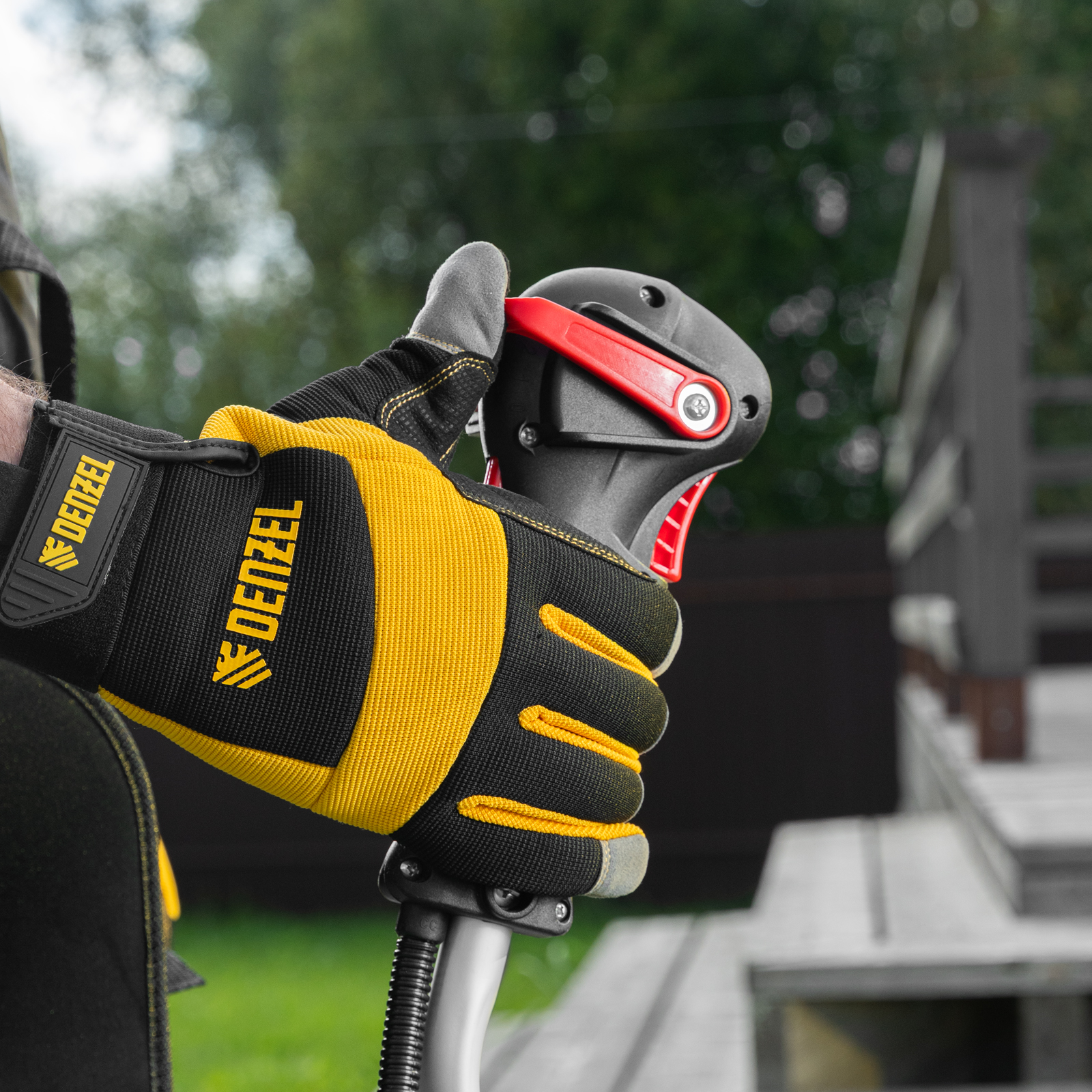 - Дополнительные возможности — можно приобрести и установить на триммер диски Denzel 96323, 96325 для быстрого удаления растительности с жесткими стеблями (полыни, крапивы, лебеды), 96328 для скашивания молодых побегов кустарника диаметром до 3 мм.