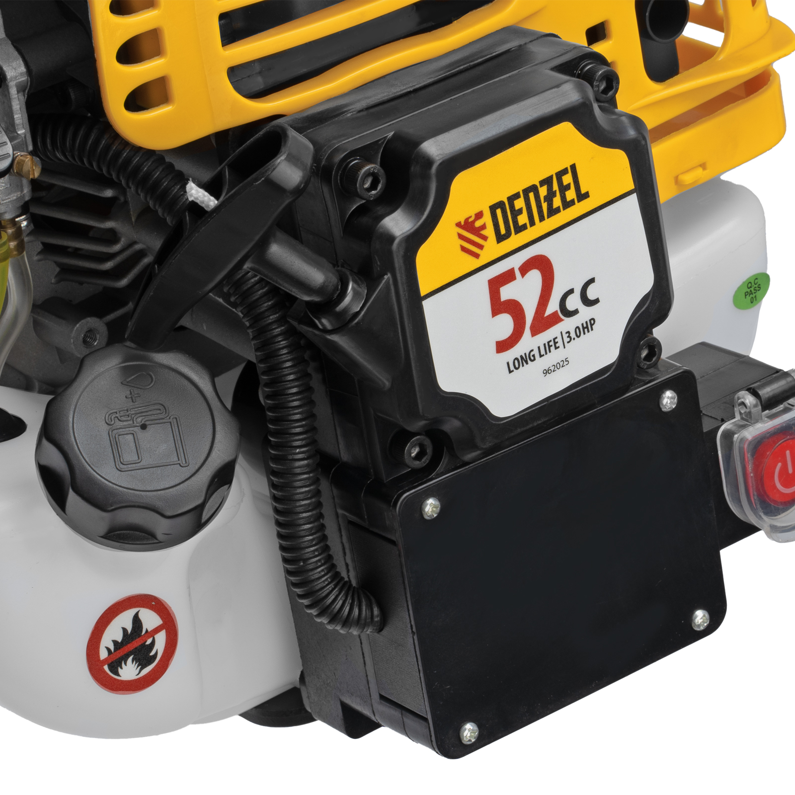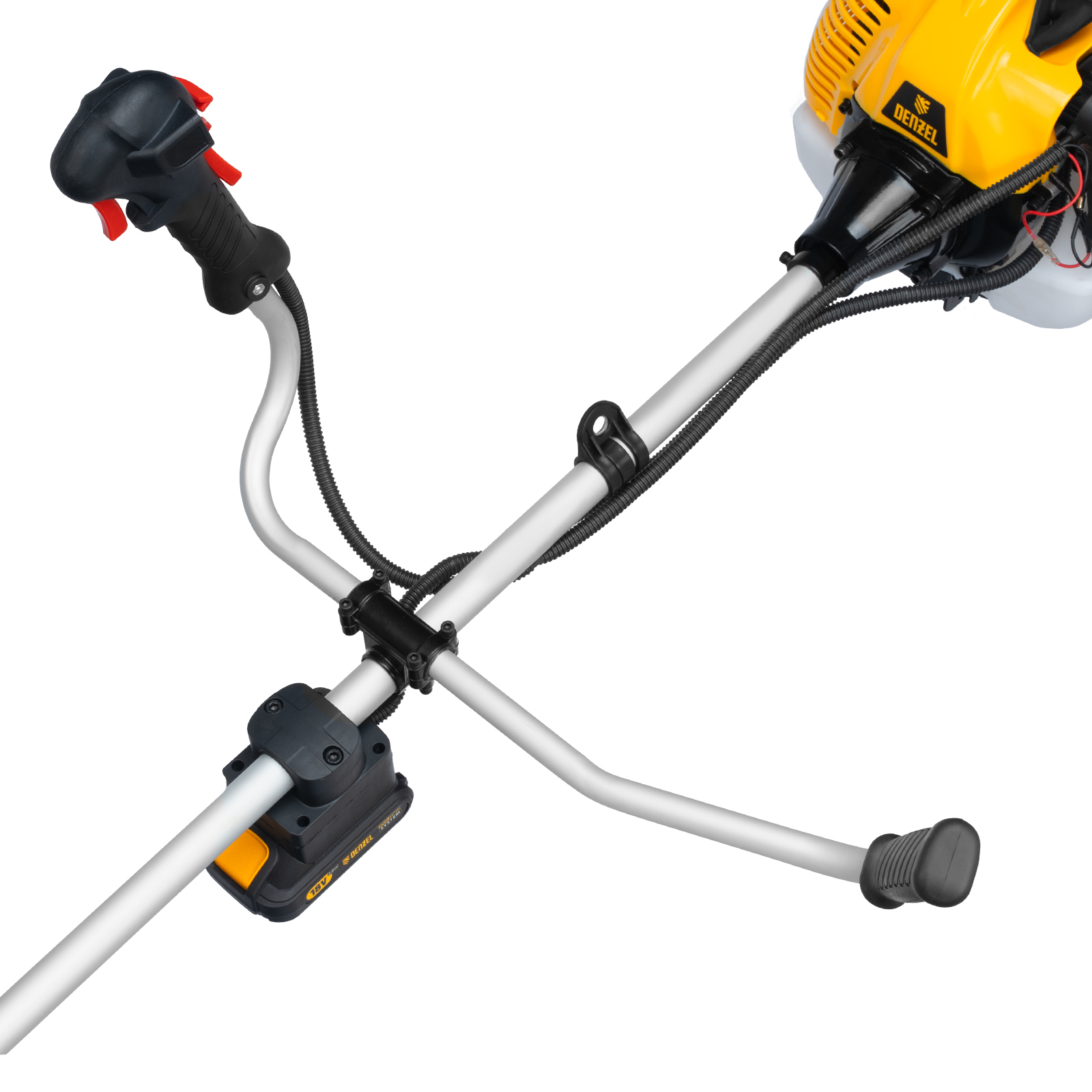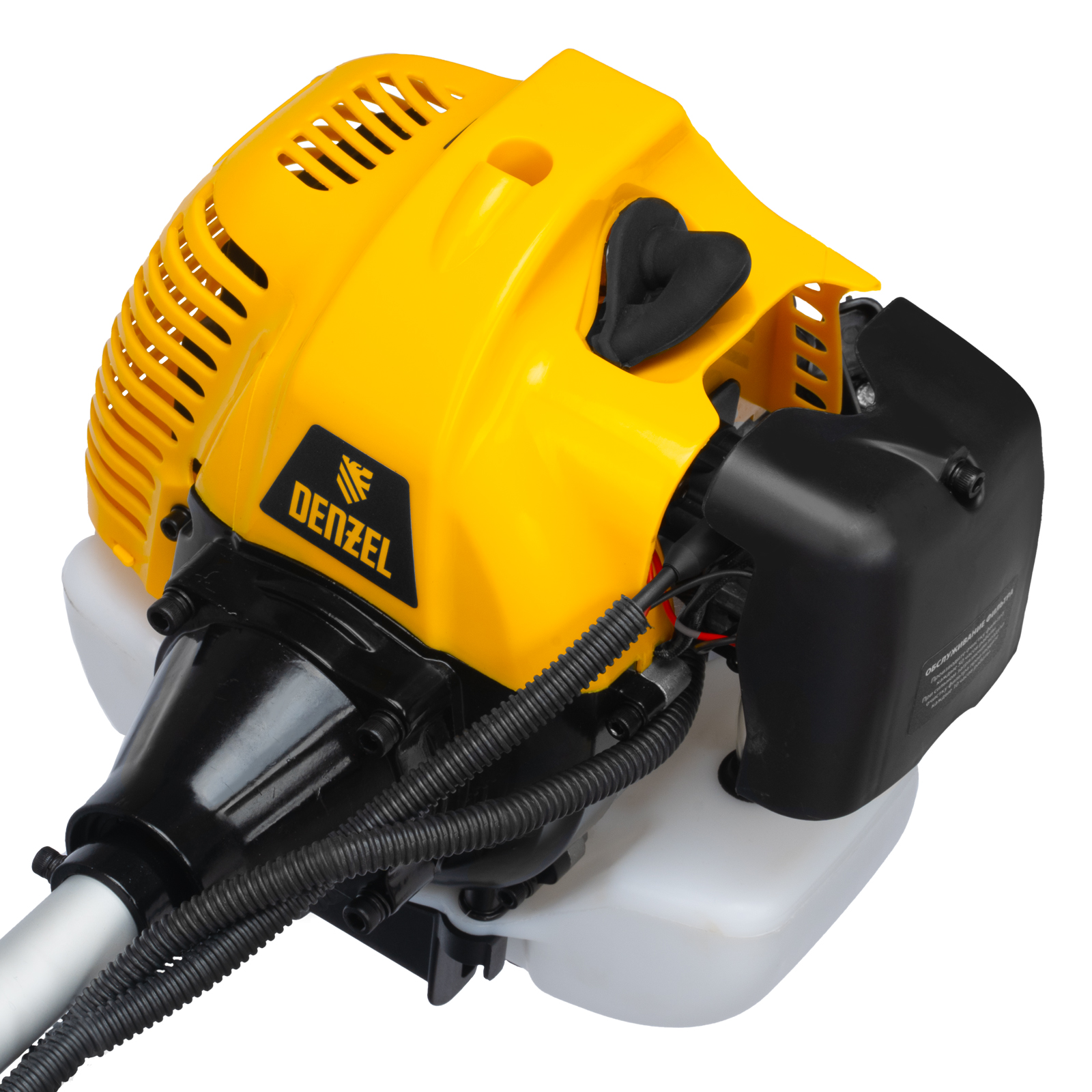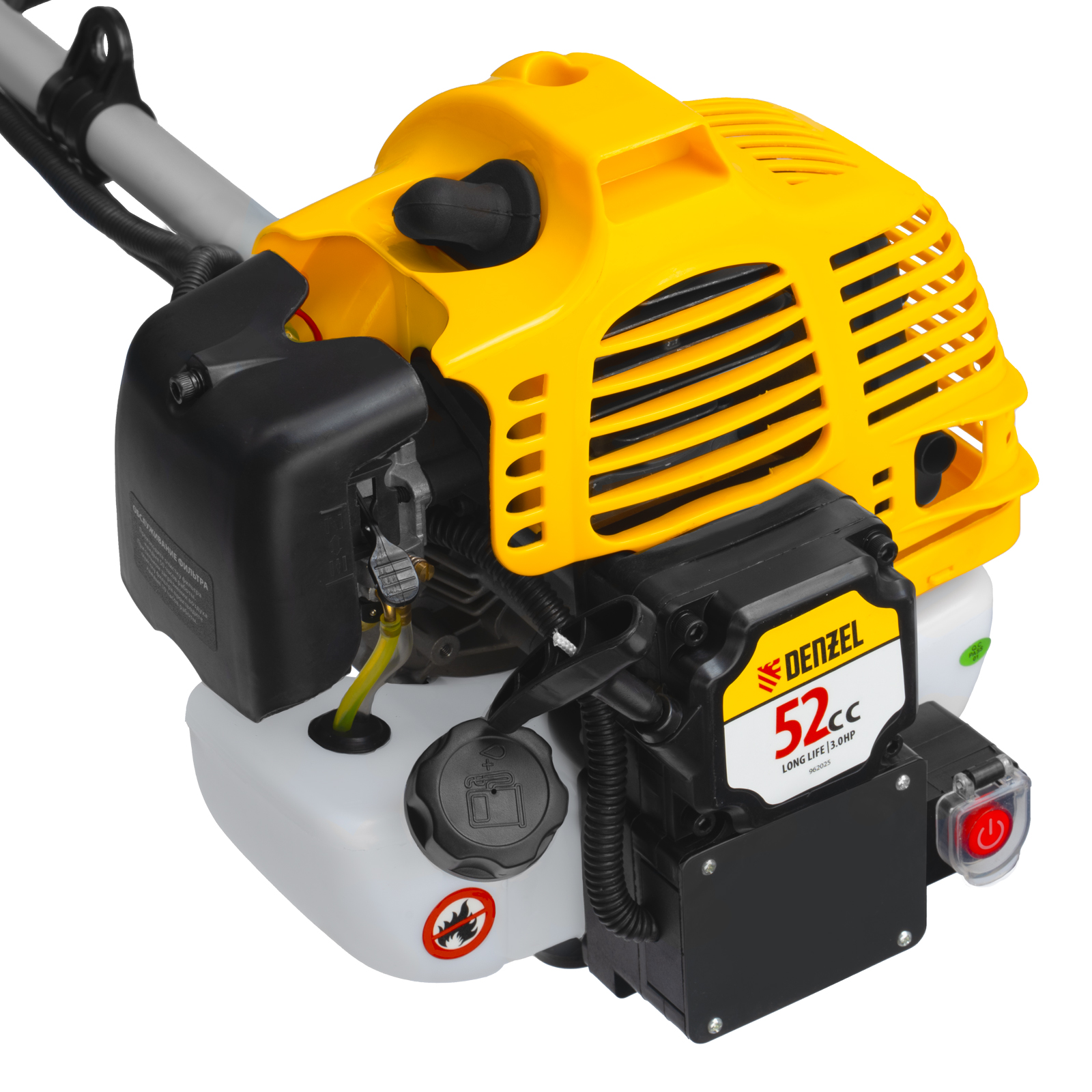 Бензиновый триммер Denzel DT-52E 962025 с двигателем объемом 52 куб. см, с неразъемной штангой и электростартером, поставляется комплектом из 2 частей и используется для ухода за дачным участком. С его помощью можно подравнять газон, скосить траву любого типа, в том числе с жесткими древовидными стеблями (полынь, крапива, лебеда, борщевик), а также срезать кустарник и молодые побеги деревьев с диаметром стволов до 10 мм. Триммер успешно справляется с этими задачами благодаря входящим в комплект катушке с леской и пильному диску с шириной скашивания 42 и 25,5 см соответственно. На штангу уже установлен редуктор и корпус сцепления, что упрощает подготовку инструмента к работе.
