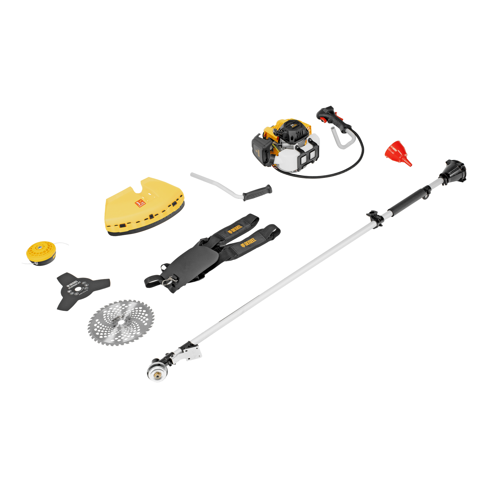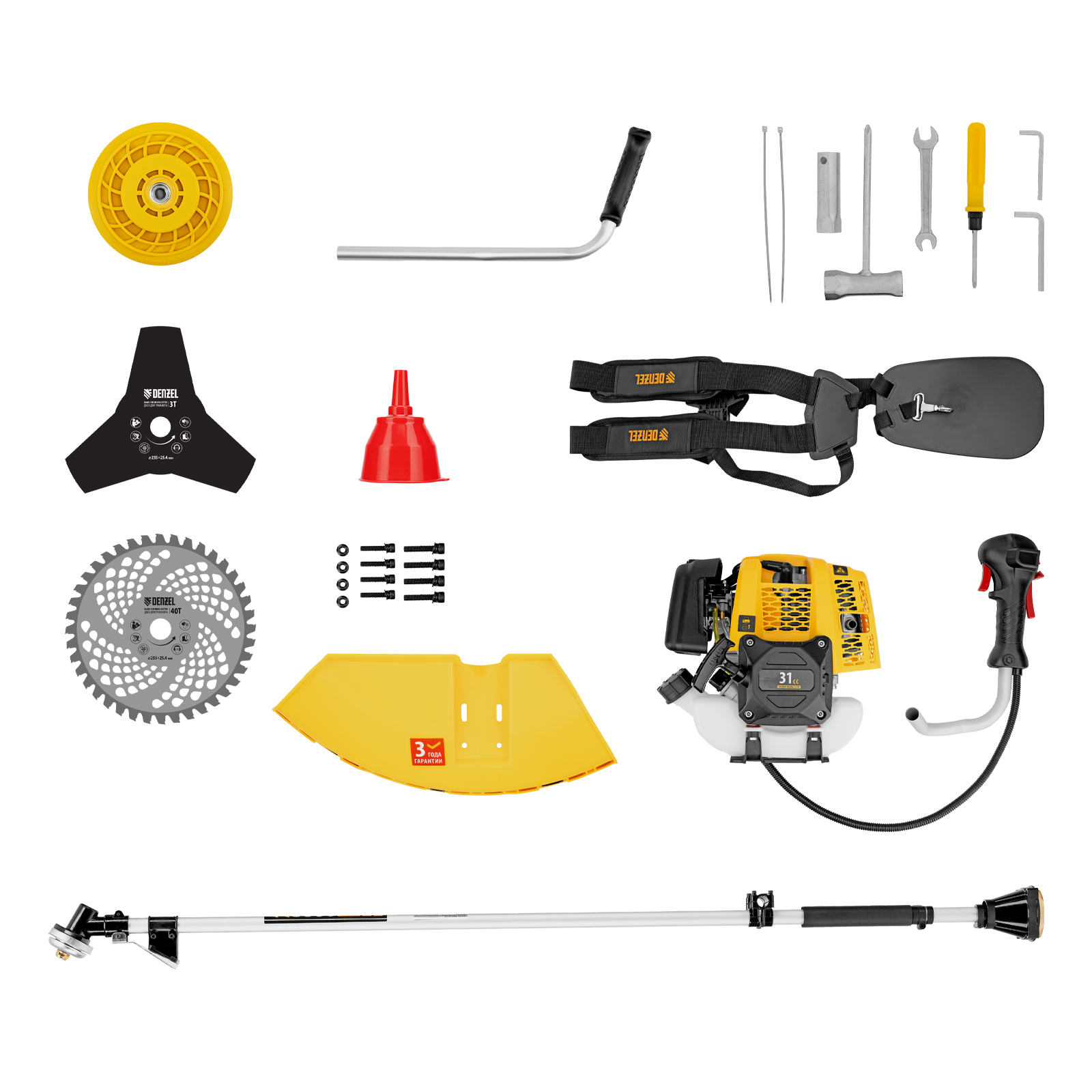 Триммер бензиновый - 1 штКатушка - 1 штНож трехлопастной 3Т - 1 штПильный диск 40Т - 1 штДвухплечевая подвесная система с защитой бедра - 1 штДозатор для приготовления смеси - 1 штНабор крепежа - 1 штНабор инструментов - 1 штРуководство по эксплуатации с гарантийным талоном - 1 штЛеска диаметром 2 мм - 1 шт