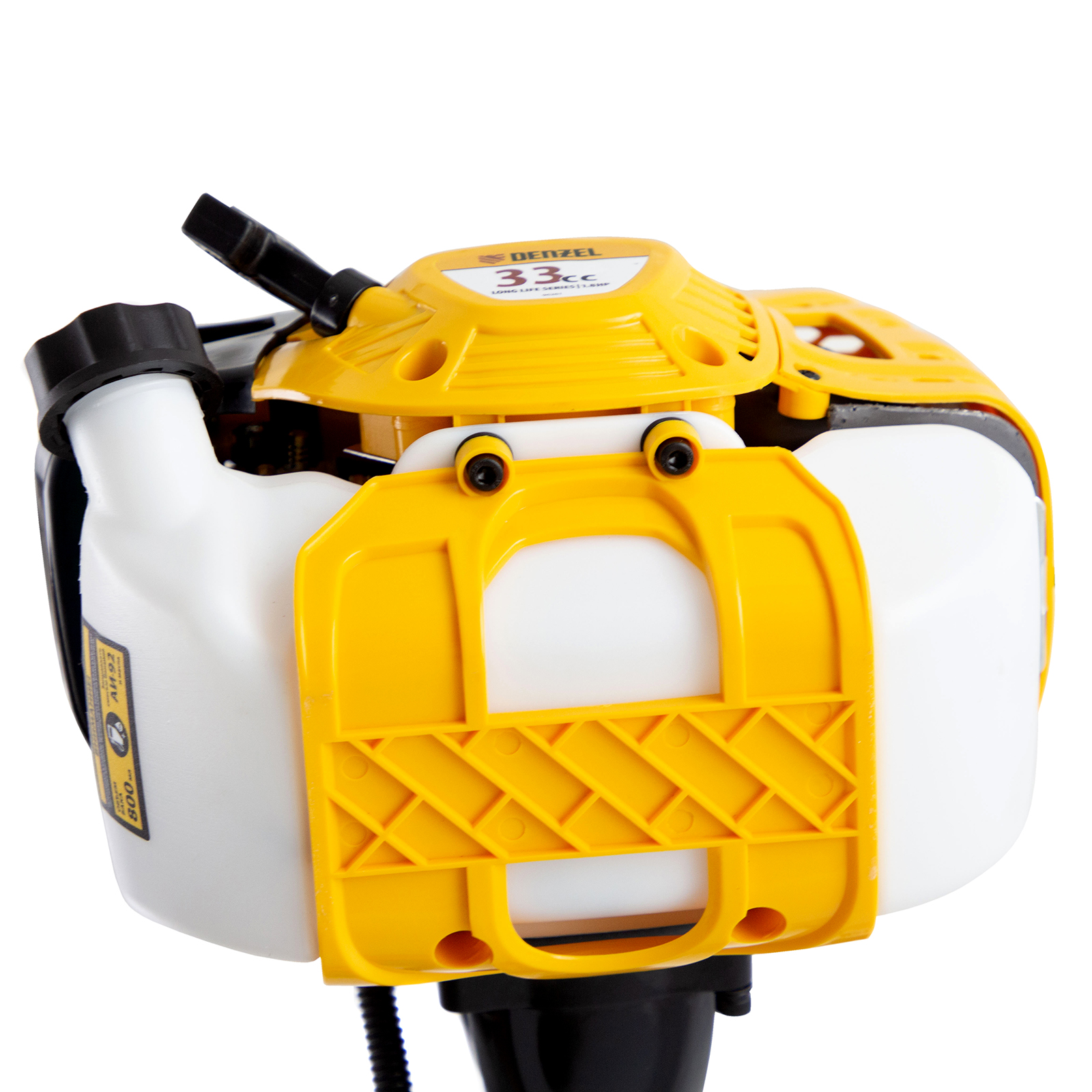 Бензиновый триммер Denzel DTL-33 96261 с объемом двигателя 33 см3 и неразъемной штангой подходит как для частичного подравнивания газона, так и скашивания травы всех типов, в том числе с жесткими древовидными стеблями (полыни, крапивы, лебеды, борщевика). Также эффективен для срезания кустарника и молодых побегов деревьев с диаметром стволов до 10 мм. Два режущих инструмента — леска и пильный диск — работают на скорости 9500 об/мин и обеспечивают ширину скашивания 42 и 25,5 см соответственно. Двигатель мощностью 1,8 л.с. экономично потребляет топливо, поэтому часто заправлять бак не придется. Триммер не требует подключения к стационарному источнику питания и может использоваться в самом отдаленном уголке дачного участка.