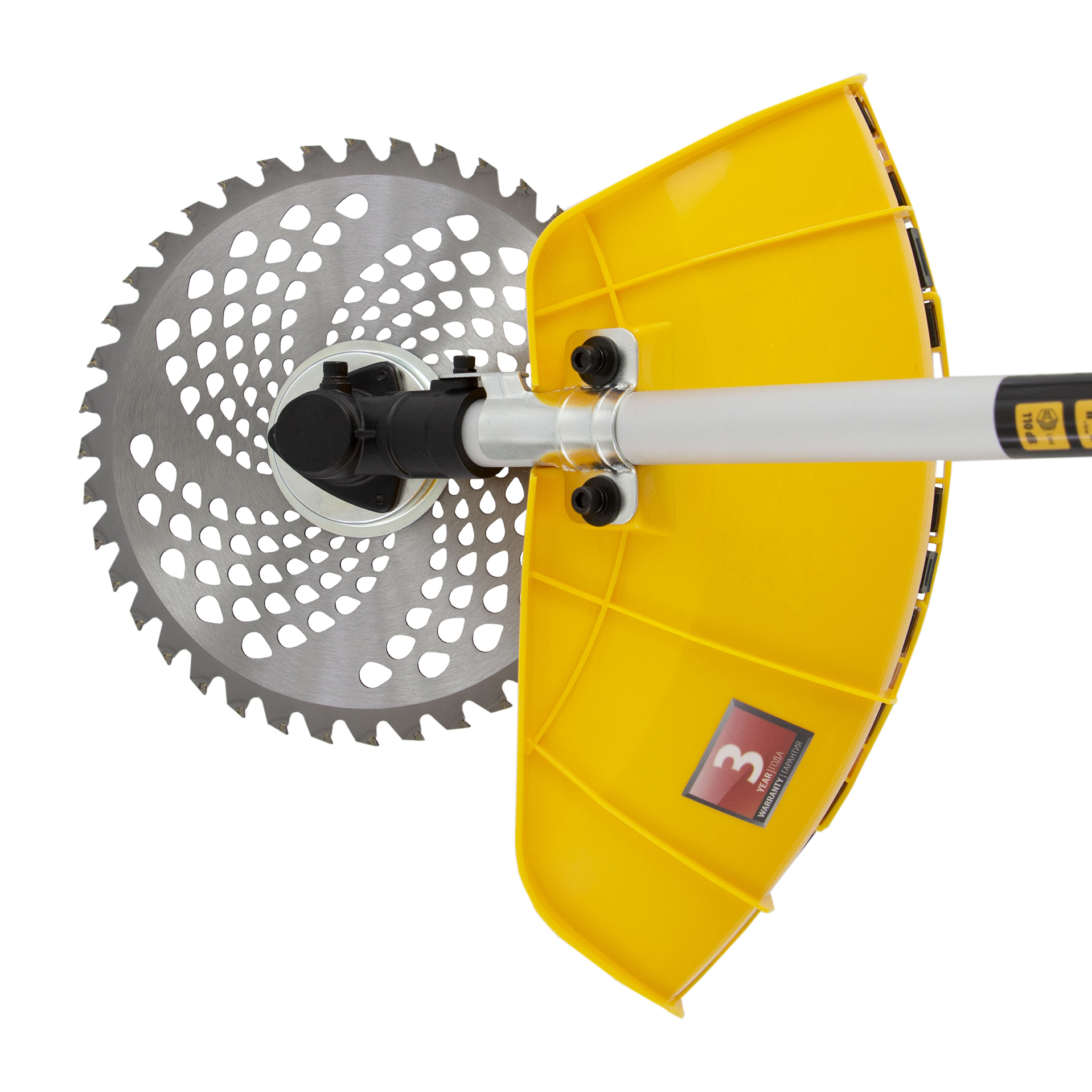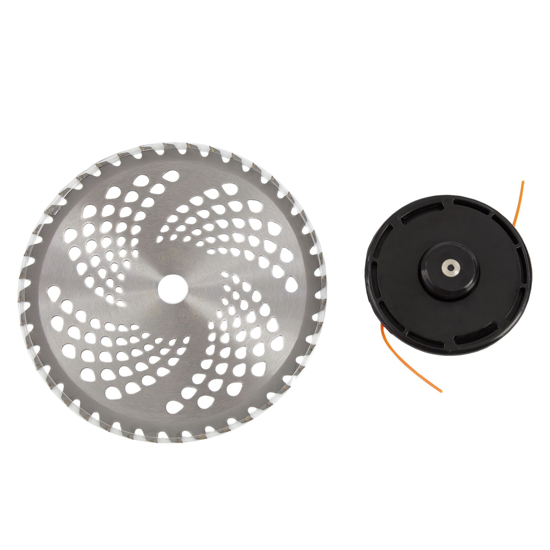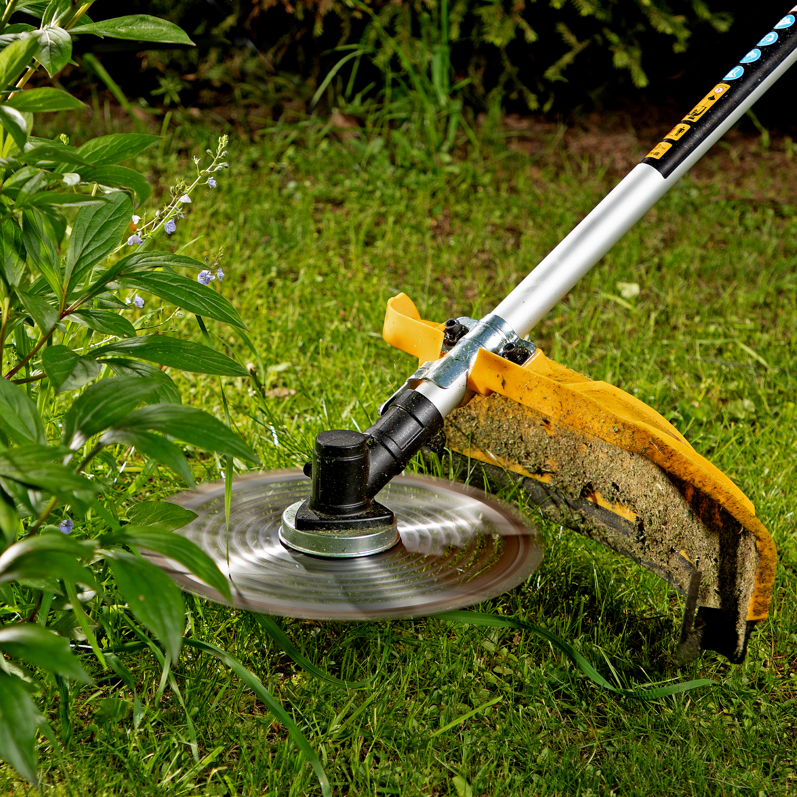 - Дополнительные возможности — можно приобрести и установить на триммер диски Denzel 96323, 96325 для быстрого удаления растительности с жесткими стеблями (полыни, крапивы, лебеды) или 96328 для скашивания молодых побегов кустарника диаметром до 3 мм.