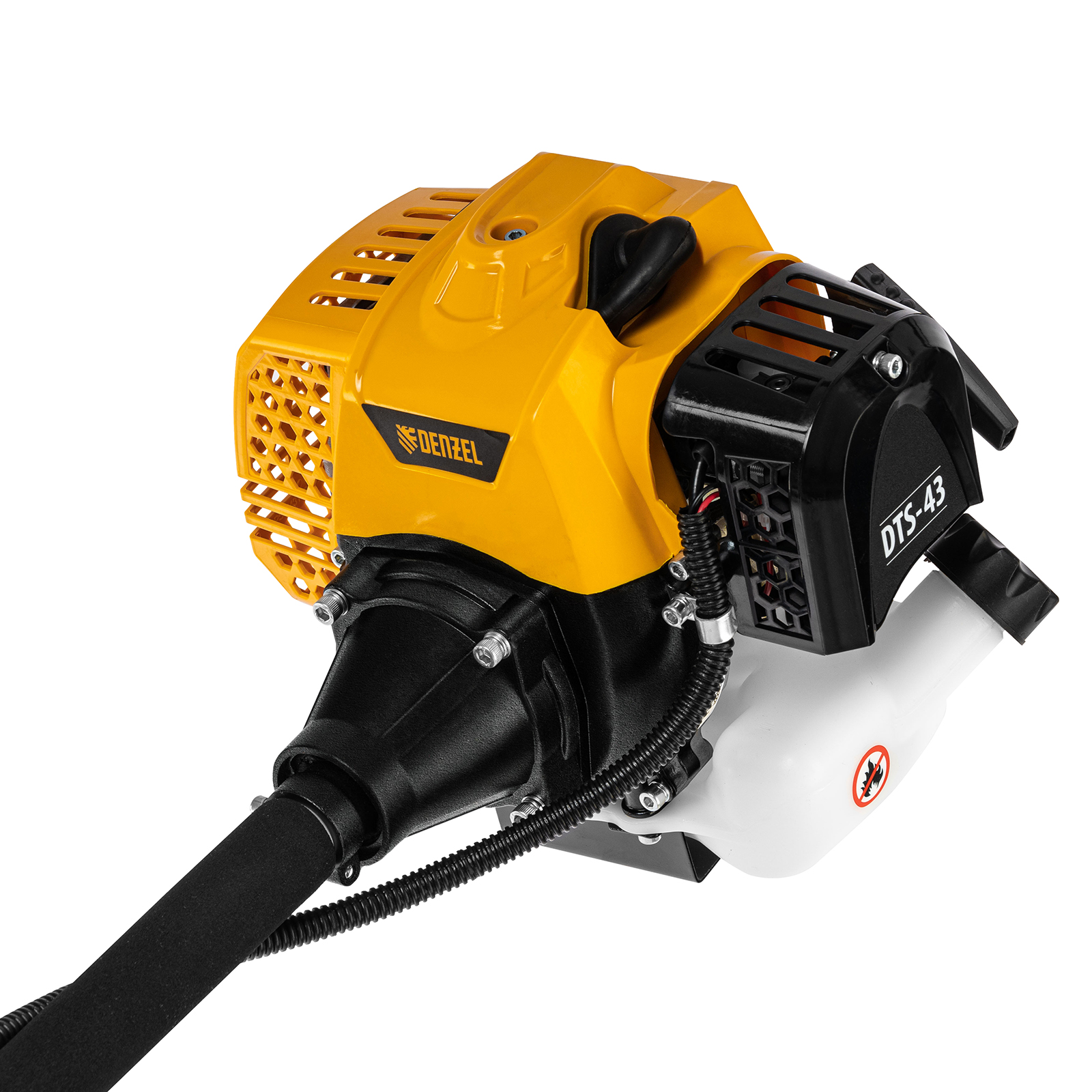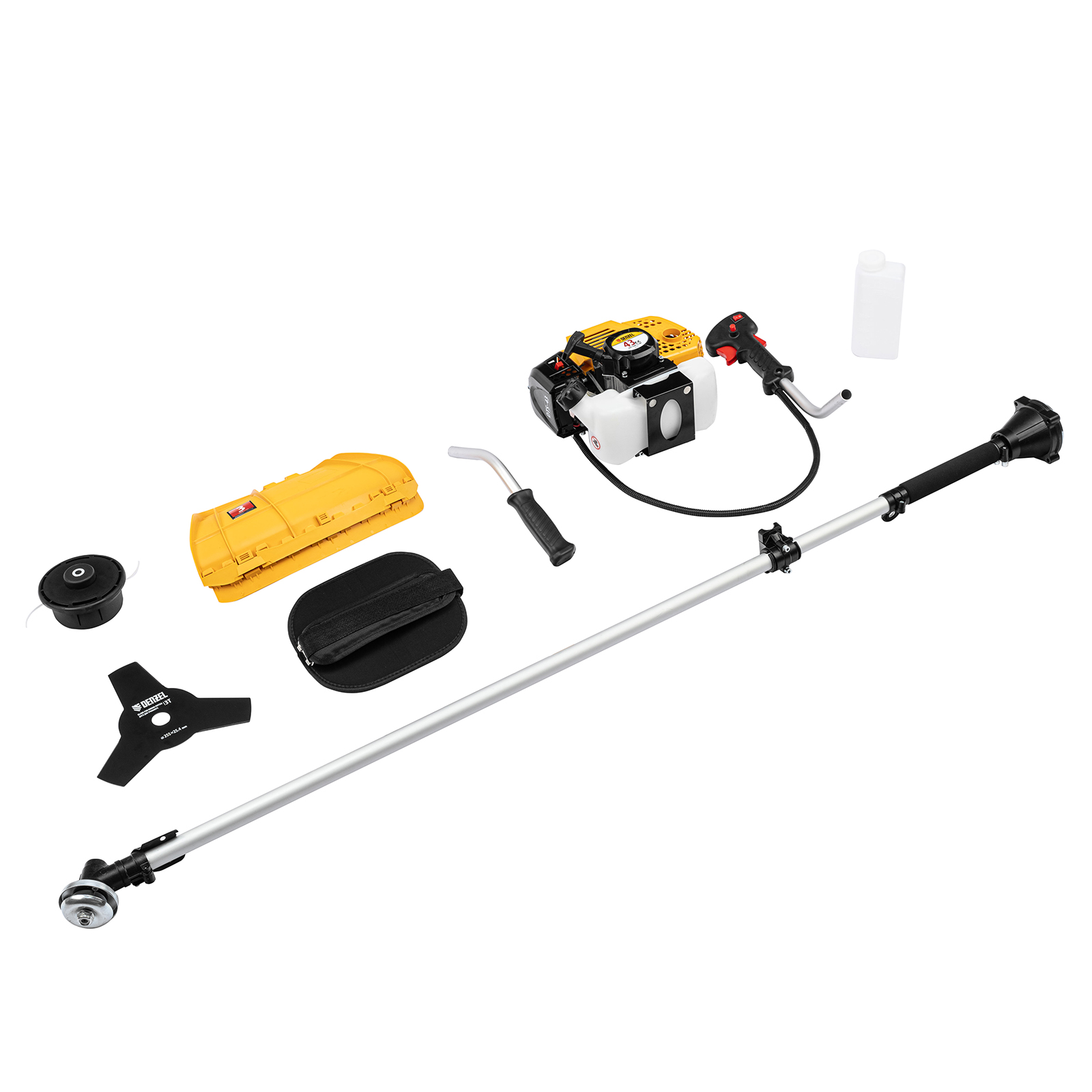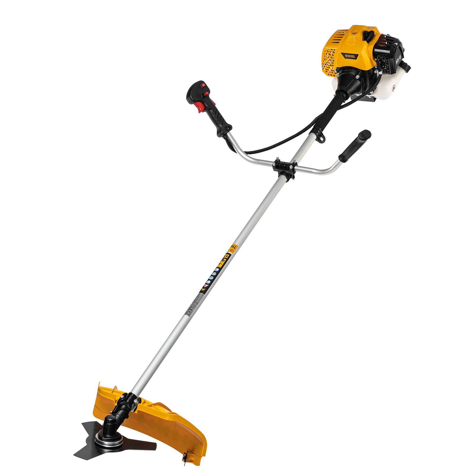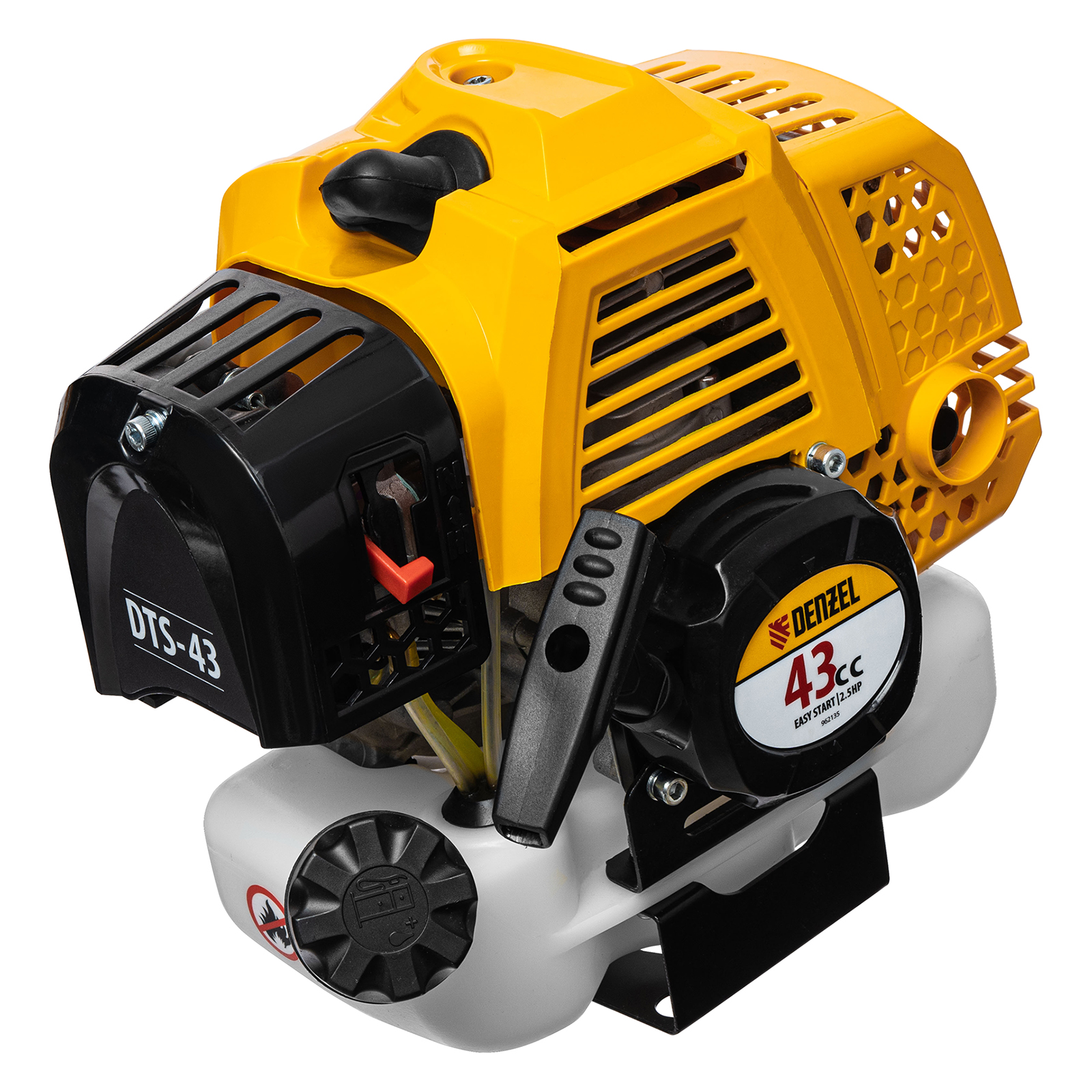 Бензиновый триммер Denzel DTS-43 962135 с двигателем объемом 43 куб. см и неразъемной штангой поставляется комплектом из 2 частей. Усиленная катушка с леской предназначена для скашивания мягкой травы, а трехлопастный нож — для скашивания травы различных типов, в том числе с жесткими стеблями (полыни, крапивы, лебеды). Ширина скашивания леской составляет 42 см, ножом — 25,5 см.,Двухтактный бензиновый двигатель мощностью 2,5 л.с. обеспечивает эффективное решение поставленных задач и полную автономность. Работать можно даже в самых отдаленных участках сада, не заботясь о наличии сети электропитания.