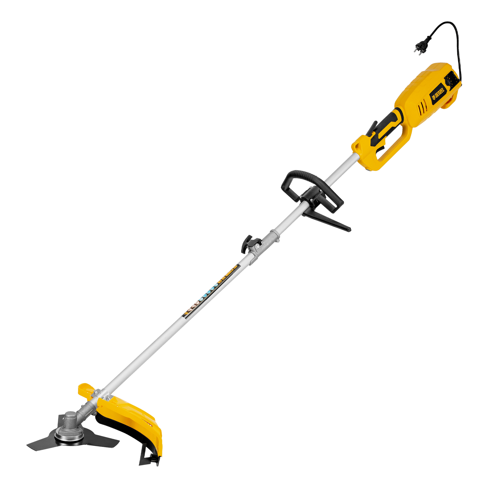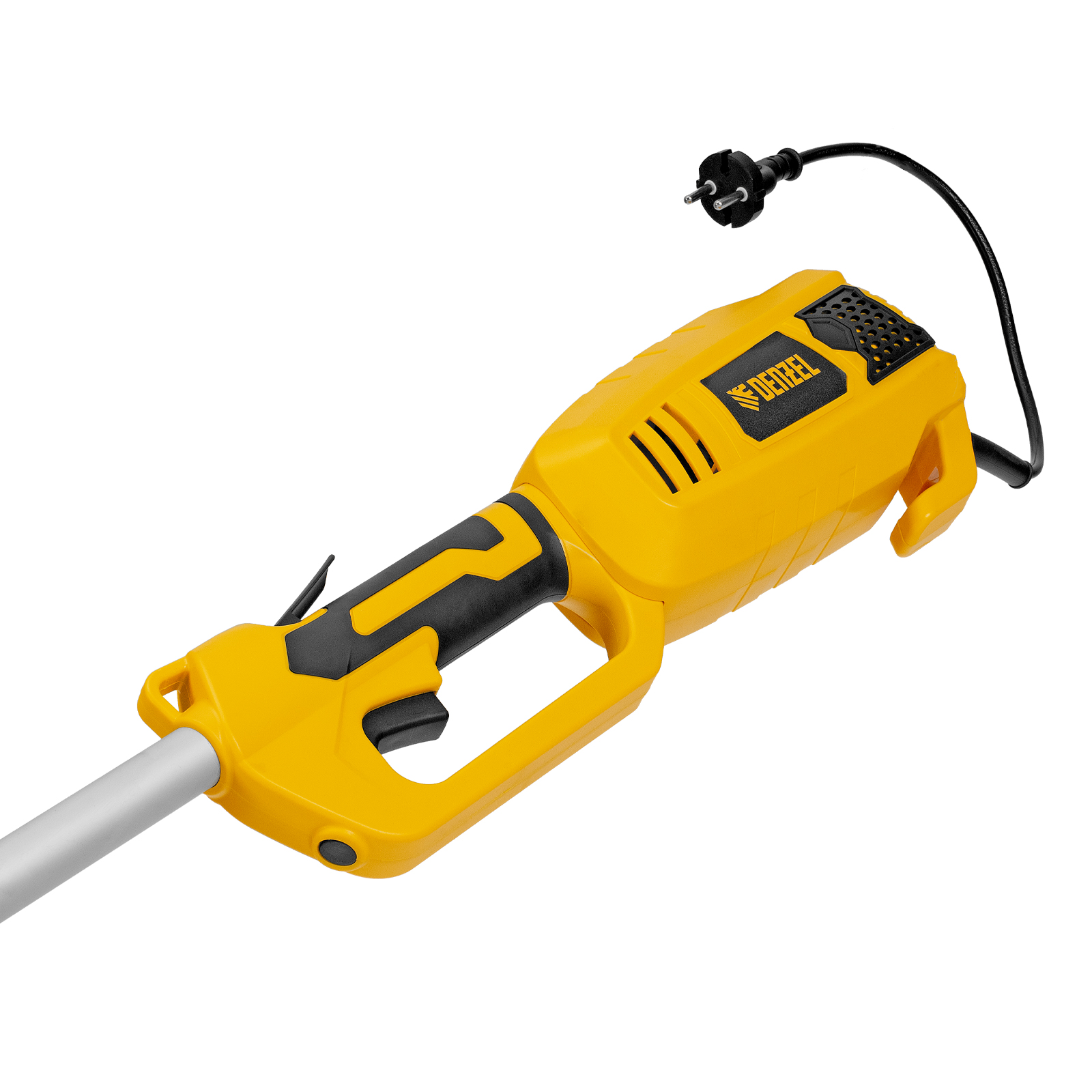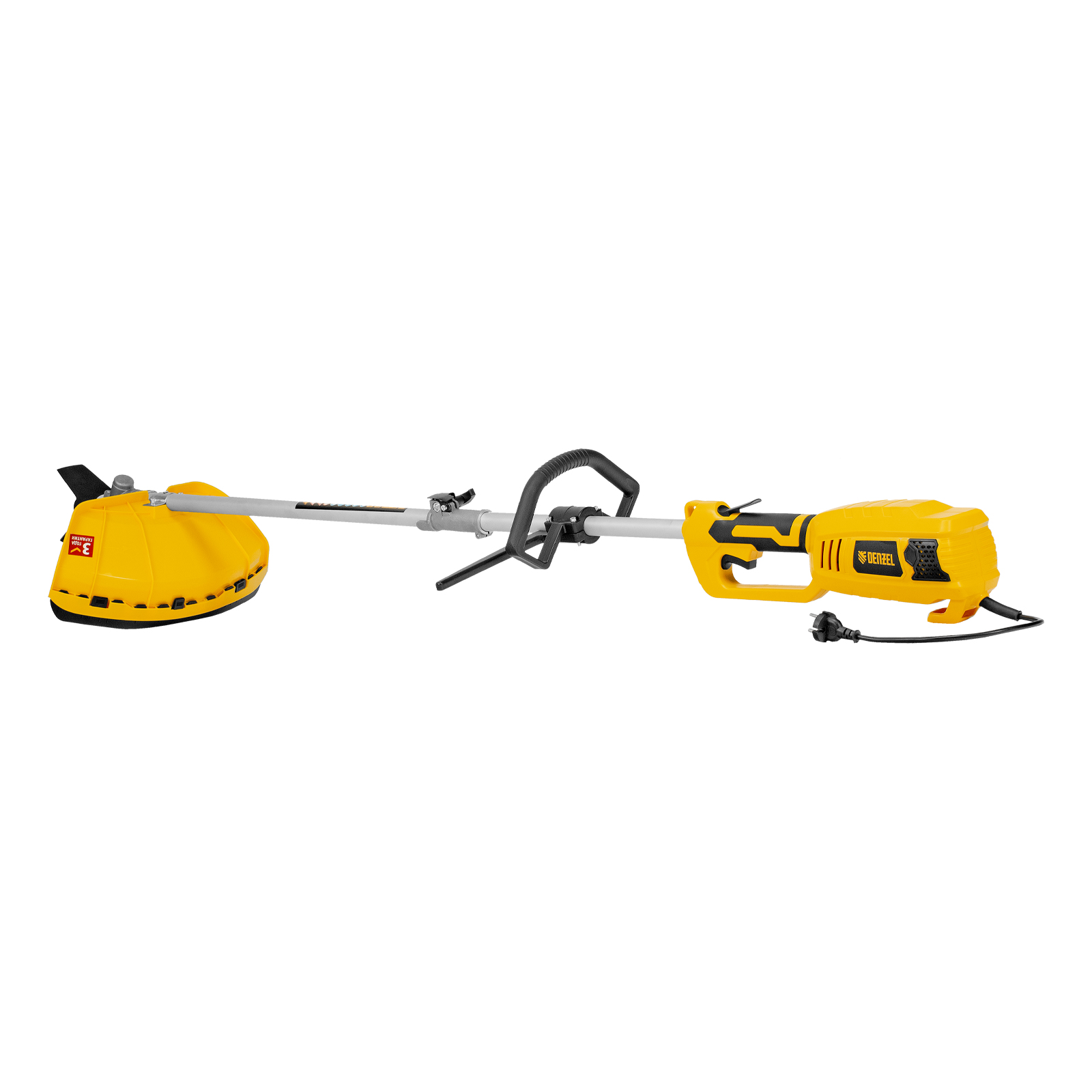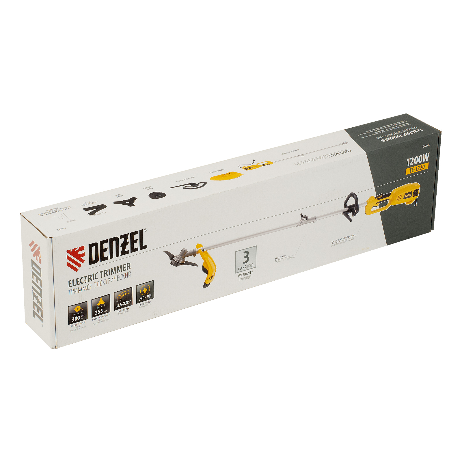 Электрический триммер Denzel TE-1220 96642 мощностью 1200 Вт, с разборной штангой, катушкой и диском, предназначен для скашивания травы различных типов, в том числе с жесткими стеблями: полыни, крапивы, лебеды. Мощный двигатель обеспечивает вращение катушки и диска со скоростью 7500 об/мин. Ширина скашивания за один проход составляет 38 см при использовании лески и 25,5 при использовании диска, что удобно для работы на небольших участках. Электродвигатель не требует приготовления топливной смеси и сложного технического обслуживания. Благодаря отсутствию вредных выбросов и неприятного запаха работа триммера не вредит здоровью и не вызывает дискомфорт.,Дополнительно к триммеру можно приобрести диск Denzel 96323 с шириной скашивания 230 мм для быстрого удаления растительности с жесткими стеблями, 96328 для скашивания молодых побегов кустарника диаметром до 3 мм, 96340 для срезания борщевика, кустарника и молодых побегов деревьев с диаметром стволов до 10 мм.