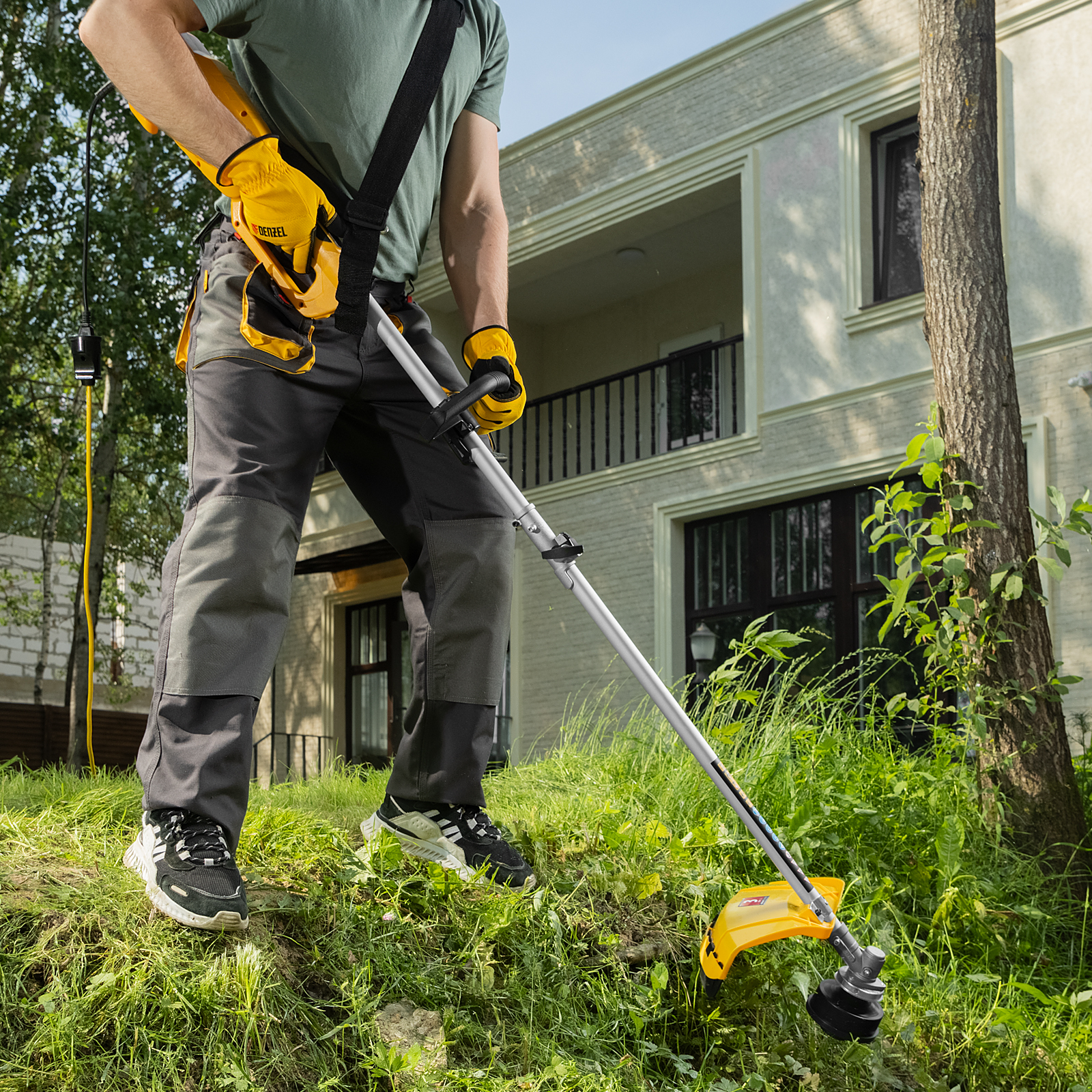 Снижение нагрузки на спину — наплечный ремень равномерно распределяет вес садового электротриммера, что уменьшает усталость при длительной работе.
